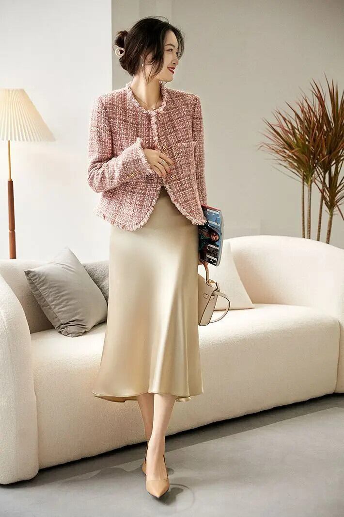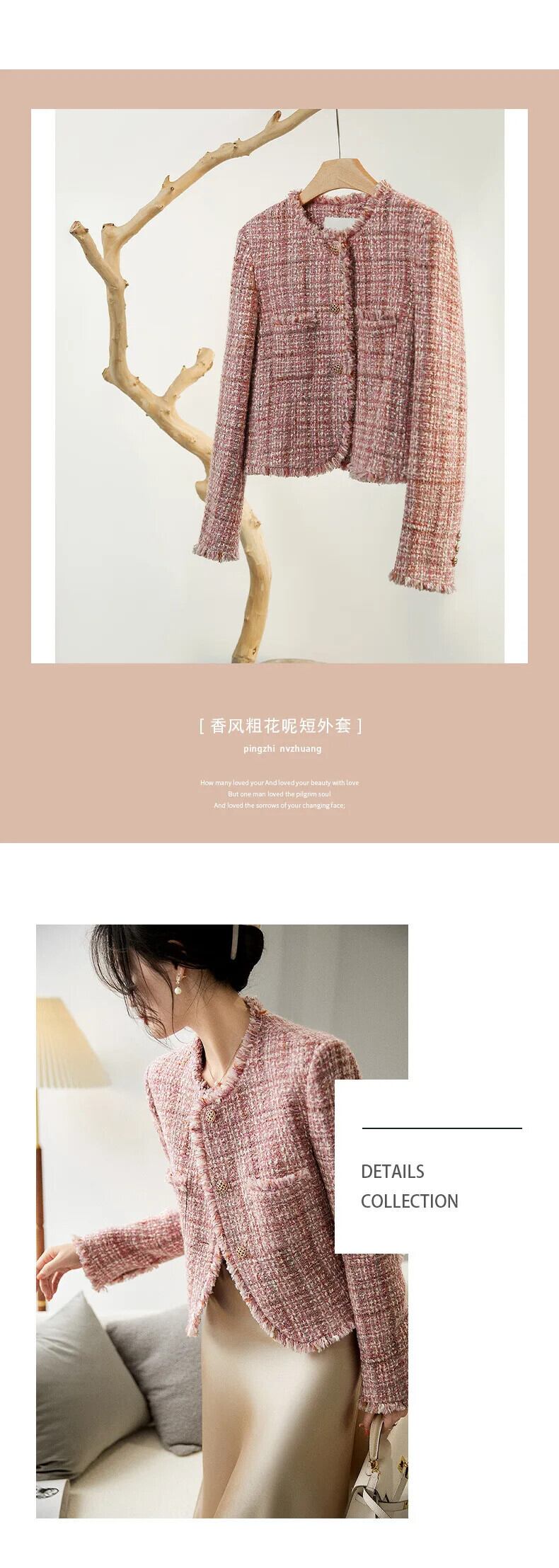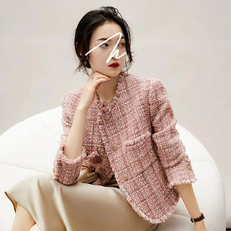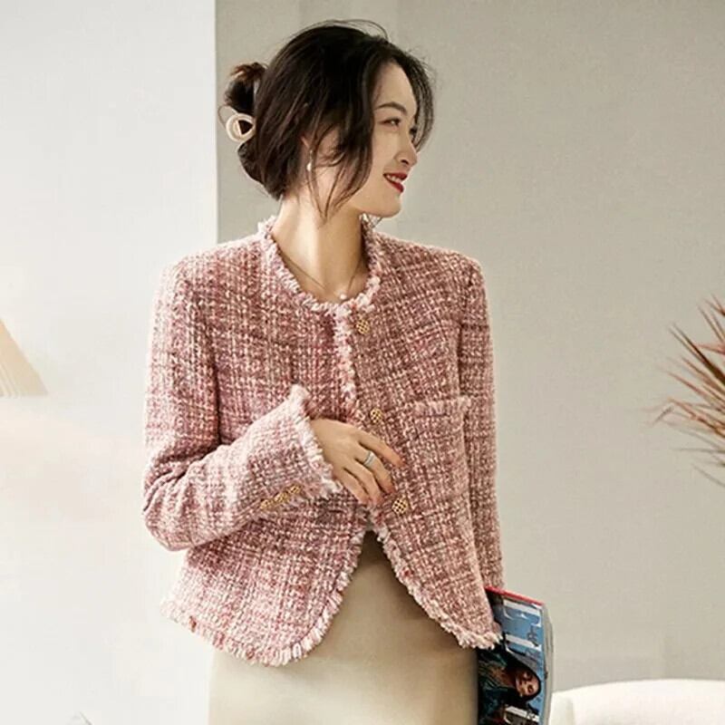 秋ガールクリック香りツイードショートジャケット長袖スリムフィットピンク OL ウールコート ロング