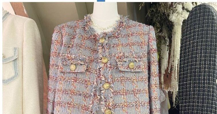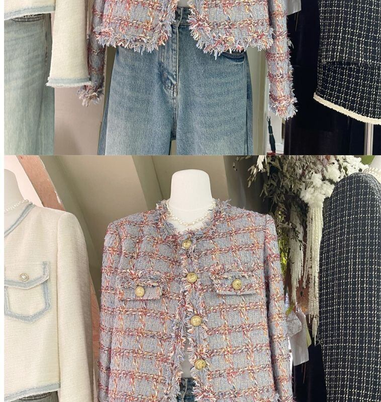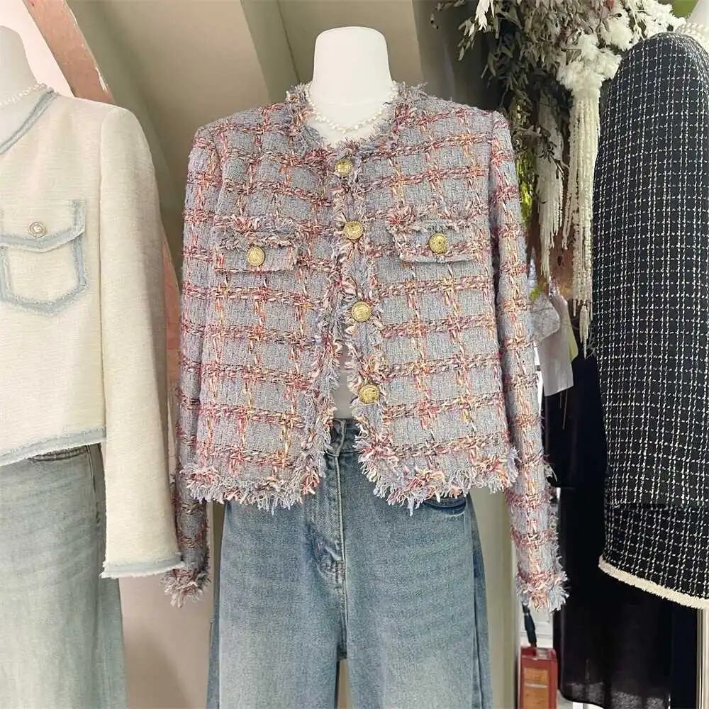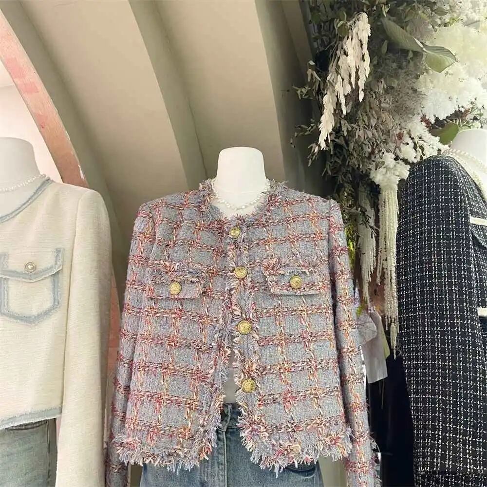 フレグランスツイードジャケット秋冬チェック柄織りショートコート オータム 秋物 ウィンター 冬物