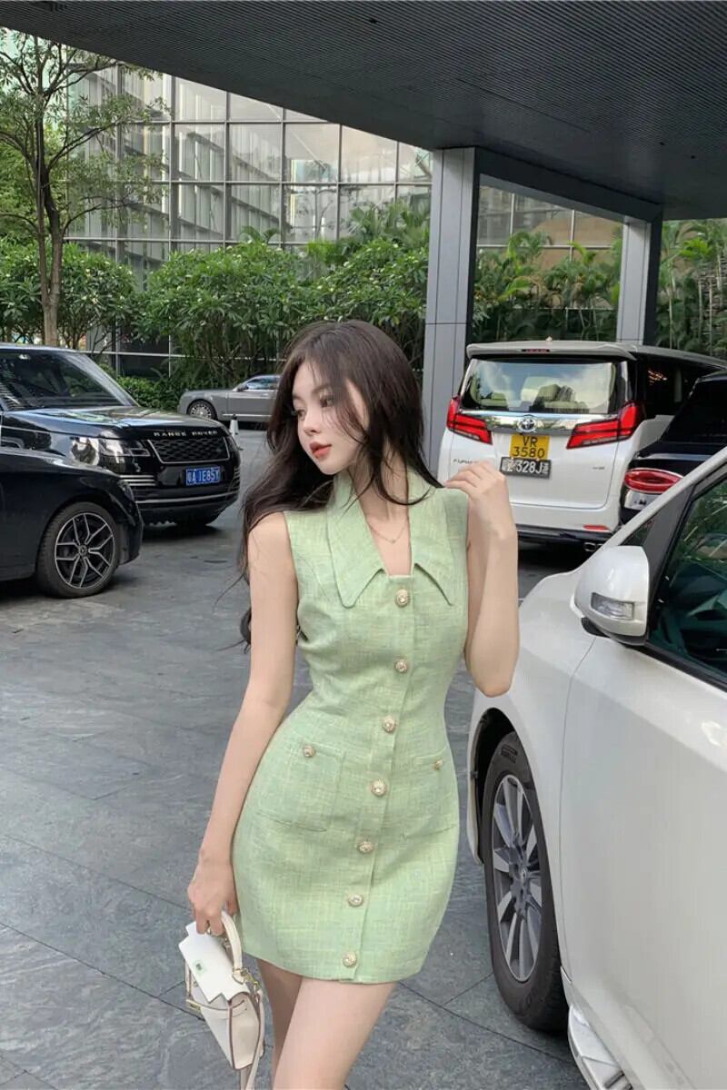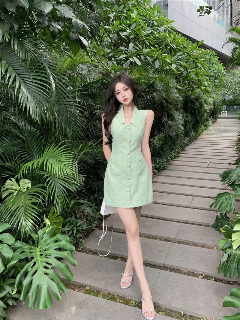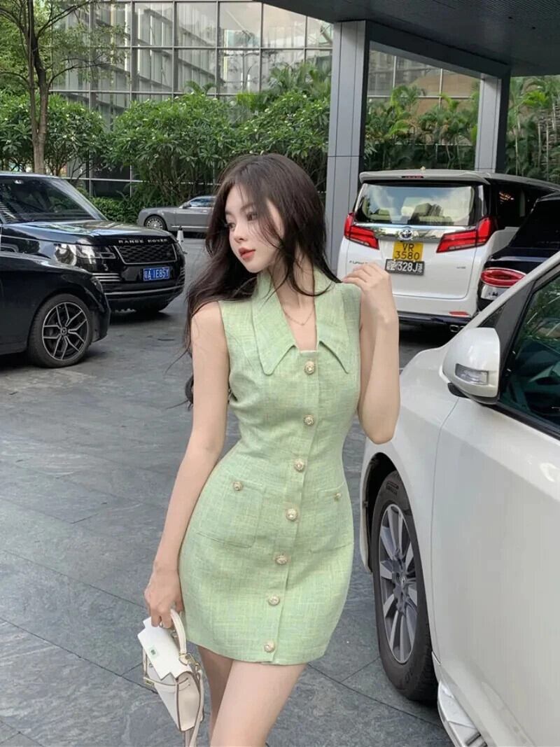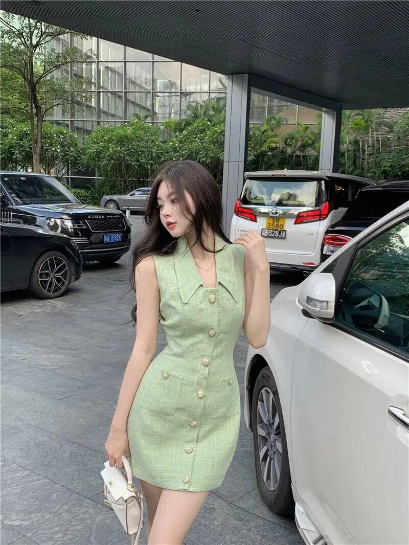 フレンチスリムフィットシングルブレストウエストレトロフレグランスノースリーブドレス Vestidos