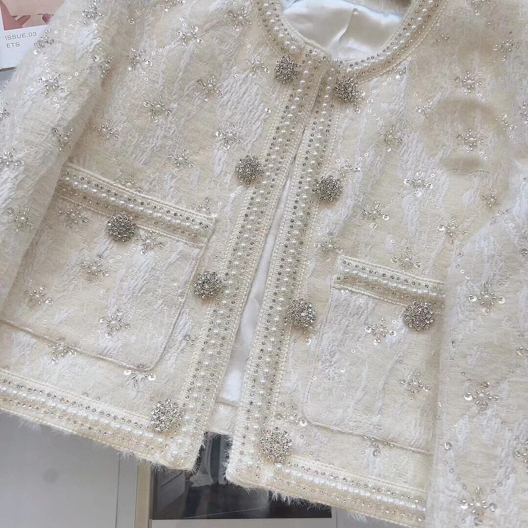 フレグランスホワイトジャケット秋冬フレンチショート生き抜く手作りネイルビーズストリートコート ウィンター 冬物