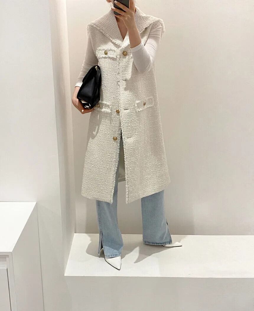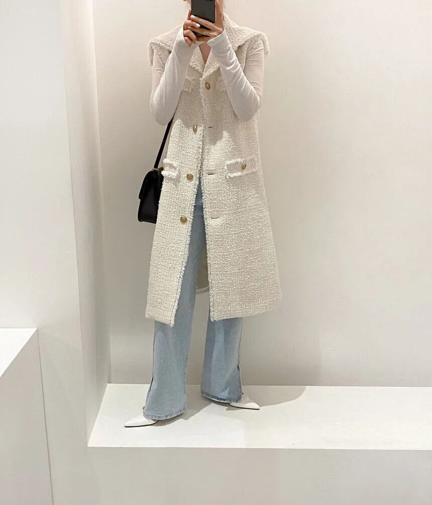 チョッキシック秋気質香りネイビー襟テルファーエッジポケットロングツイードベストレディース オータム 秋物