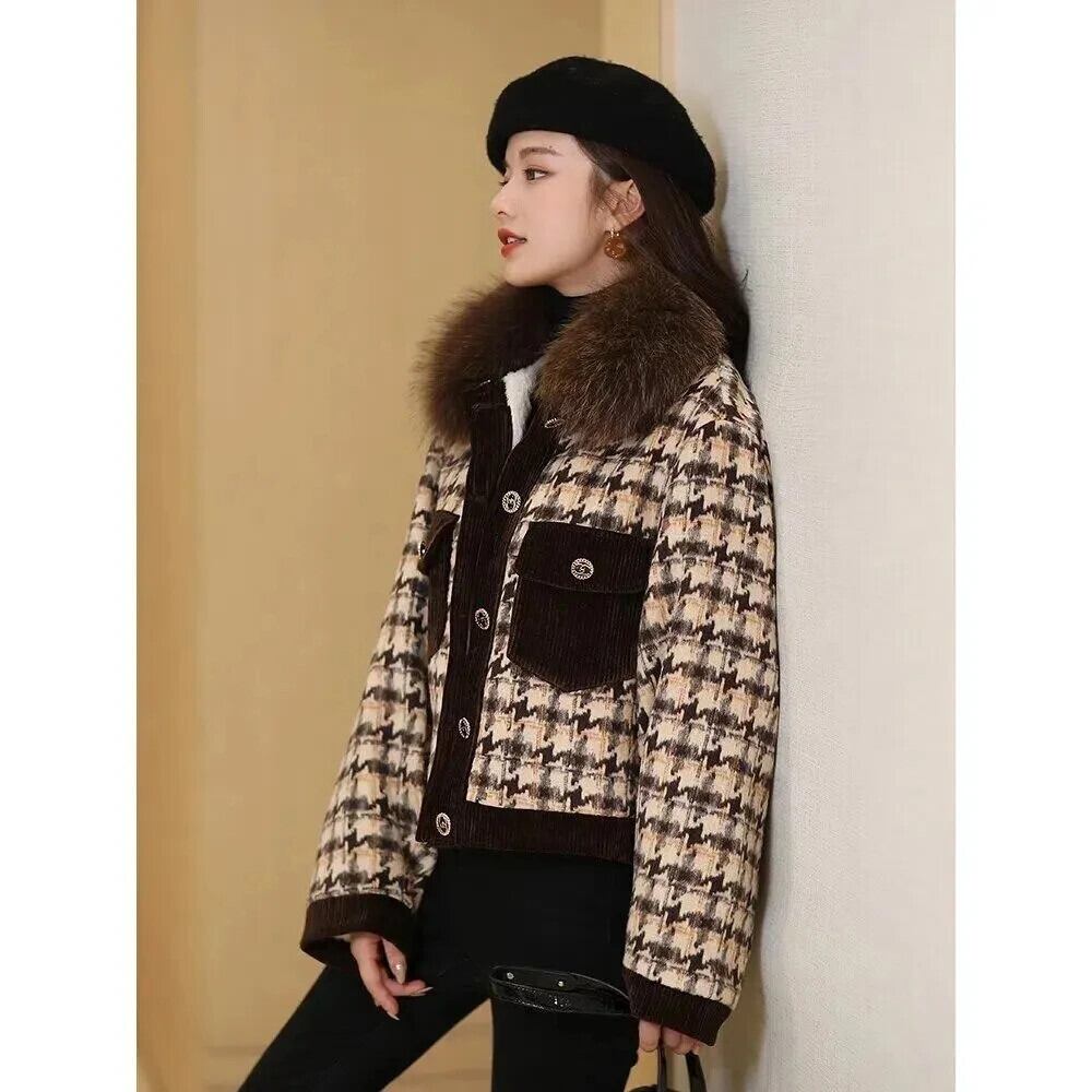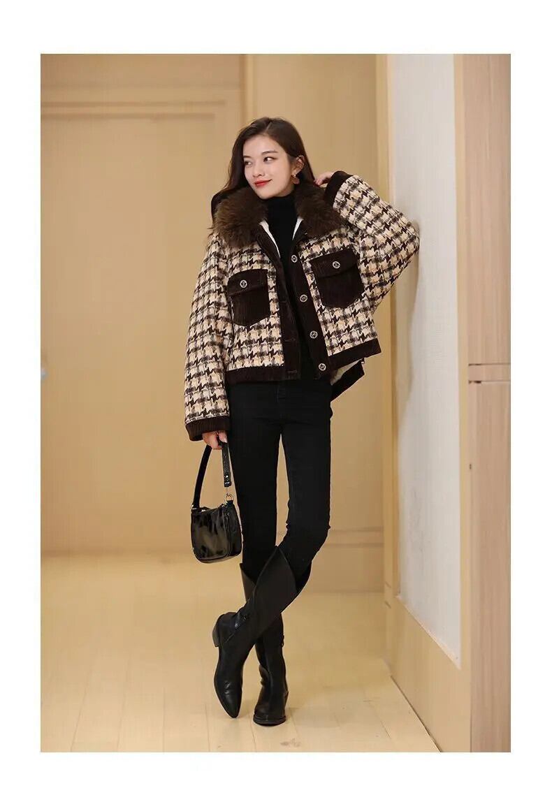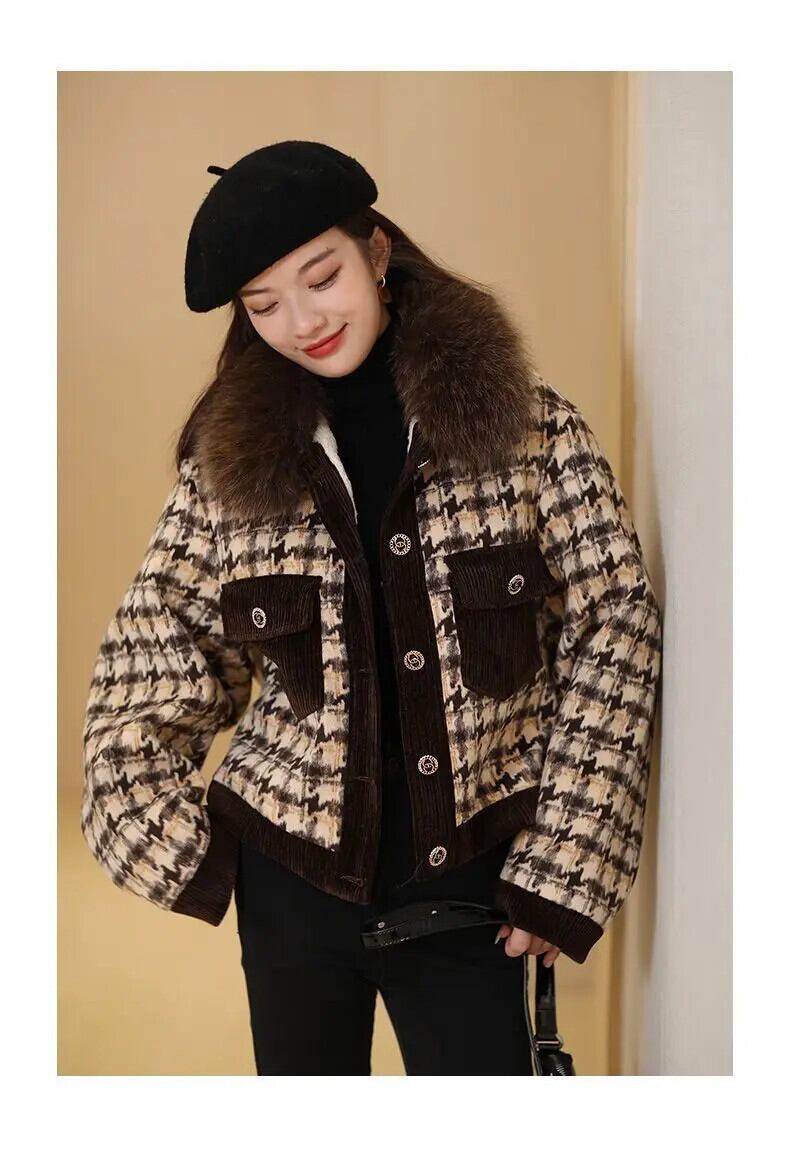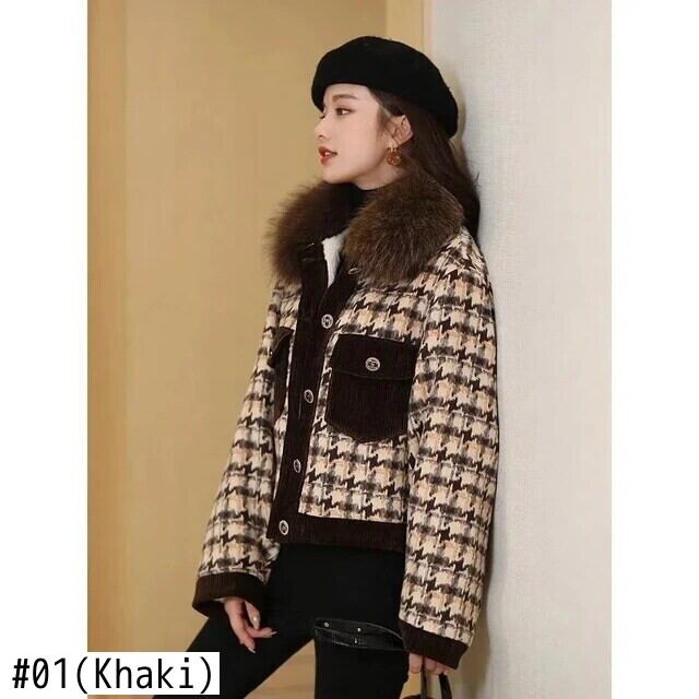 秋冬ウールコート毛皮襟肥厚ショートチェック柄ウールジャケットアウターストリート オータム 秋物 ウィンター 冬物