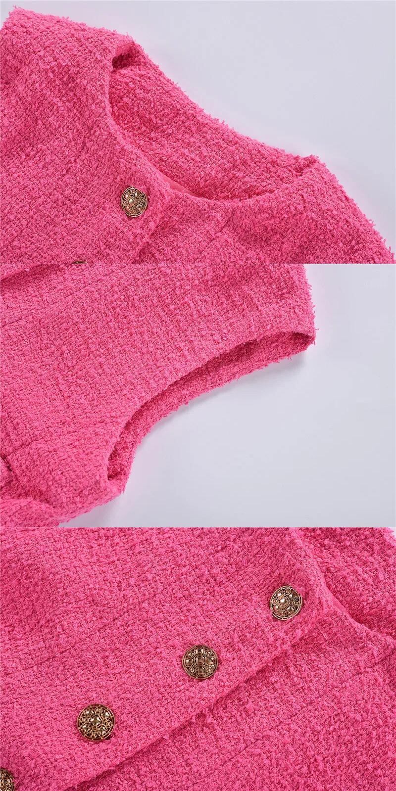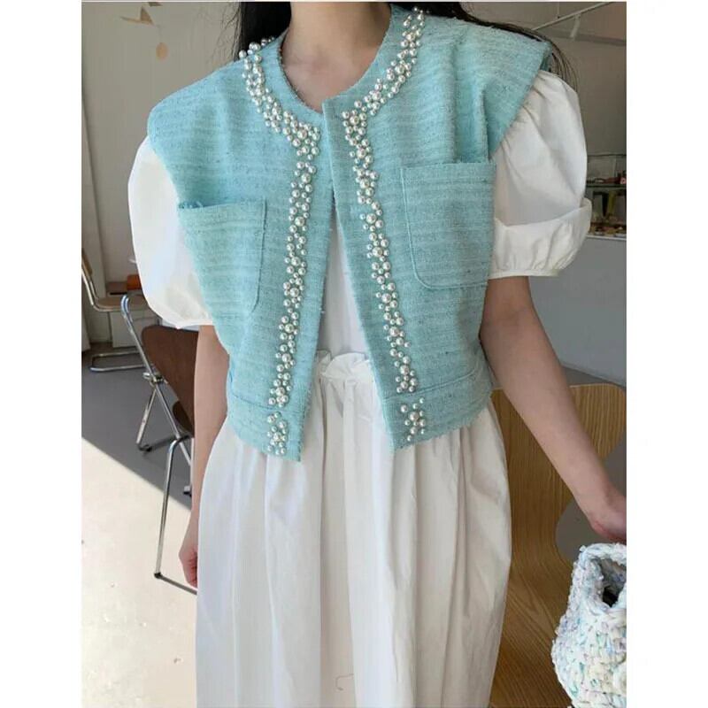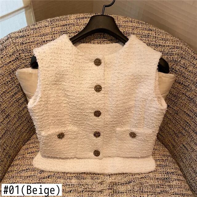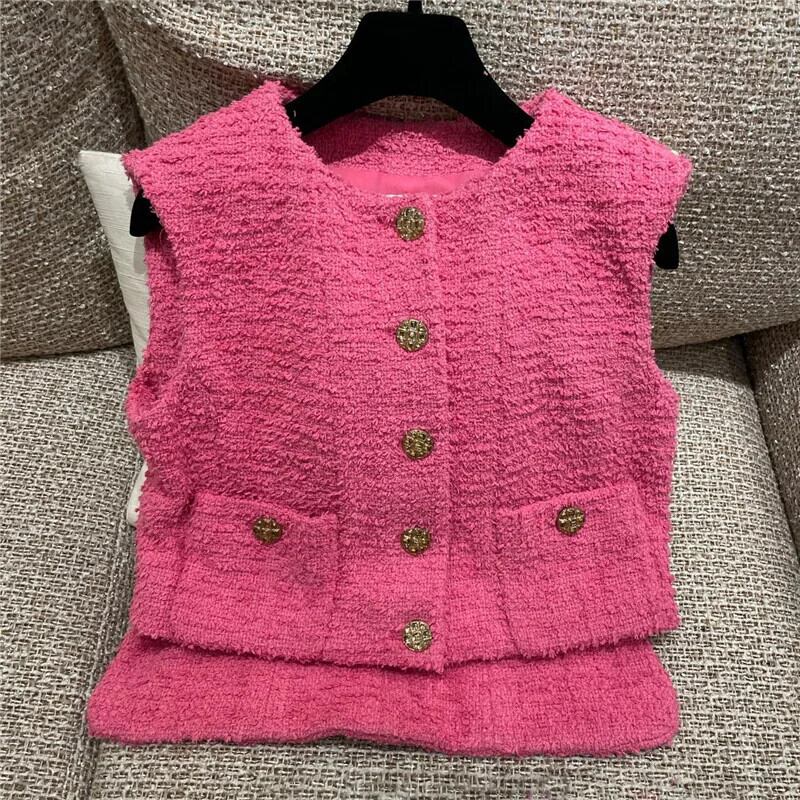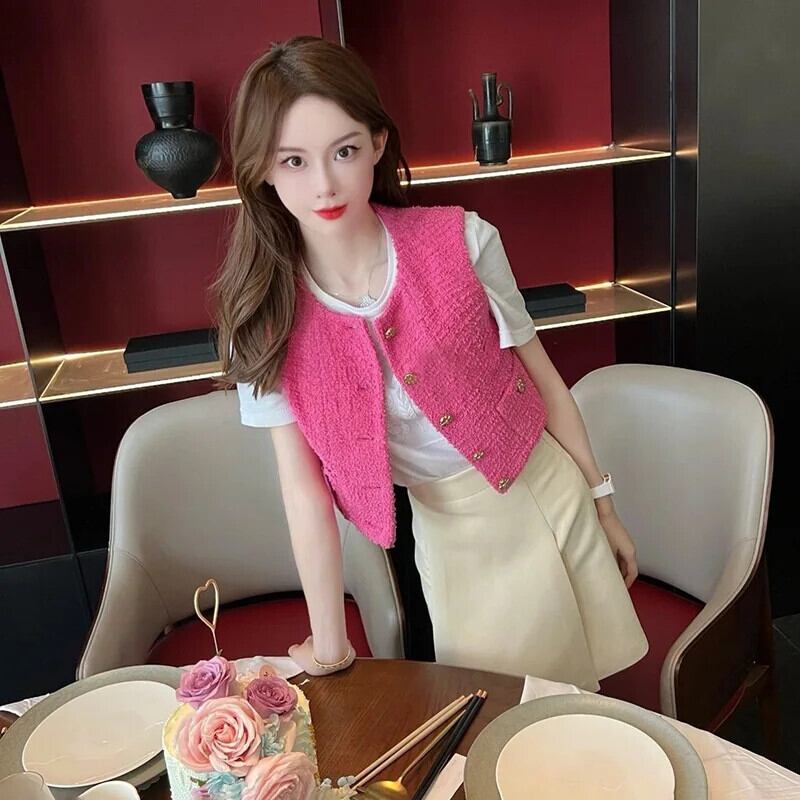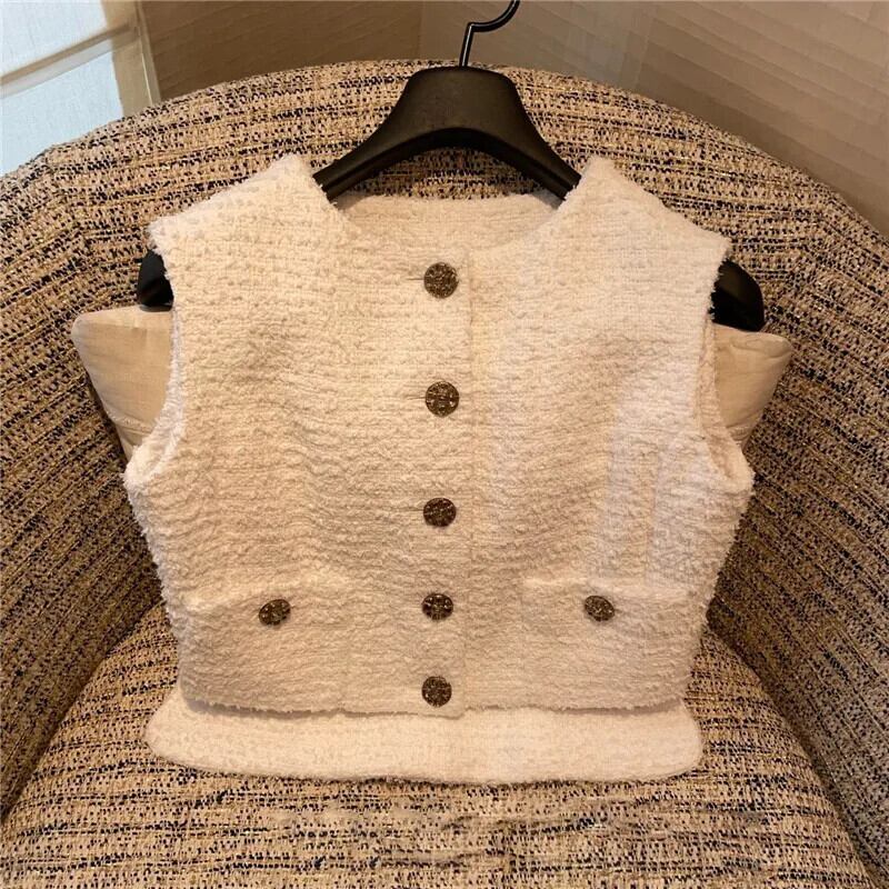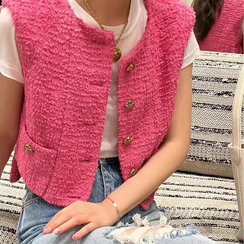 春夏ツイードノースリーブ香りベストニットセーターショートシングルブレストチョッキ スプリング 春物 サマー 夏物