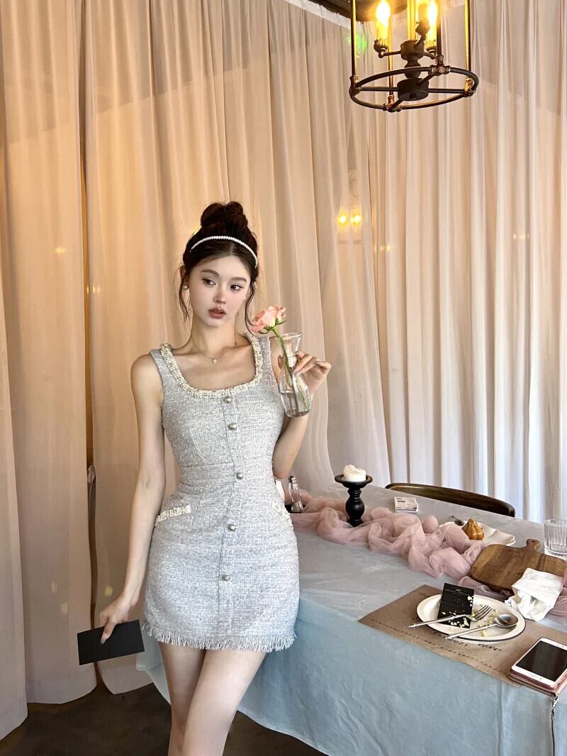 夏ビーズスクエアネック気質ツイードパーティーストラップドレス サマー 夏物 スクウェア