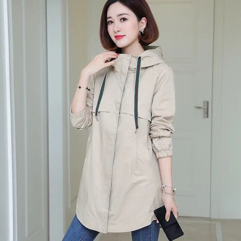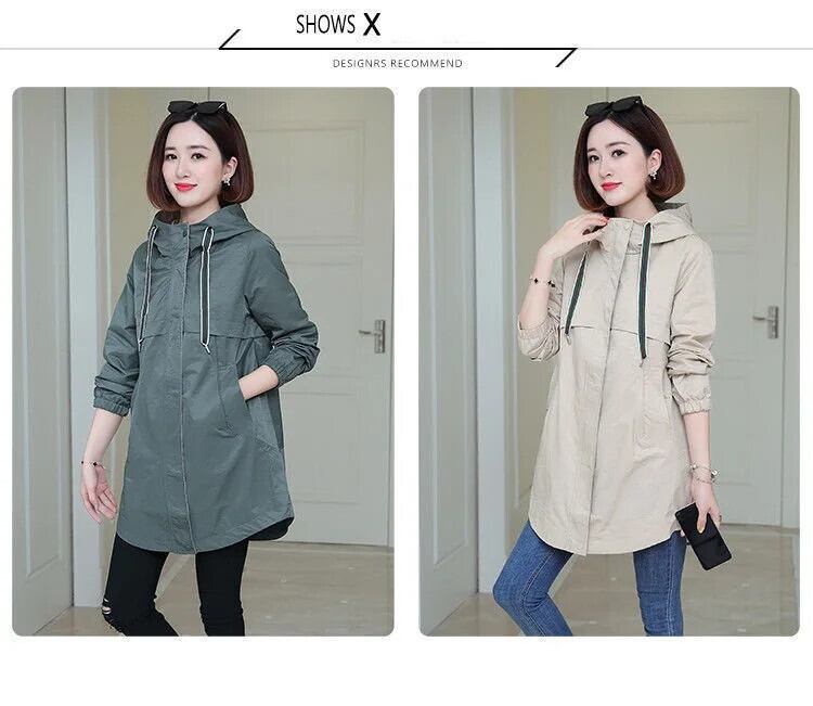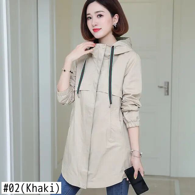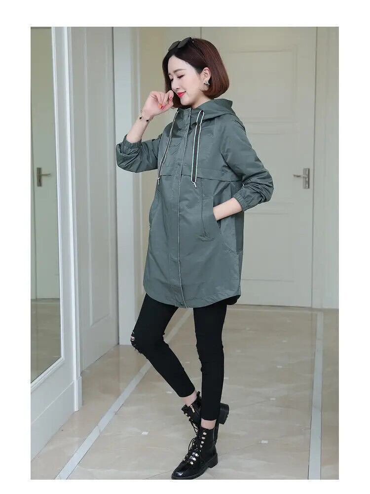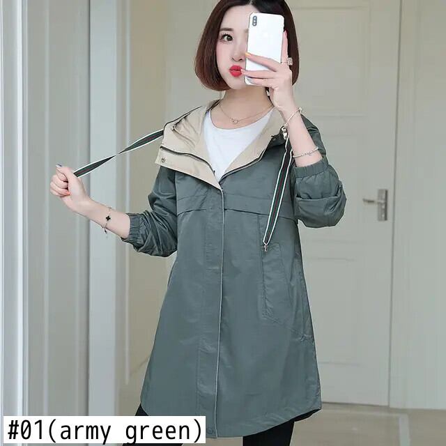 春秋ルーズコートソリッドフード付きダークグリーンウインドブレーカーレディースミッドレングストレンチ スプリング 春物 オータム 秋物 ソリッドカラー