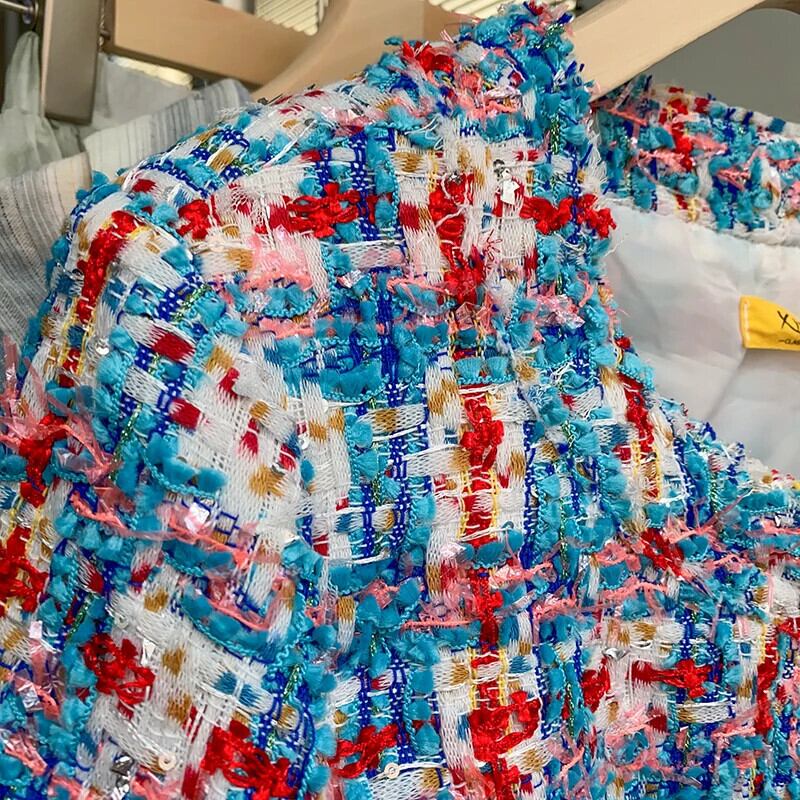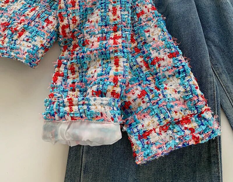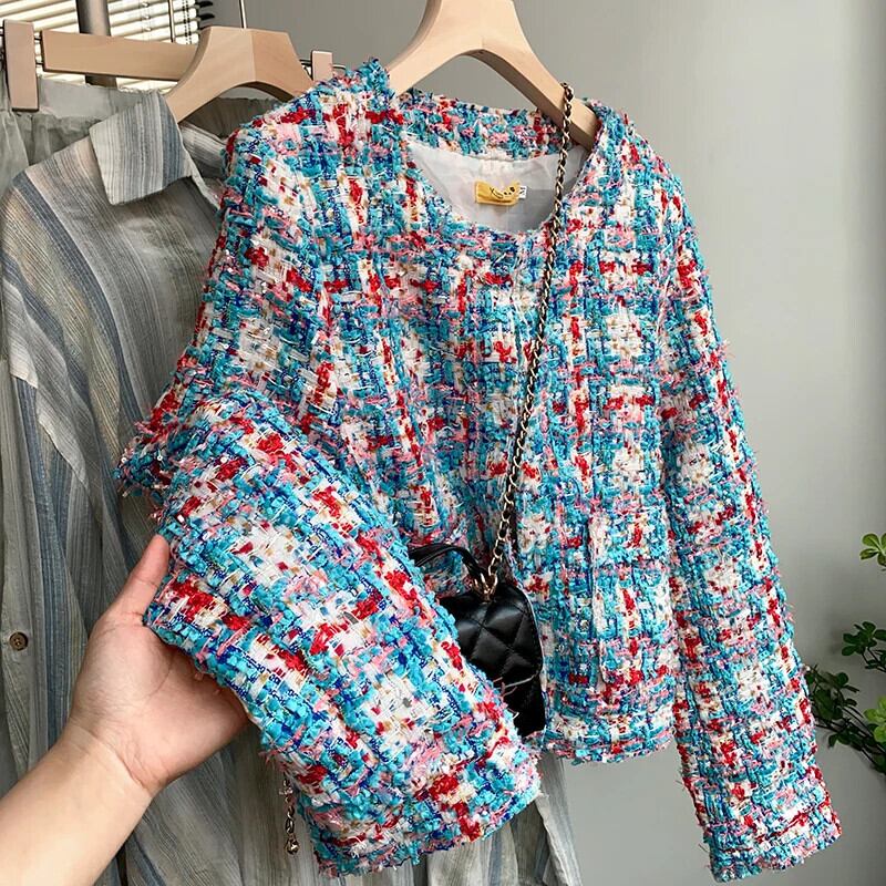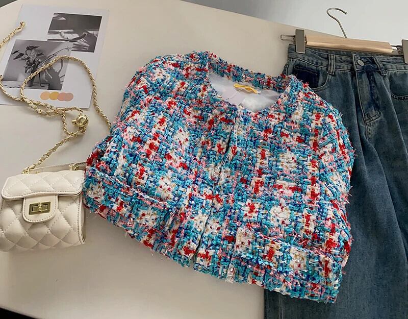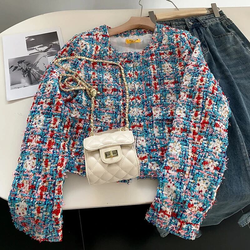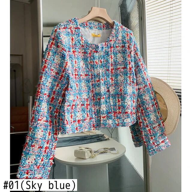 粗いパターンチェック柄長袖ショート ジャケット ツイード コート アウター ロング