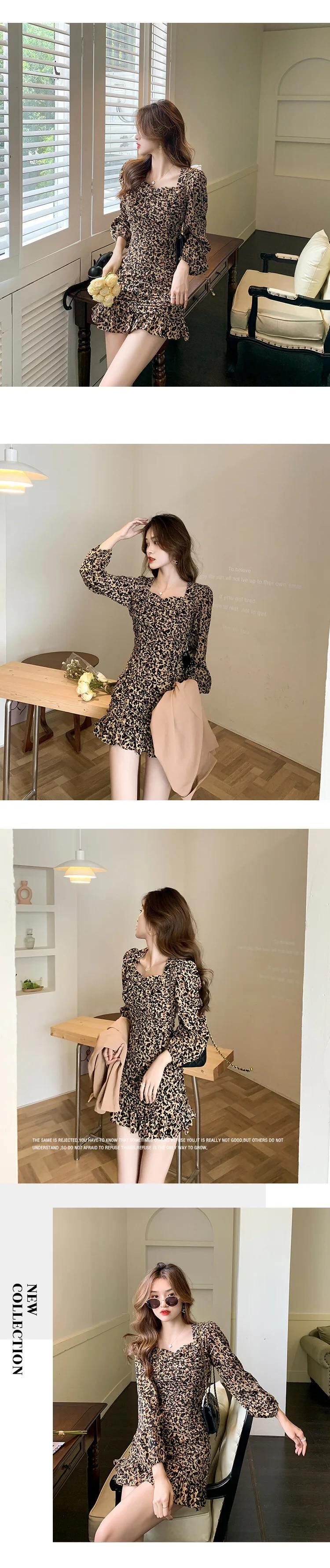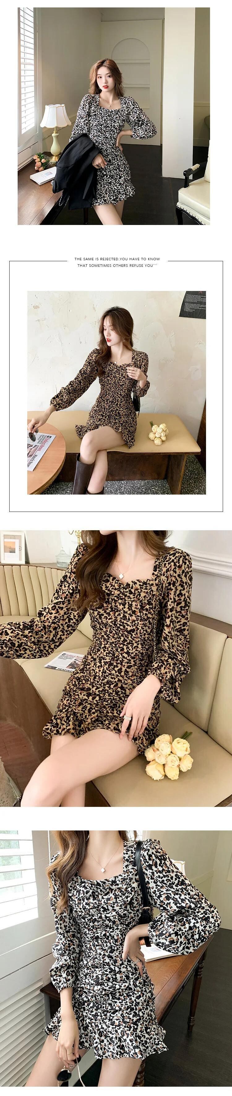 春レディースフレンチレトロシックスクエアカラーヒョウ柄花柄長袖ドレス ロング スプリング 春物 スクウェア