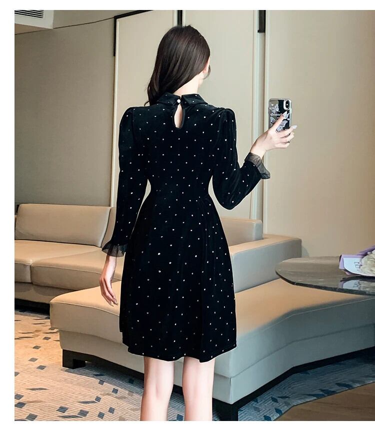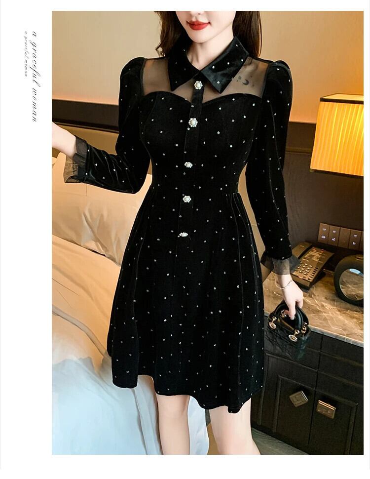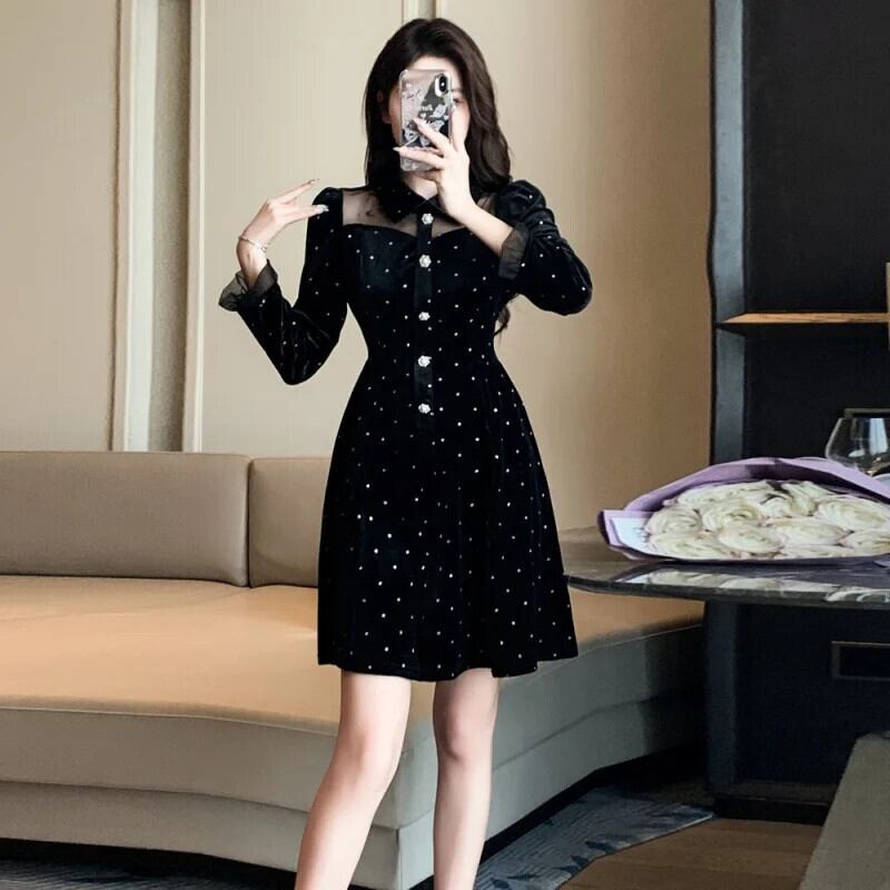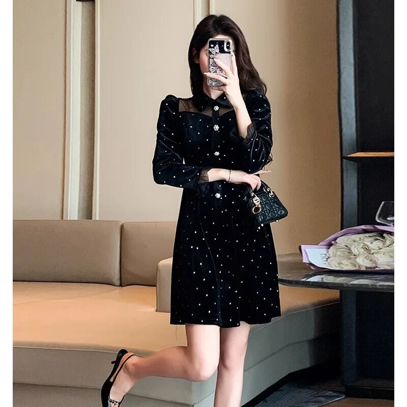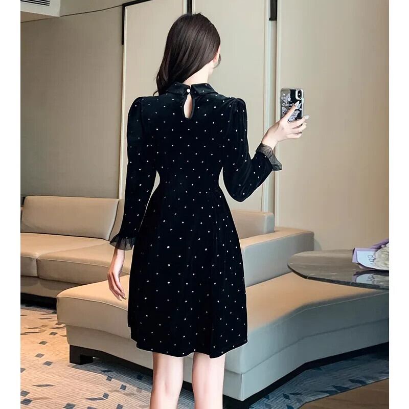 2024 ギャザリングフルスカイスターベルベットスタイルスリムフィット黒長袖ドレスレトロ ロング ブラック