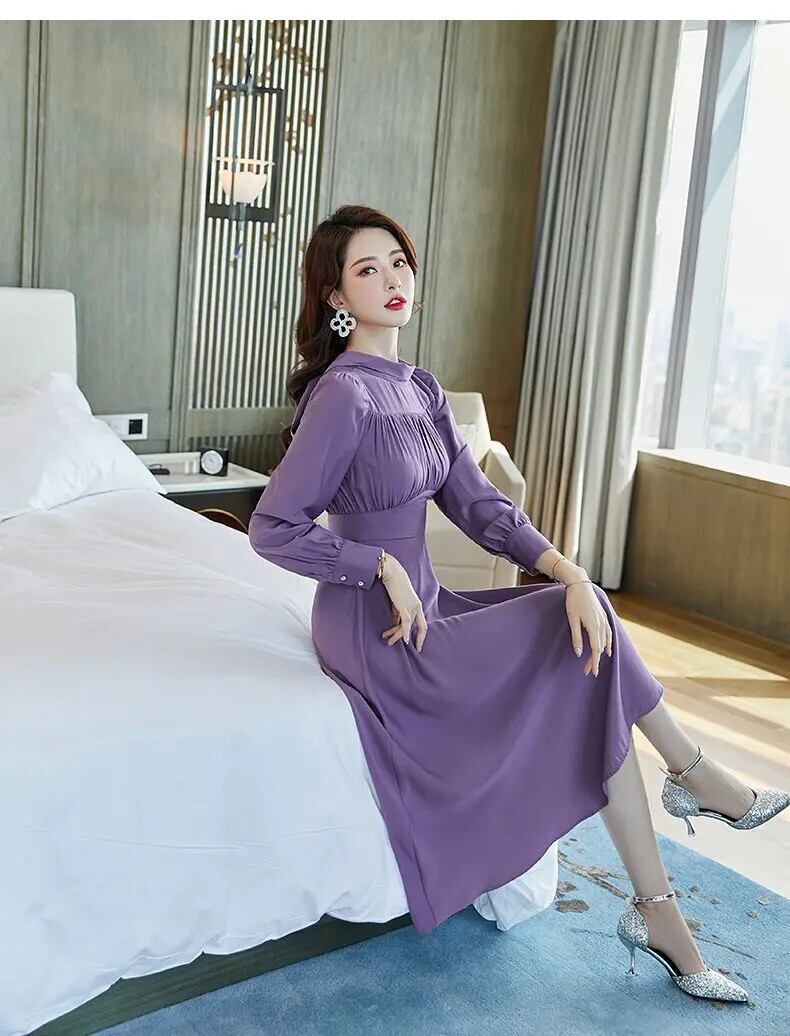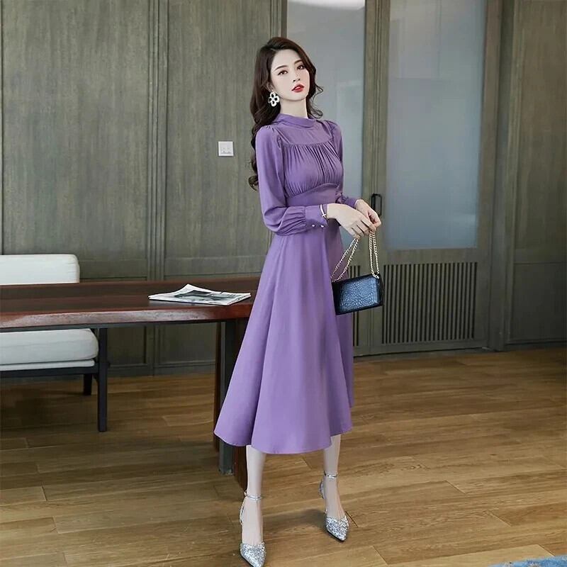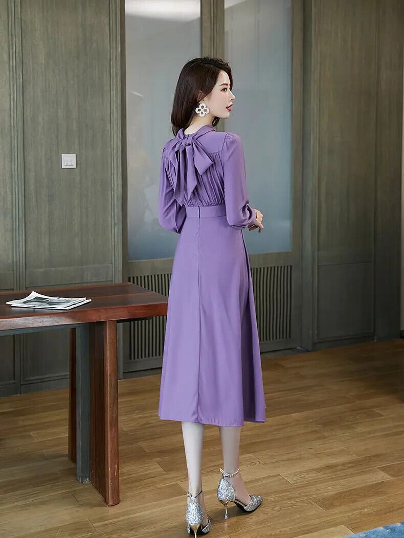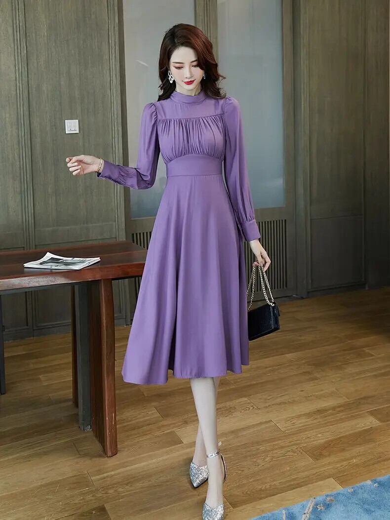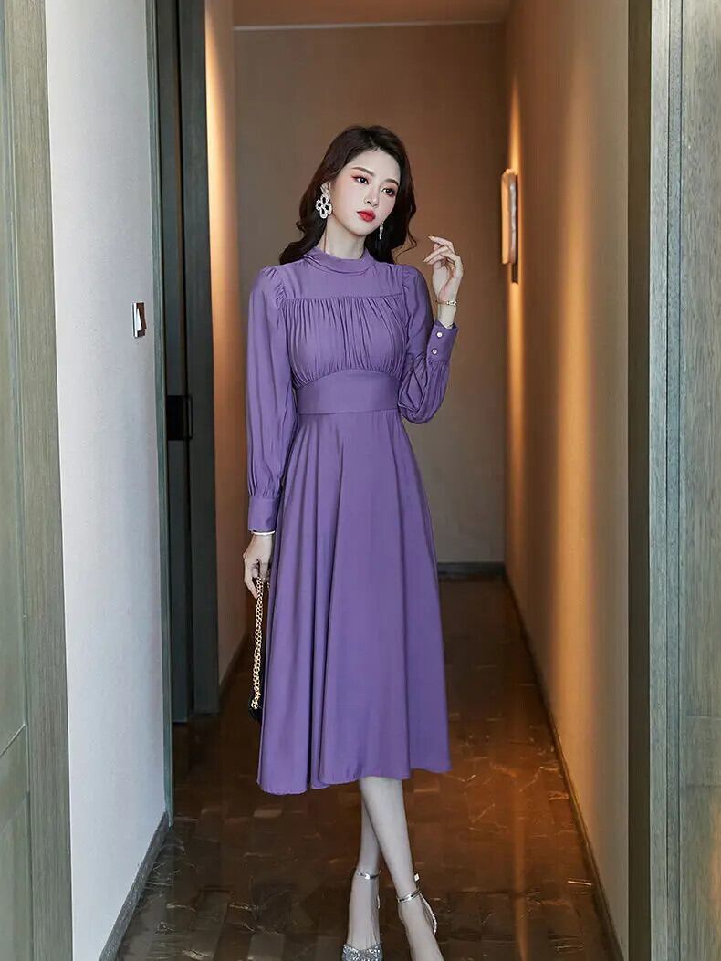 春高貴ラウンドネックスリムフィットパープルドレス長袖 ロング スプリング 春物 Oネック