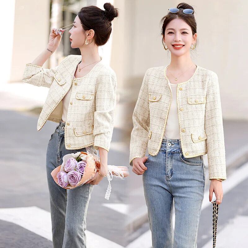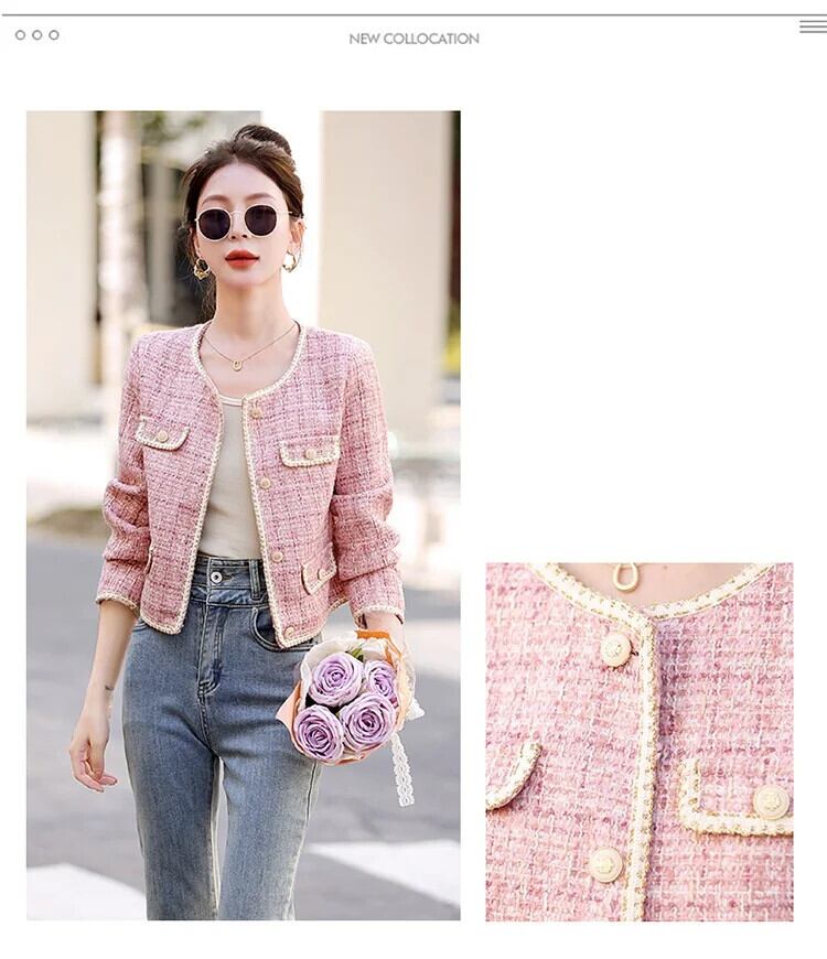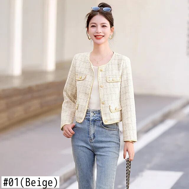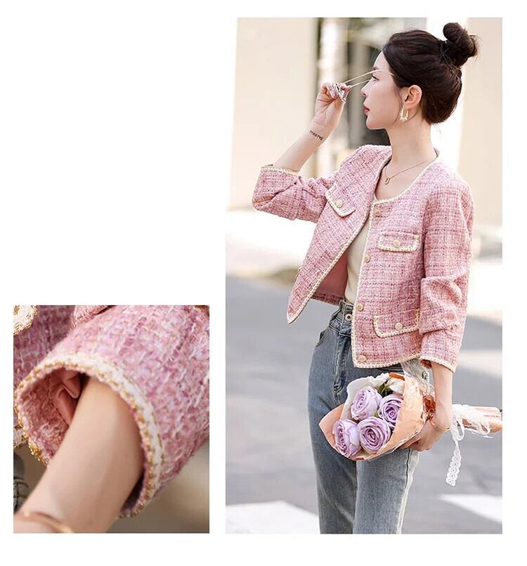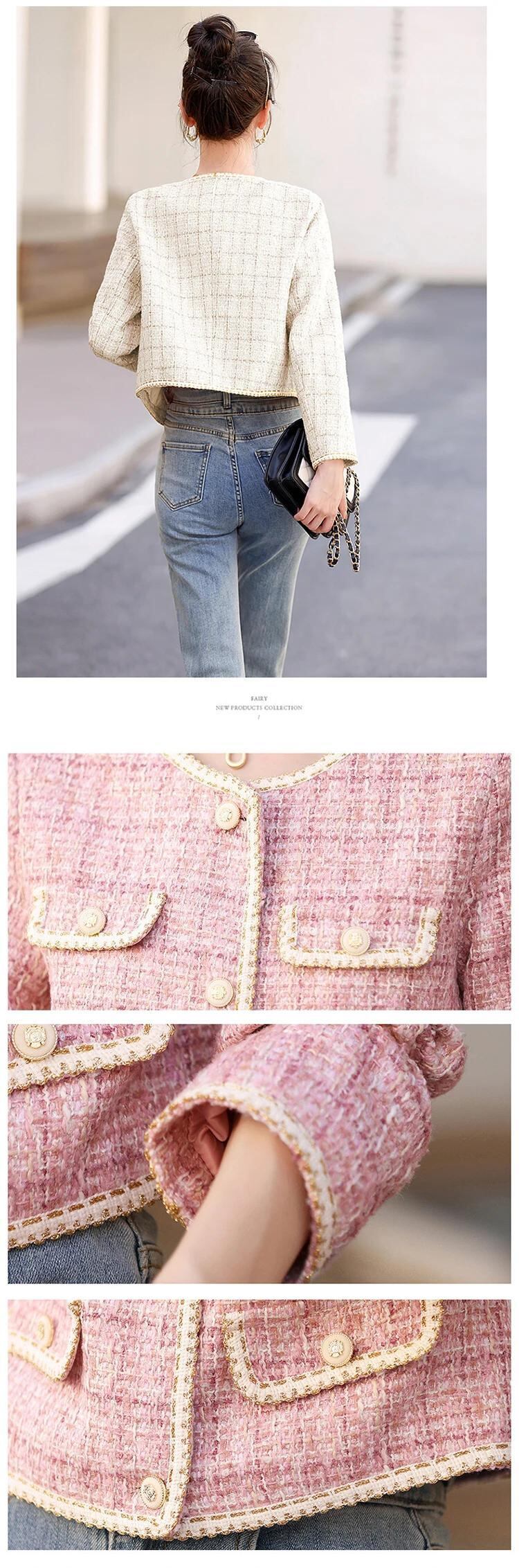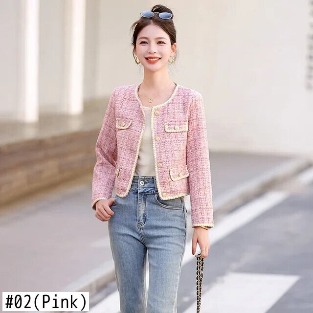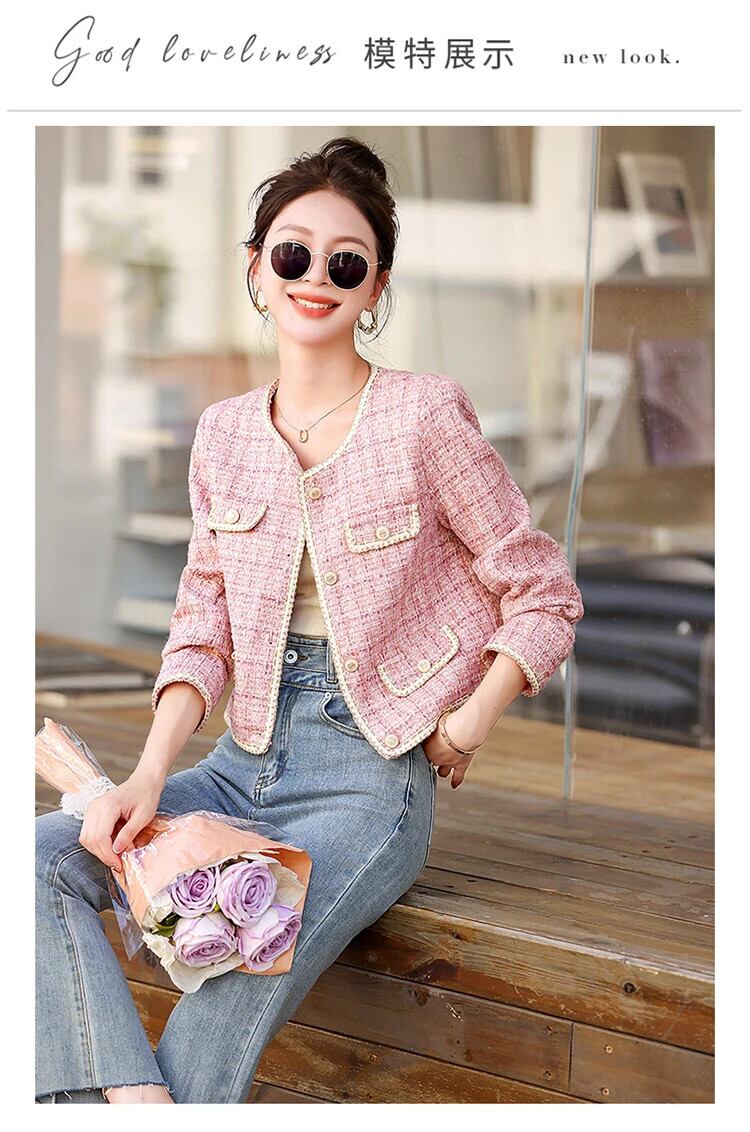 春秋ショートスタイル気質ピンクベージュ香りよいコートラウンドネックツイードジャケット スプリング 春物 オータム 秋物 Oネック
