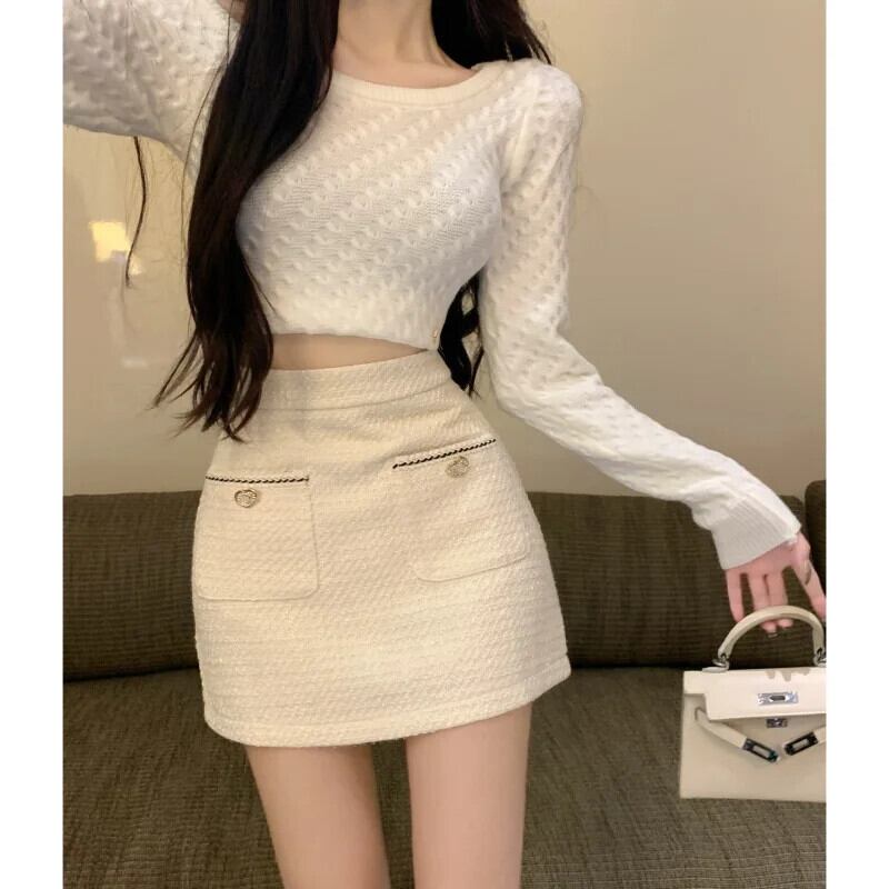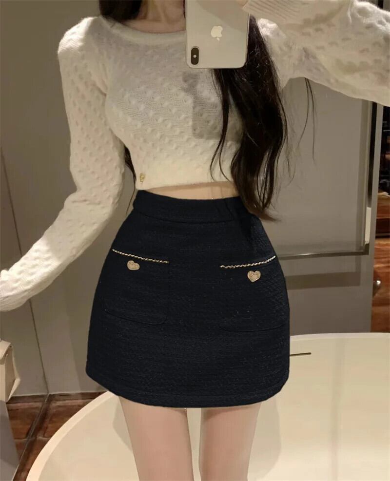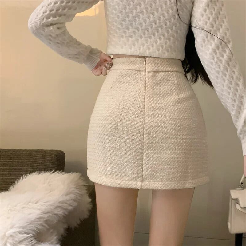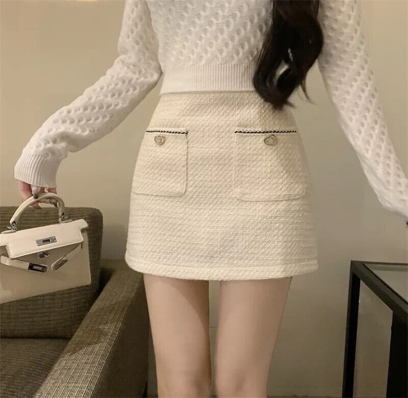レディース秋冬ウエスト万能香り風粗ツイード白黒Aラインハーフスカート ホワイト ブラック オータム 秋物 ウィンター 冬物