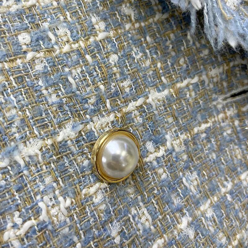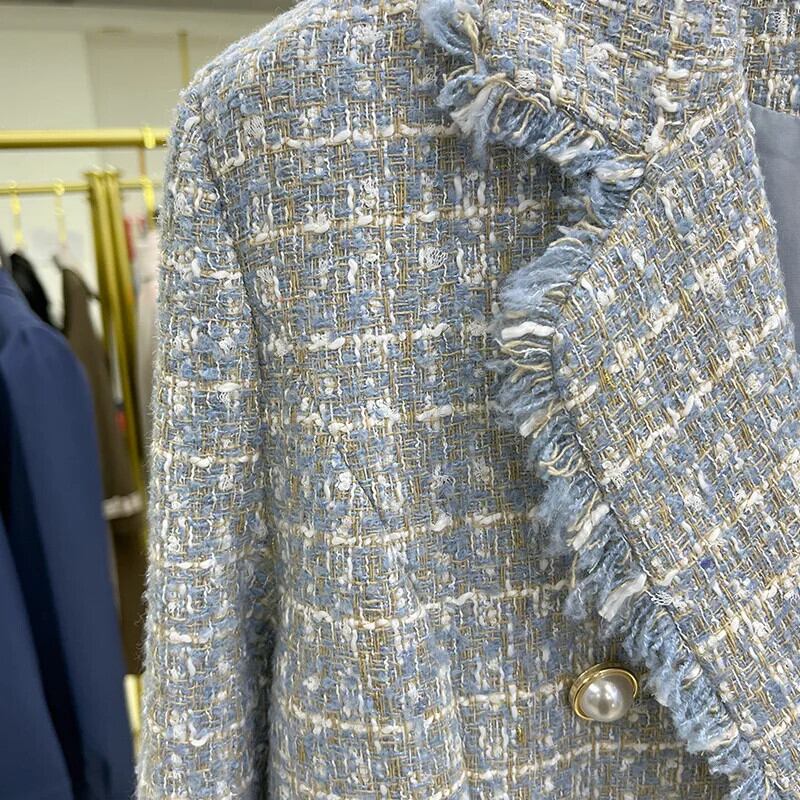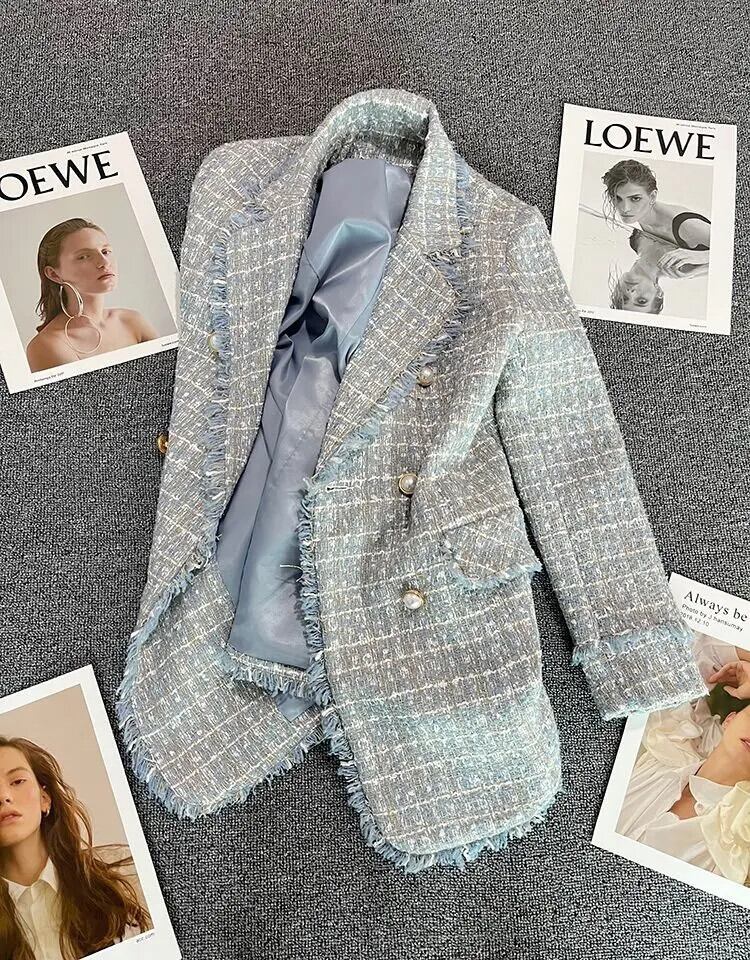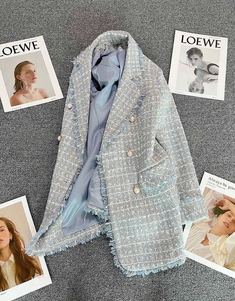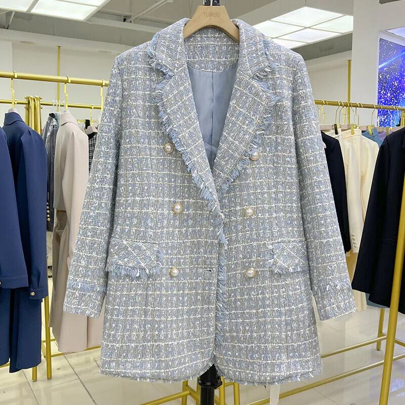 ブルーツイードブレザージャケットオフィスレディチェック柄ダブルブレストボタンアップコートガールズストリート 会社 学校 通勤や通学にも
