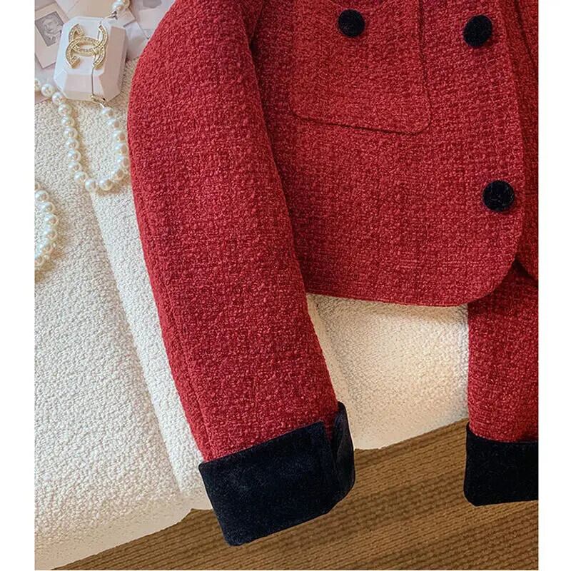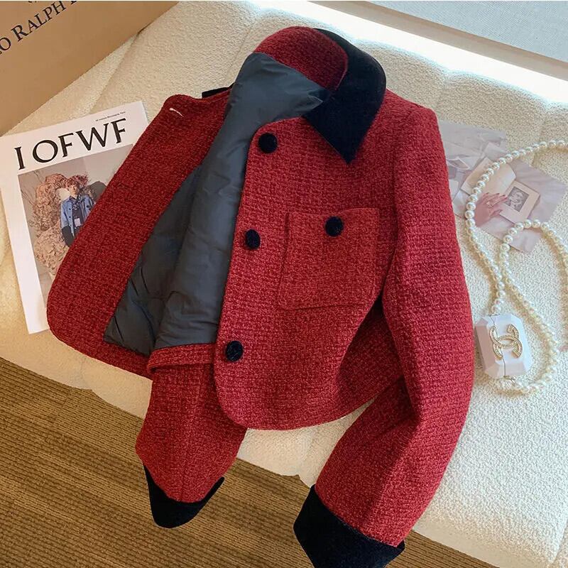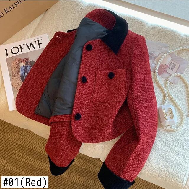 フレグラント レッド ショート スーツ コート レディース 春 ラペル ポケット スリム ブレザー スプリング 春物