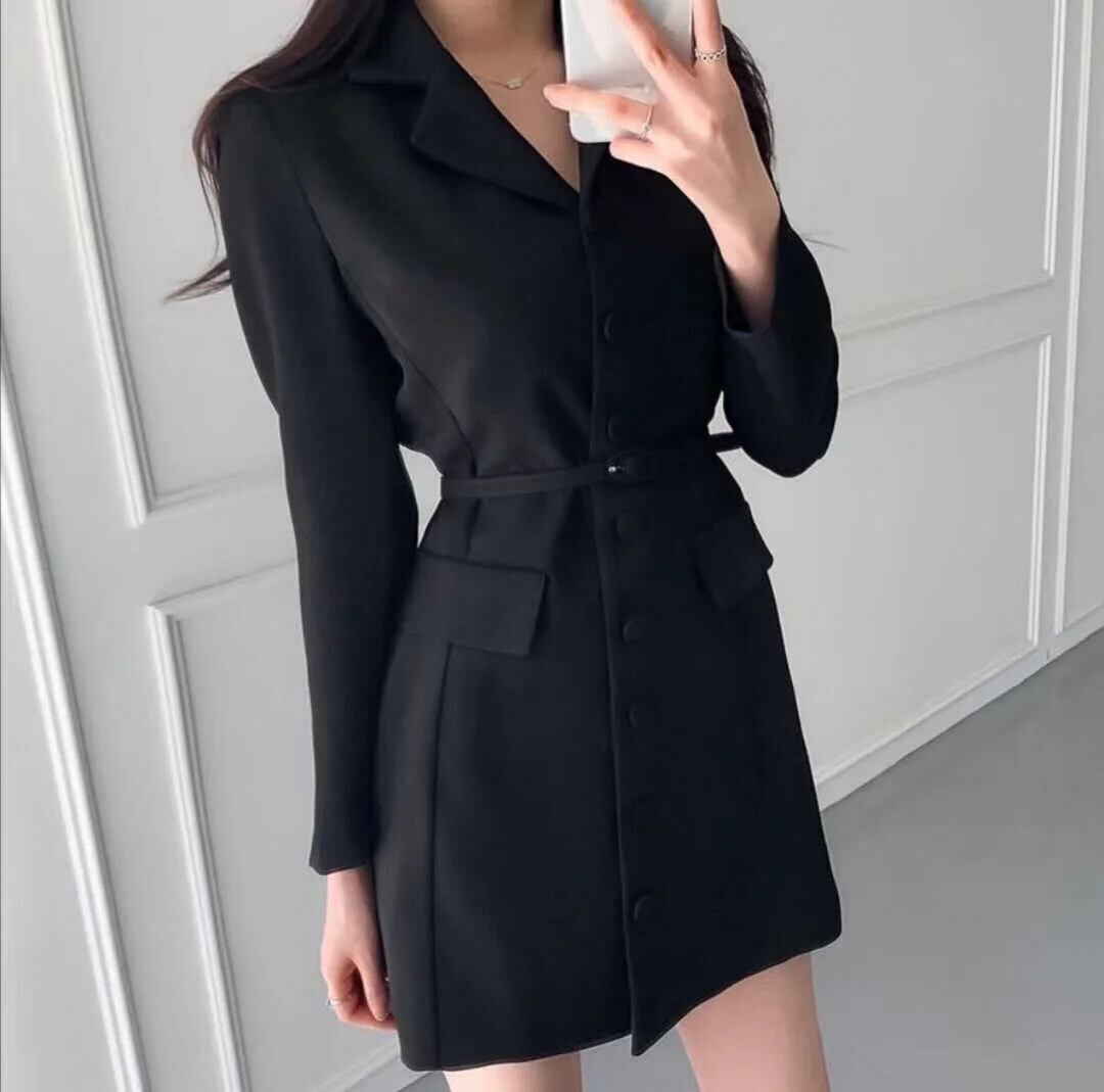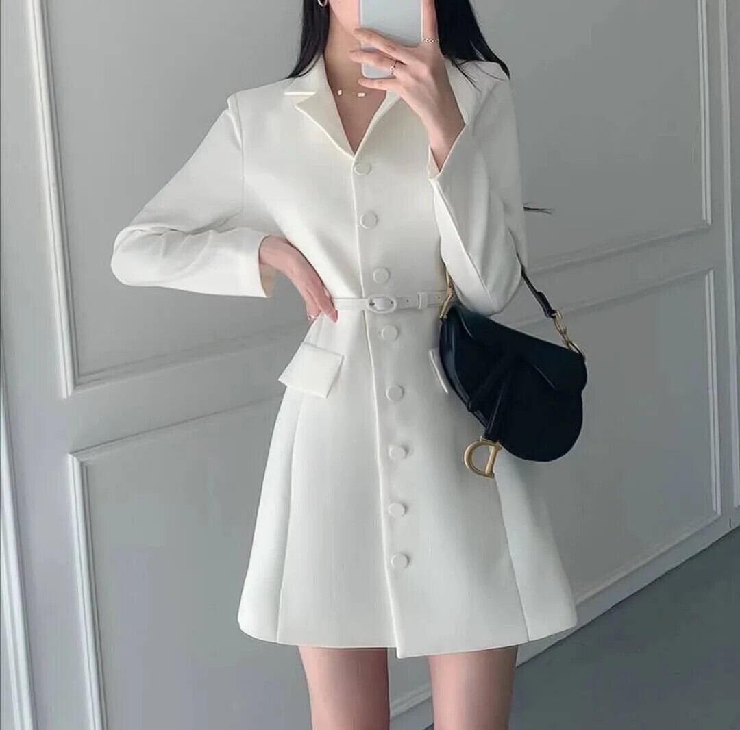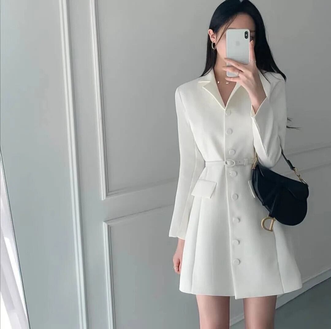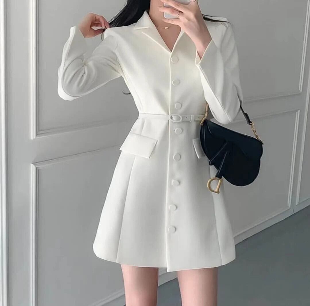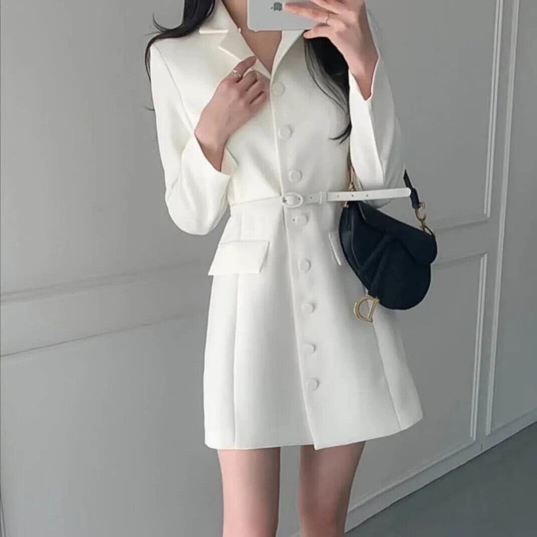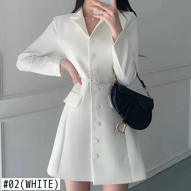 春秋ブラックホワイトターンカラーシングルブレストベルトウエストラップ長袖スーツドレス ロング スプリング 春物 オータム 秋物 ハーネス