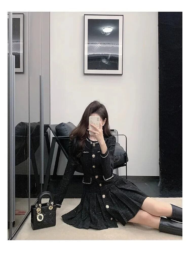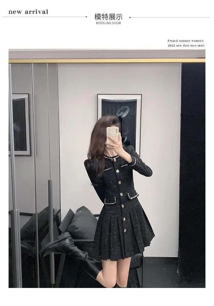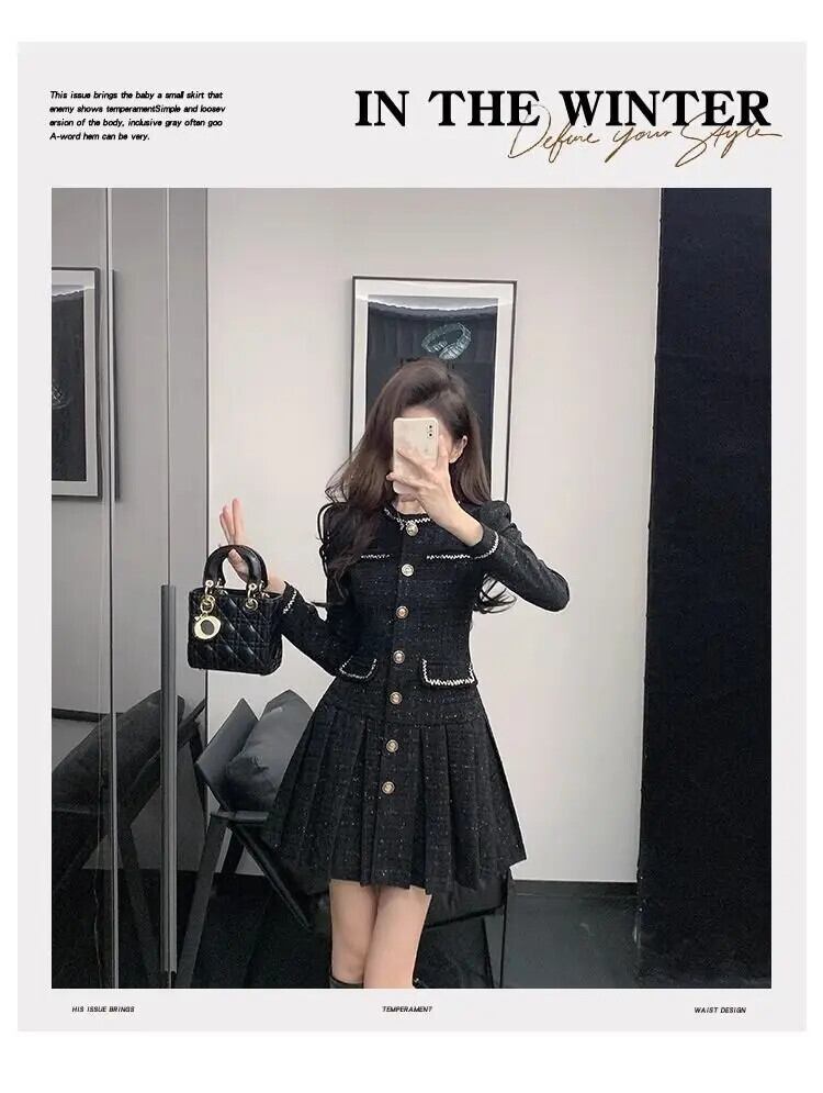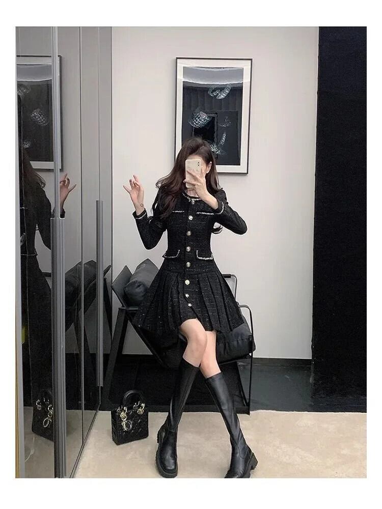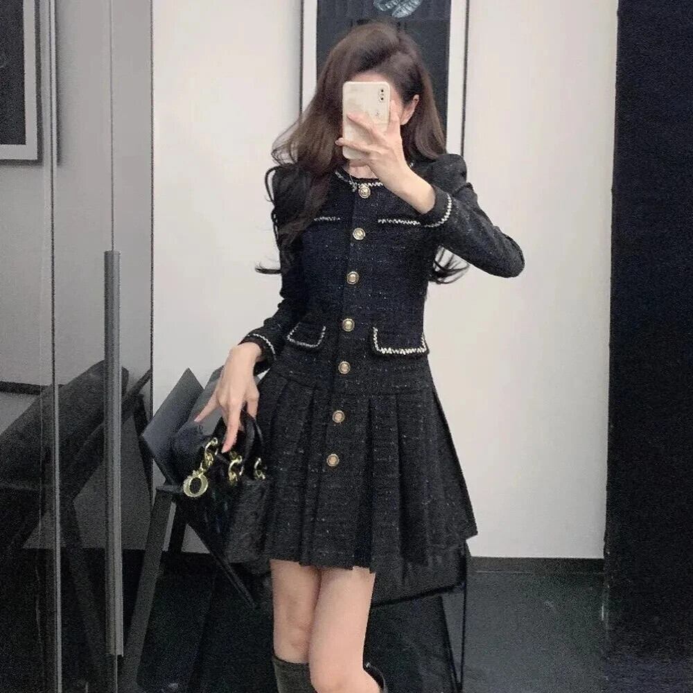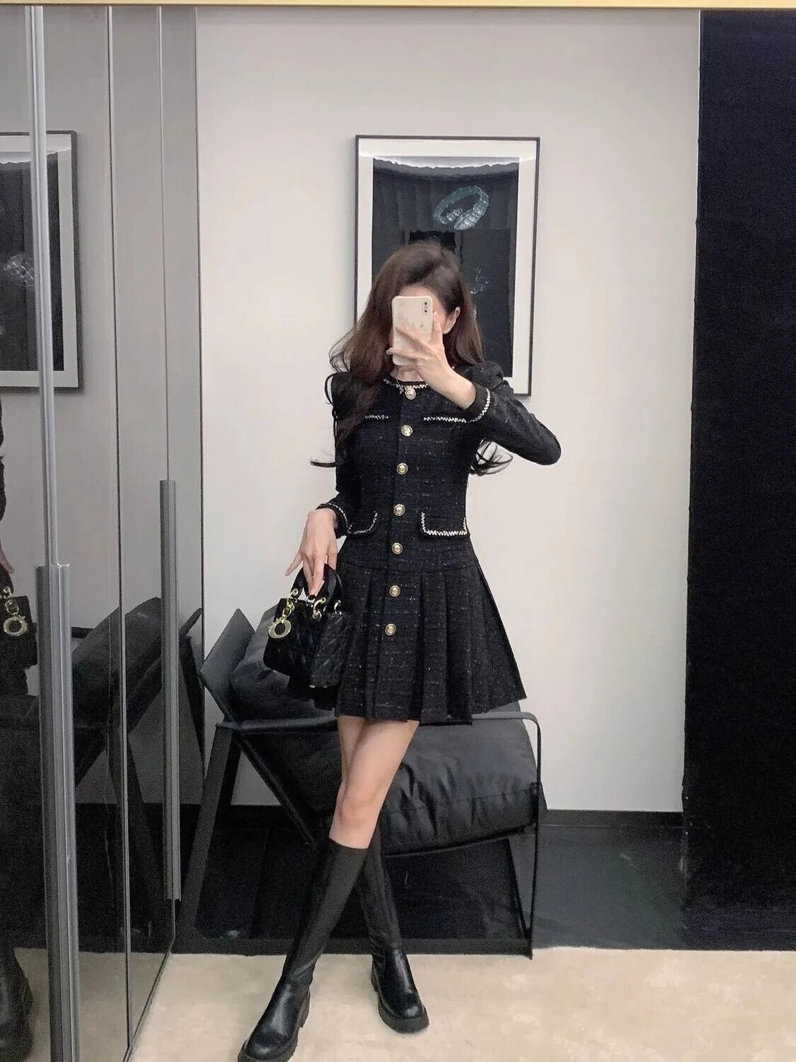 秋冬ラウンドネックミディアム丈スリムフィットプリーツツイード - フレグランスブラックドレス オータム 秋物 ウィンター 冬物 Oネック