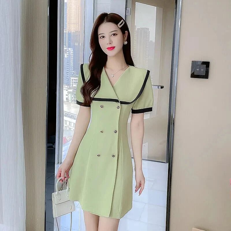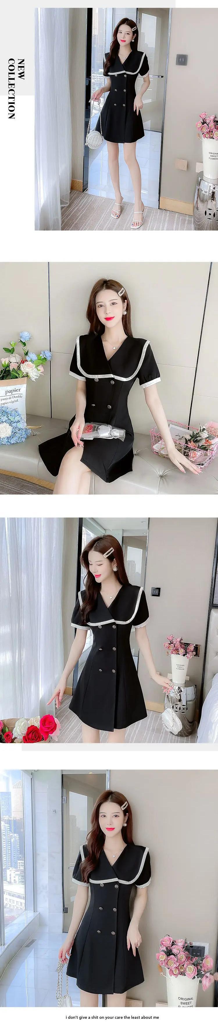 夏ネイビーカラーダブルブレストウエストラップミッドレングスドレス サマー 夏物