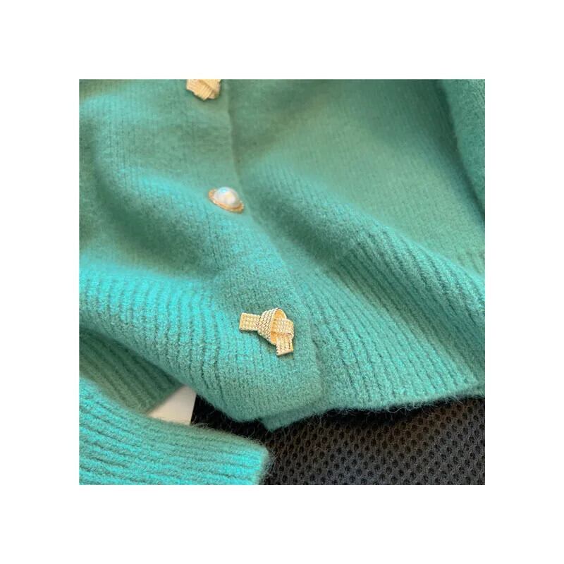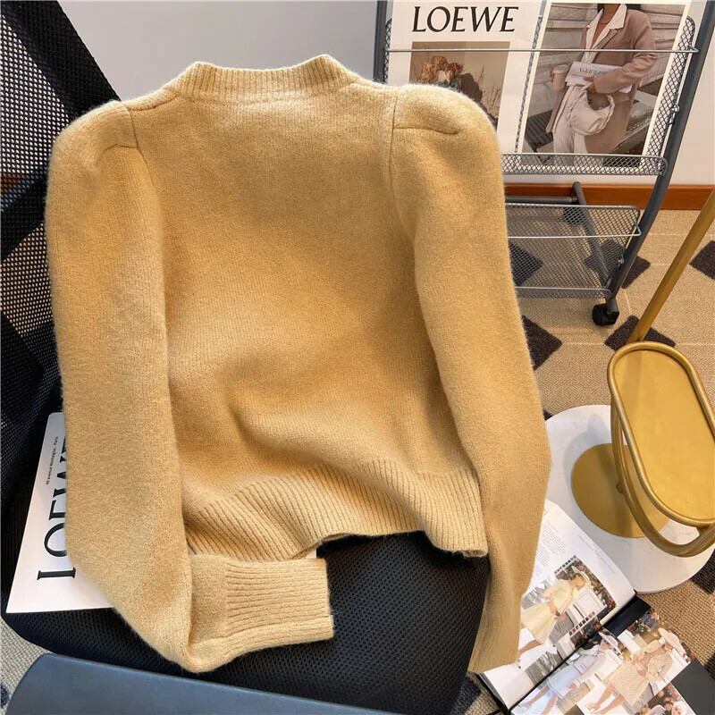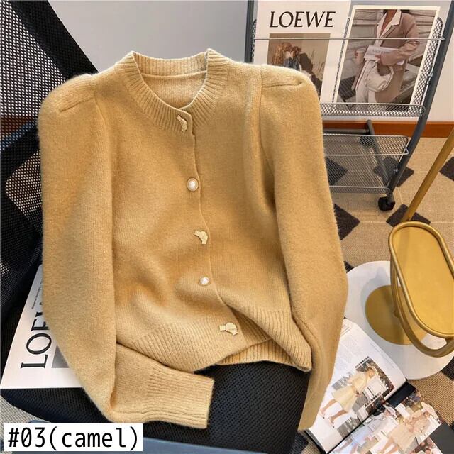 グリーン ピンク キャメル 秋/冬 メタルボタン 香りよいスタイル 長袖 ラウンドネック バブルスリーブ カーディガン セーター コート ロング オータム 秋物 ウィンター 冬物 Oネック