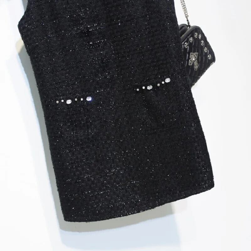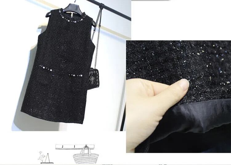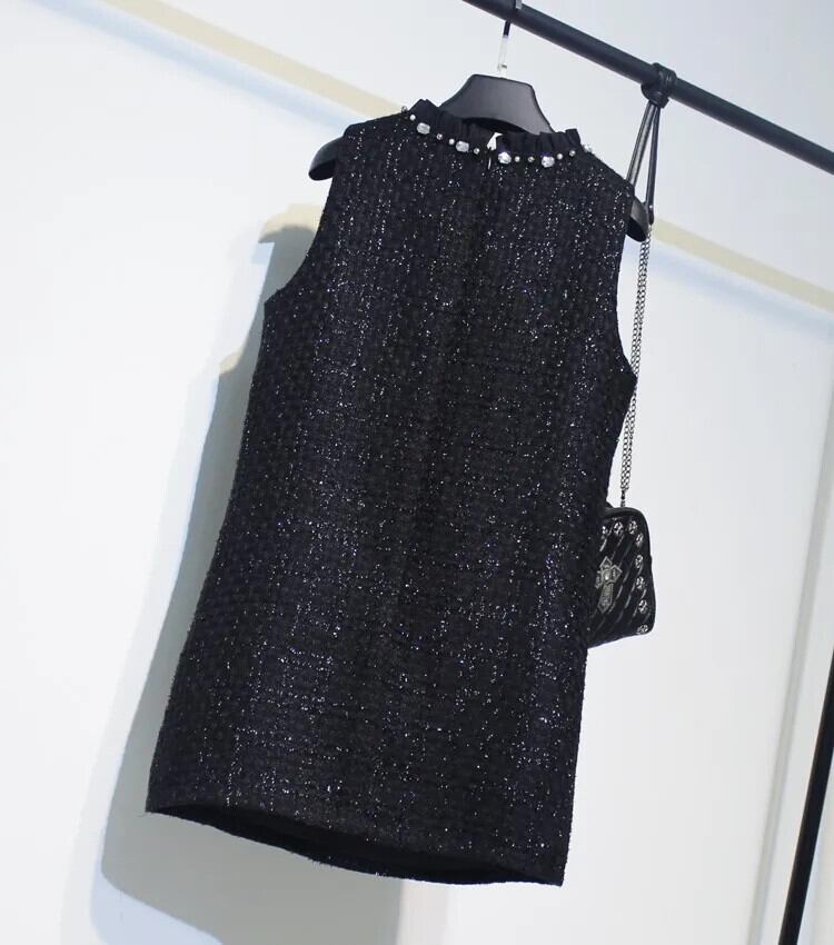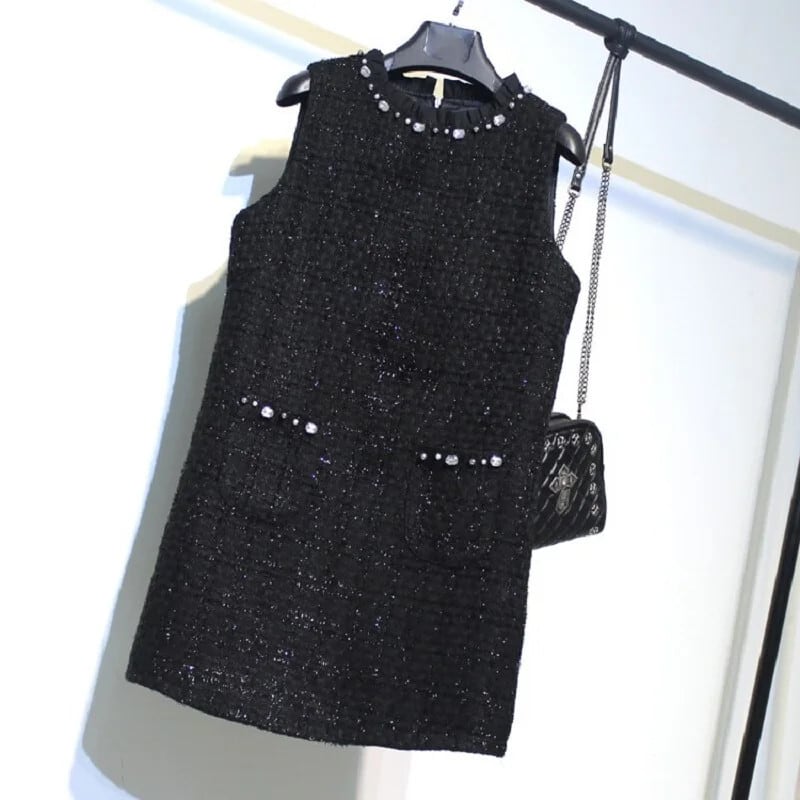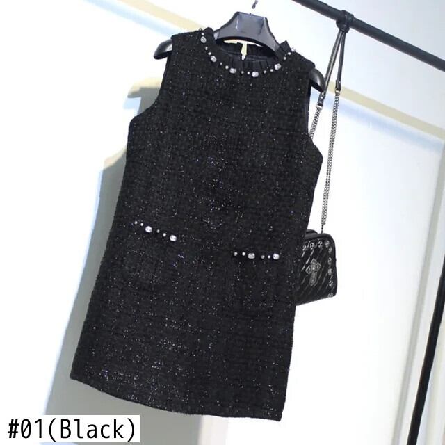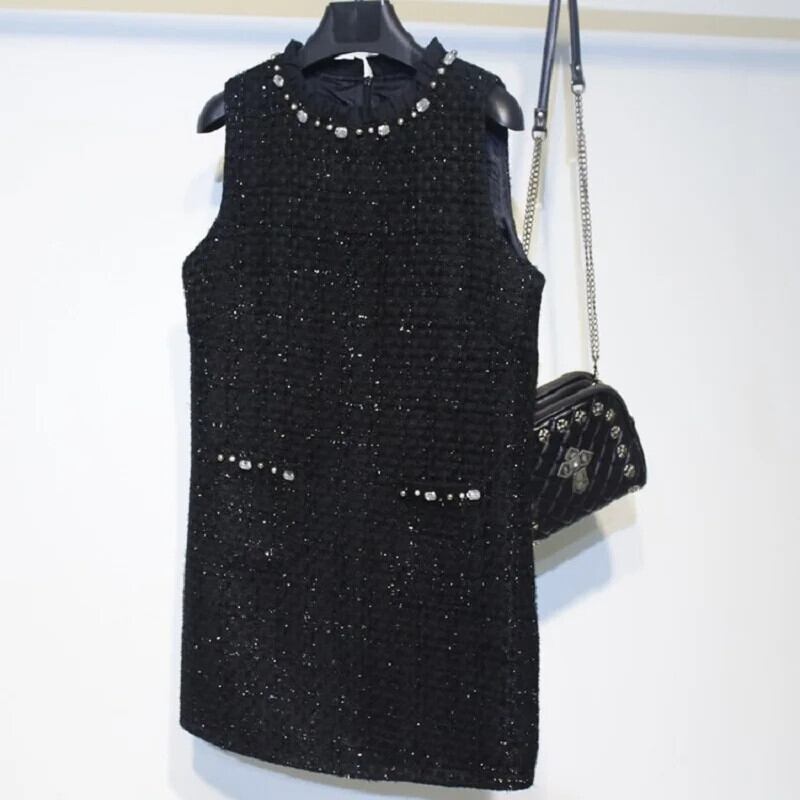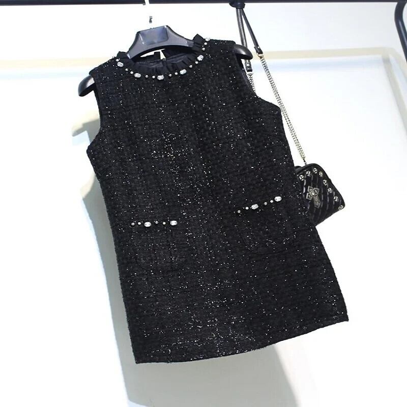 レディース秋冬ブラックツイード香り風手作りビーズノースリーブタンクトップドレス オータム 秋物 ウィンター 冬物