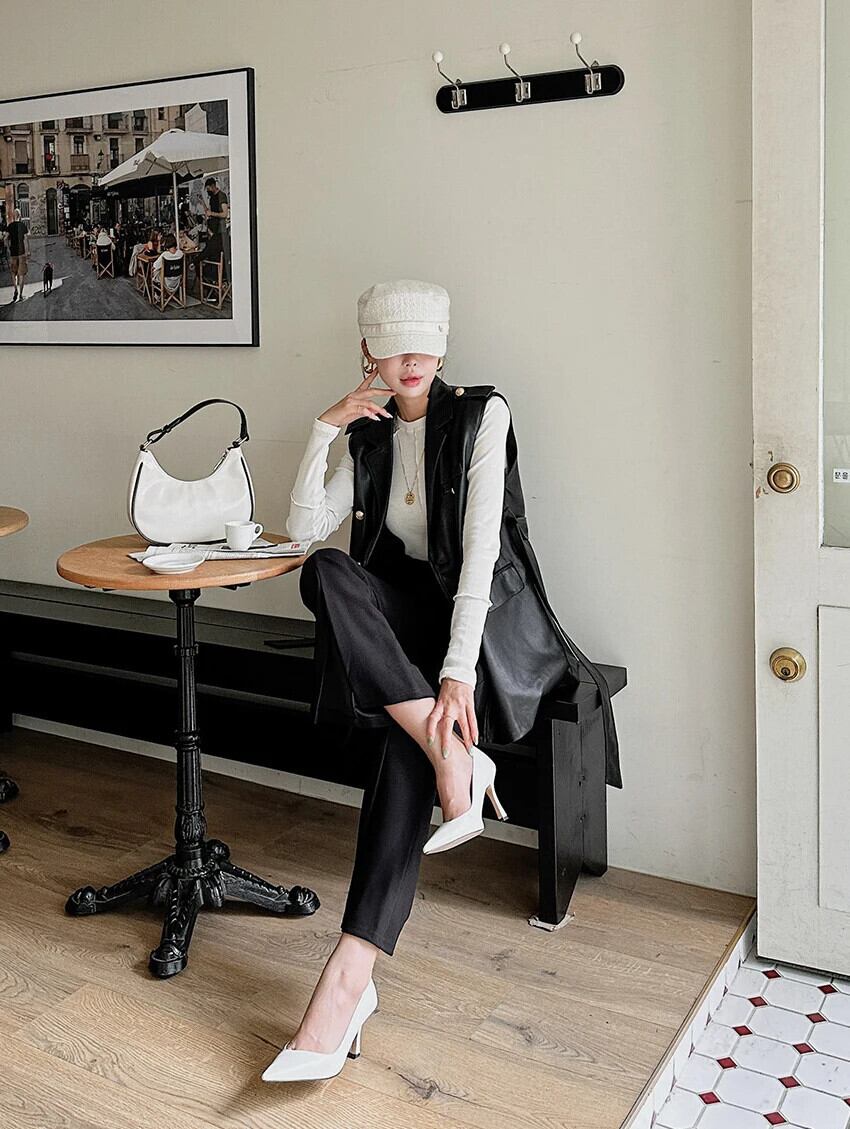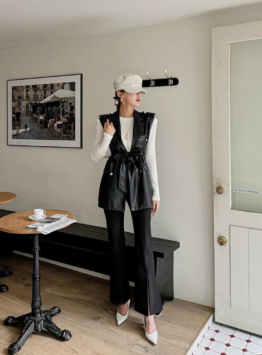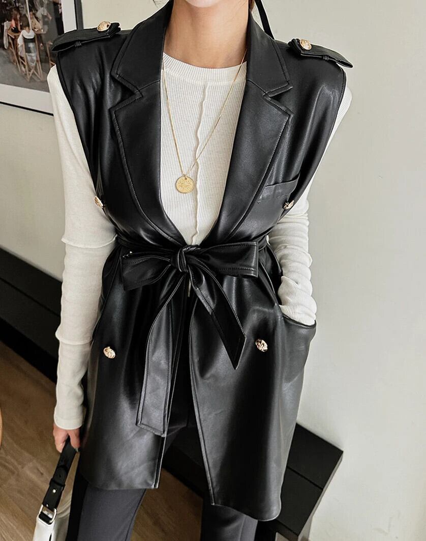 秋ダブルブレストレザーベストレースアップショルダーバッジオートバイミッドレングスPUコート オータム 秋物