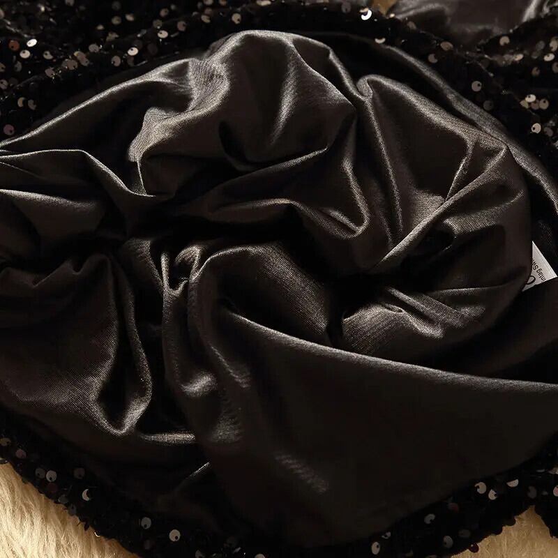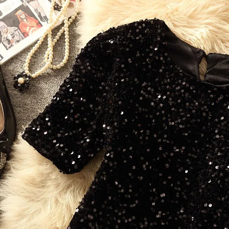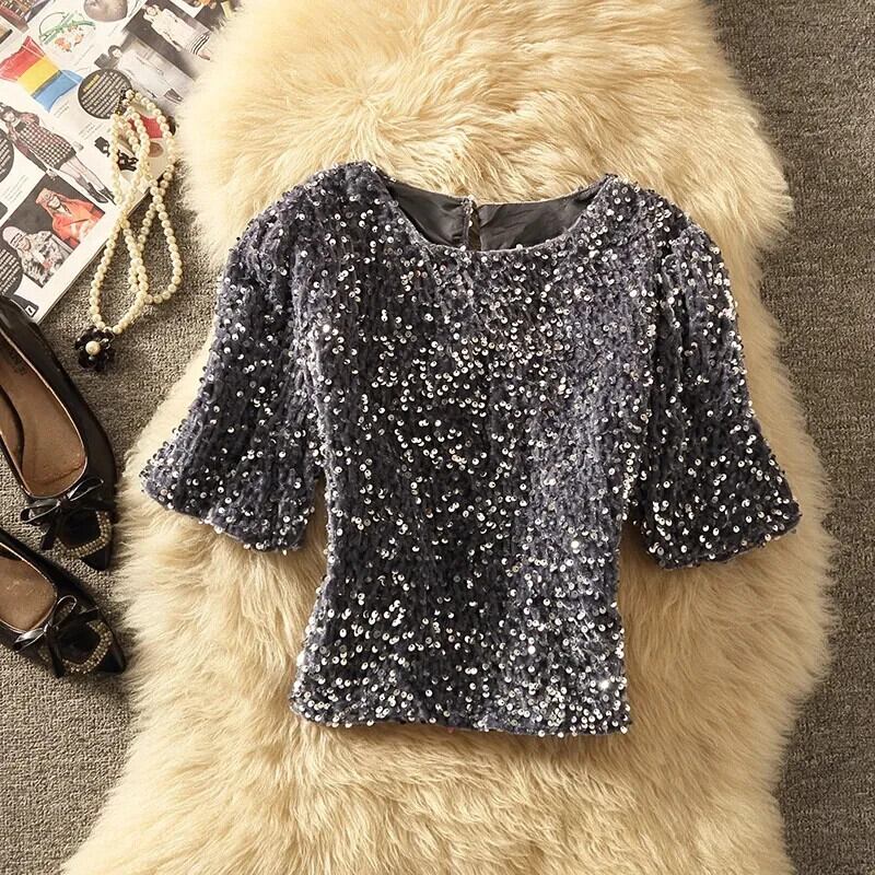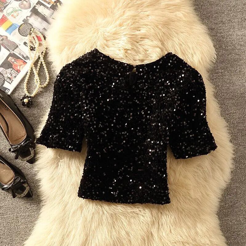 スパンコールラウンドネック半袖トップス夏セレブユニークブラックシルバーセクシー ショート ハーフスリーブ サマー 夏物 Oネック 銀