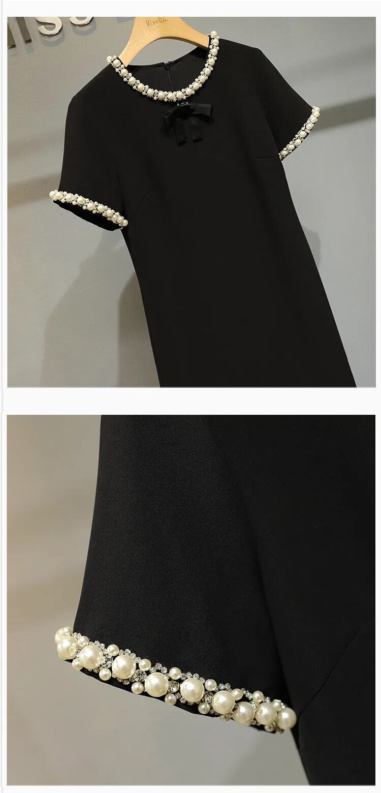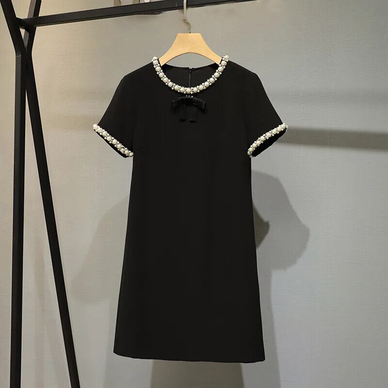 フレグランス半袖サマーレディースビーズAラインブラックドレス ショート ハーフスリーブ 夏物