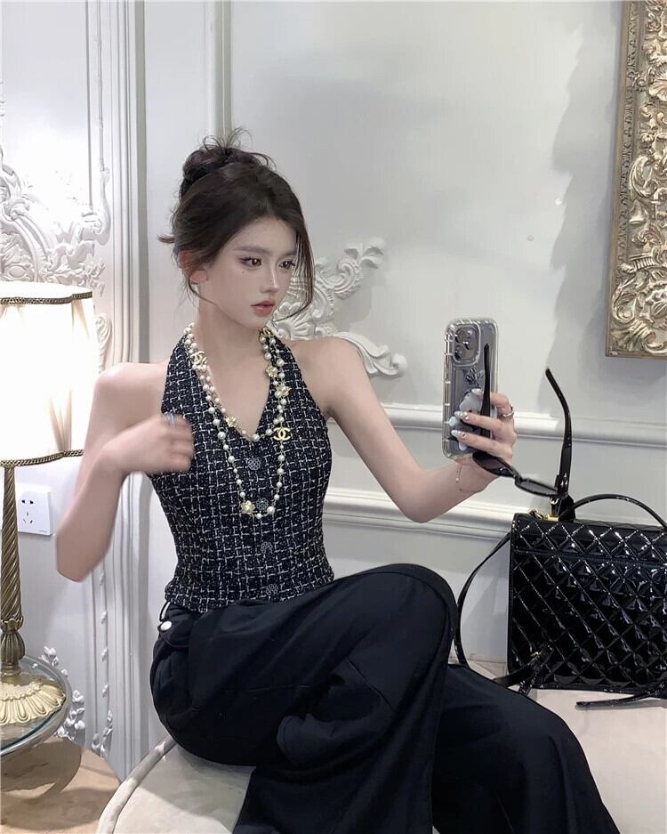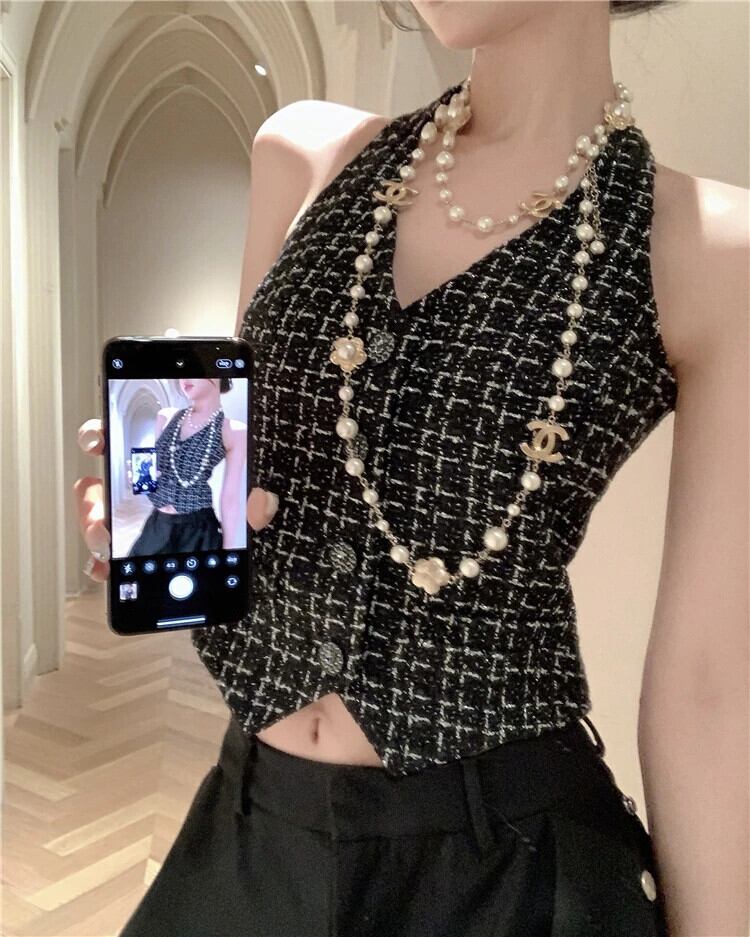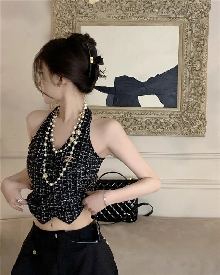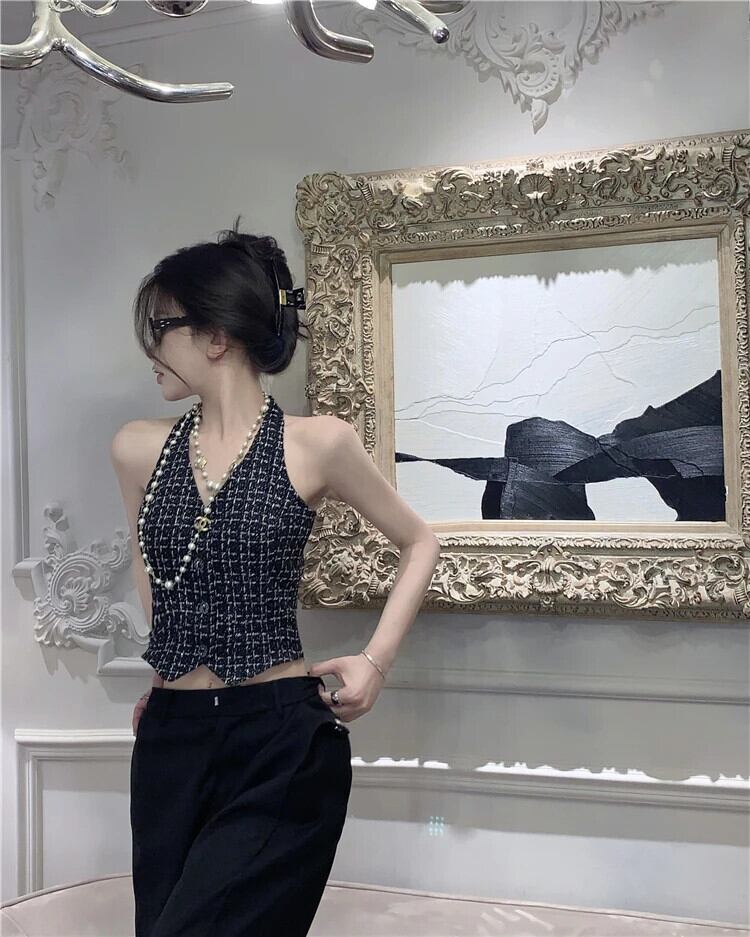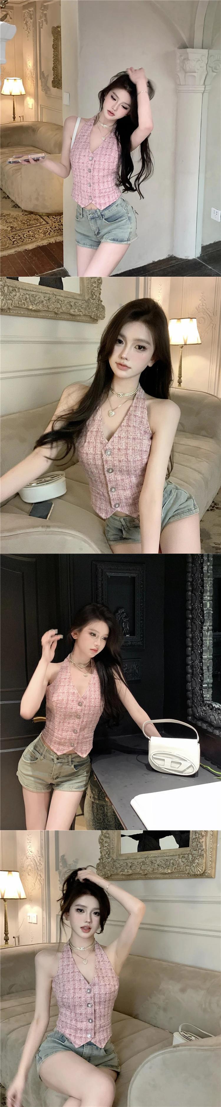 夏スタイルフレグランス ベスト トップスハンギング ネック着用ショート ニット チェック柄ワシット コート サマー 夏物