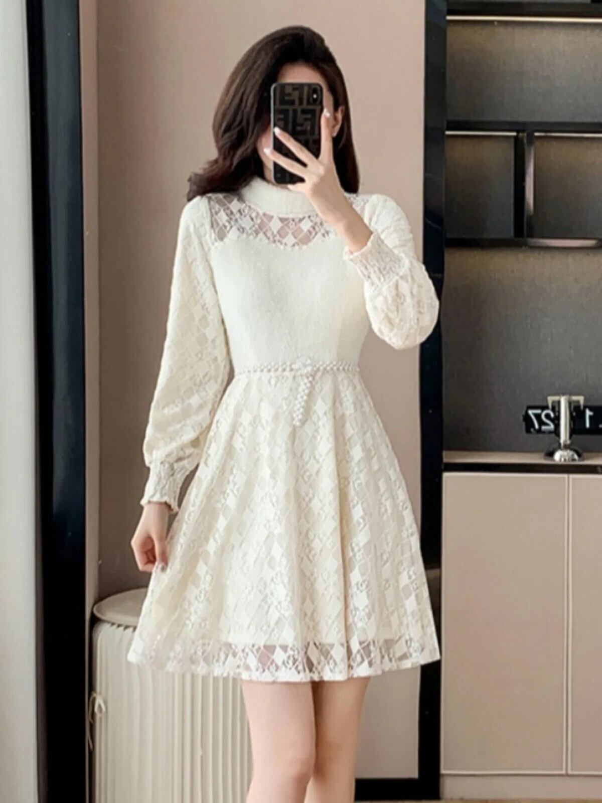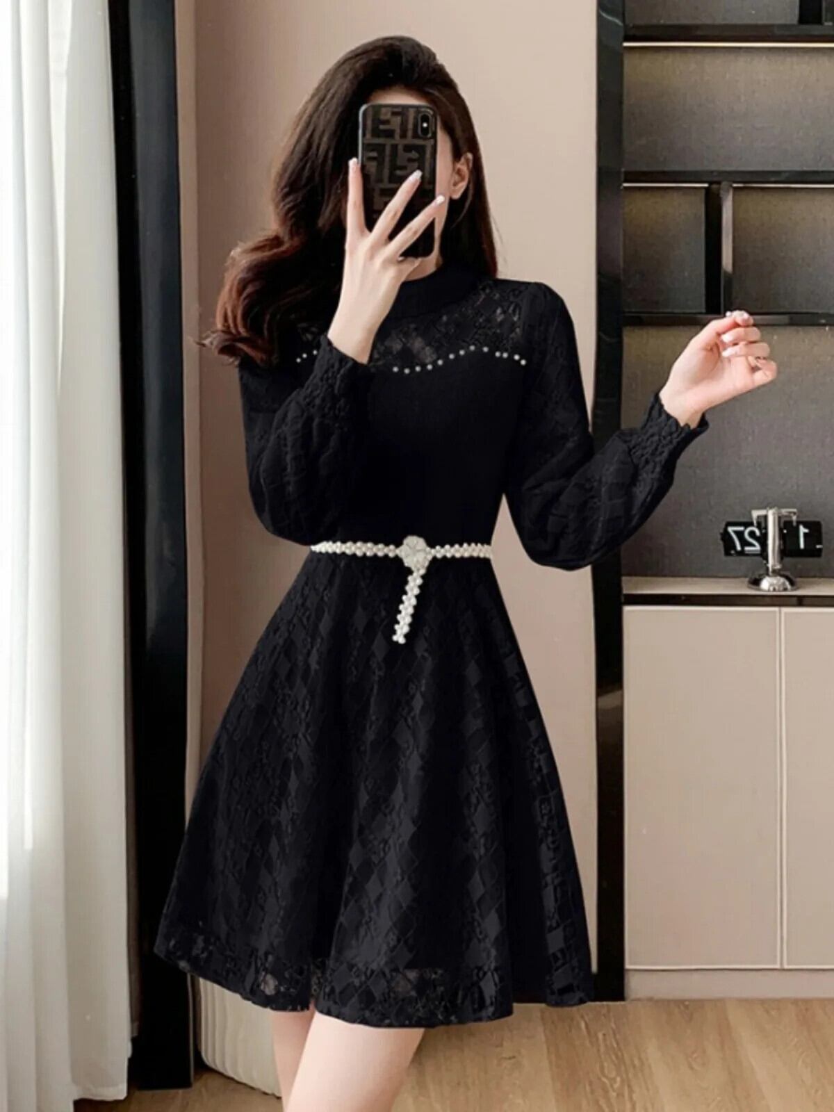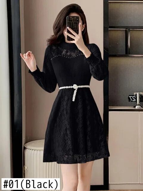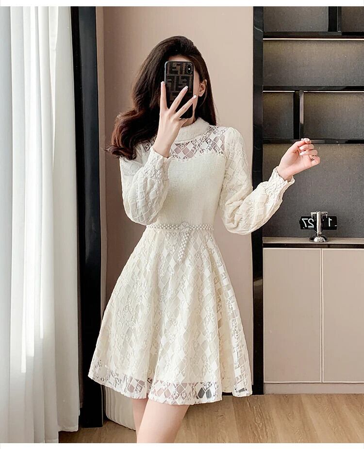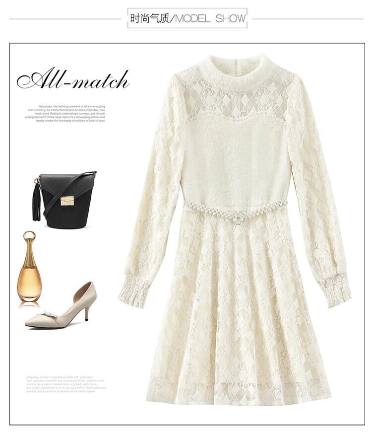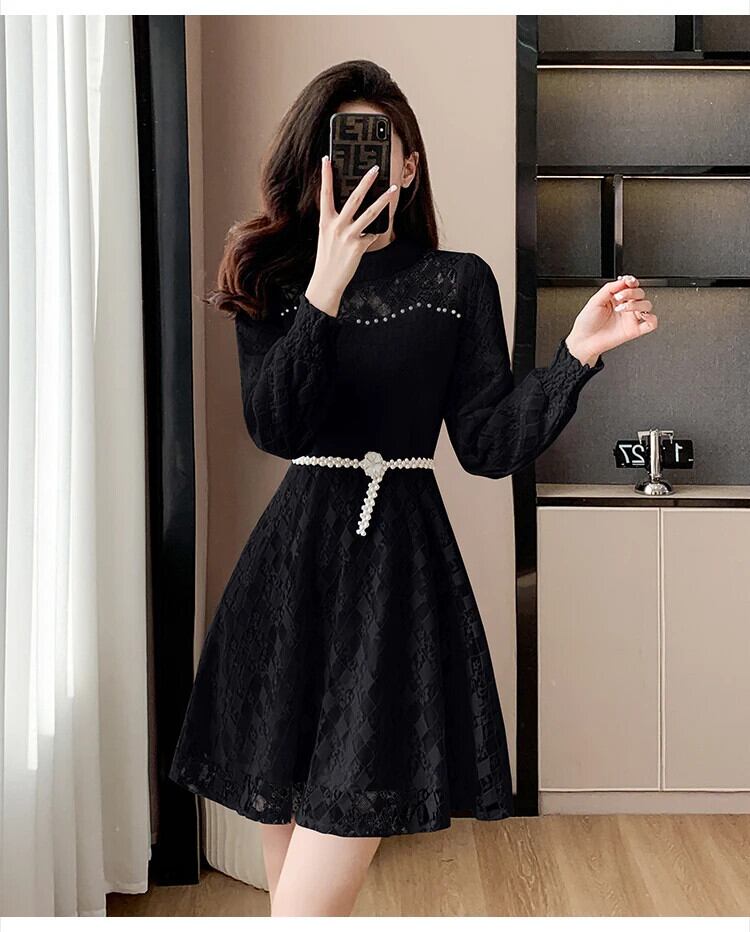 冬スタイル気質フレンチレース豪華肥厚ネックパールベルトボトムドレス ウィンター 冬物 ハーネス 真珠