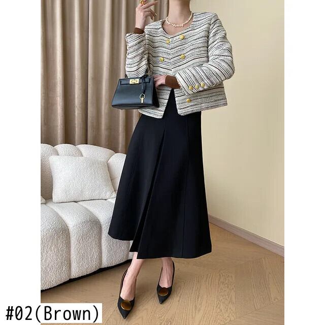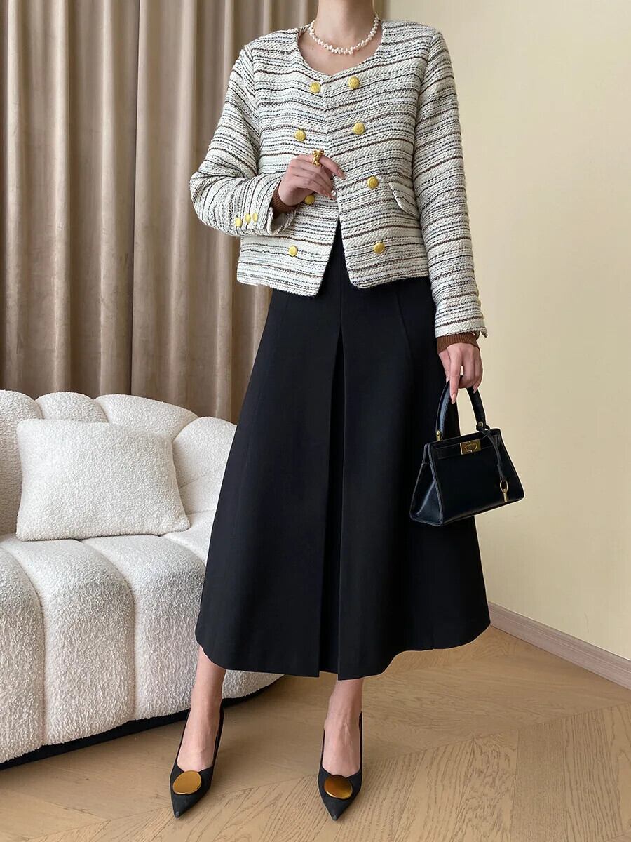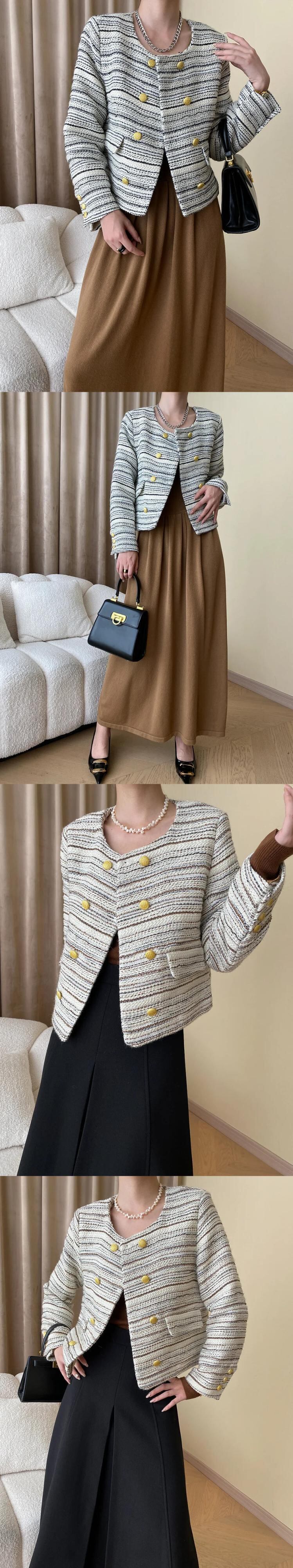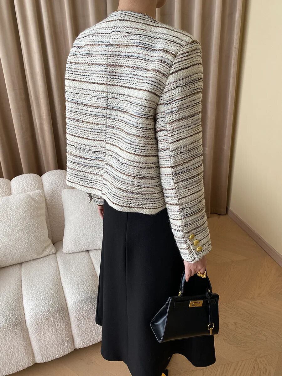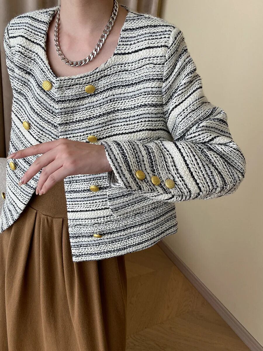 秋冬ノーブルアート粗いツイード香りよい二列ゴールドバックルコートストライプウールジャケット オータム 秋物 ウィンター 冬物