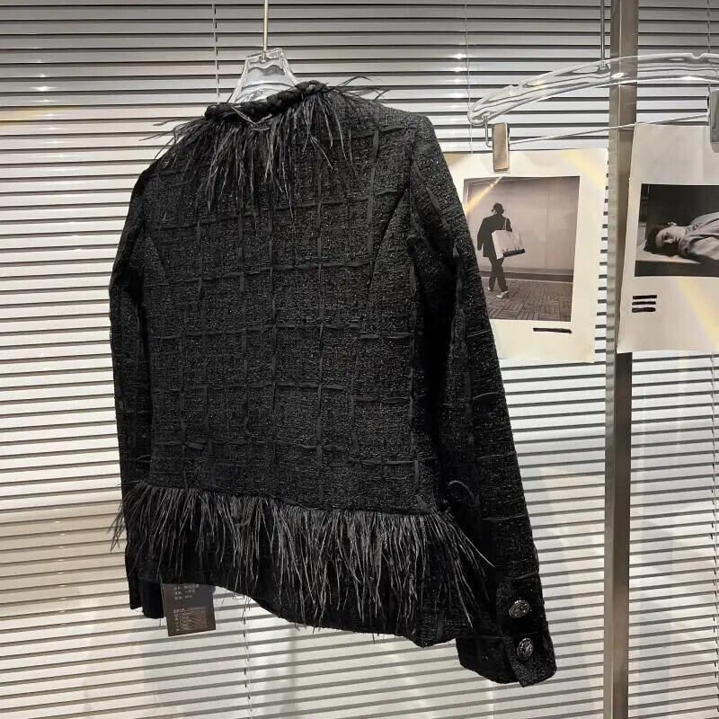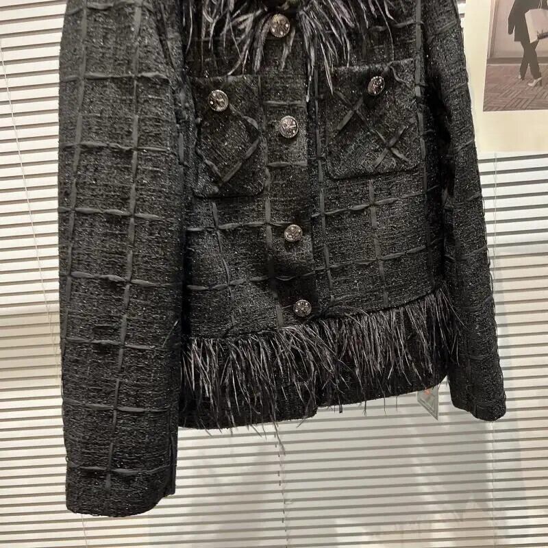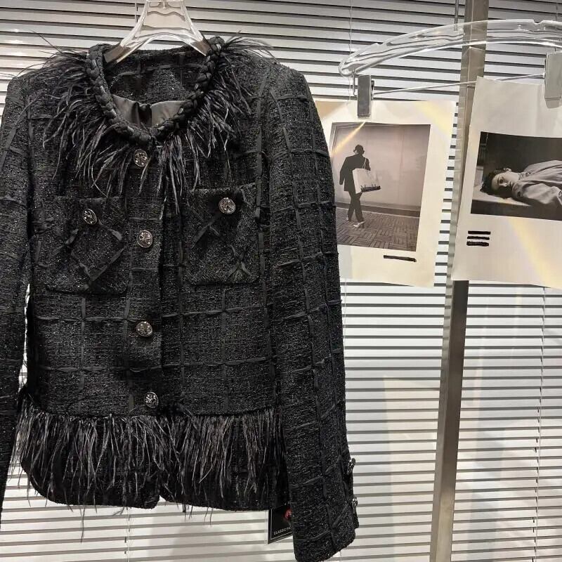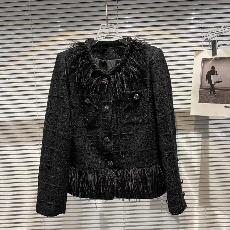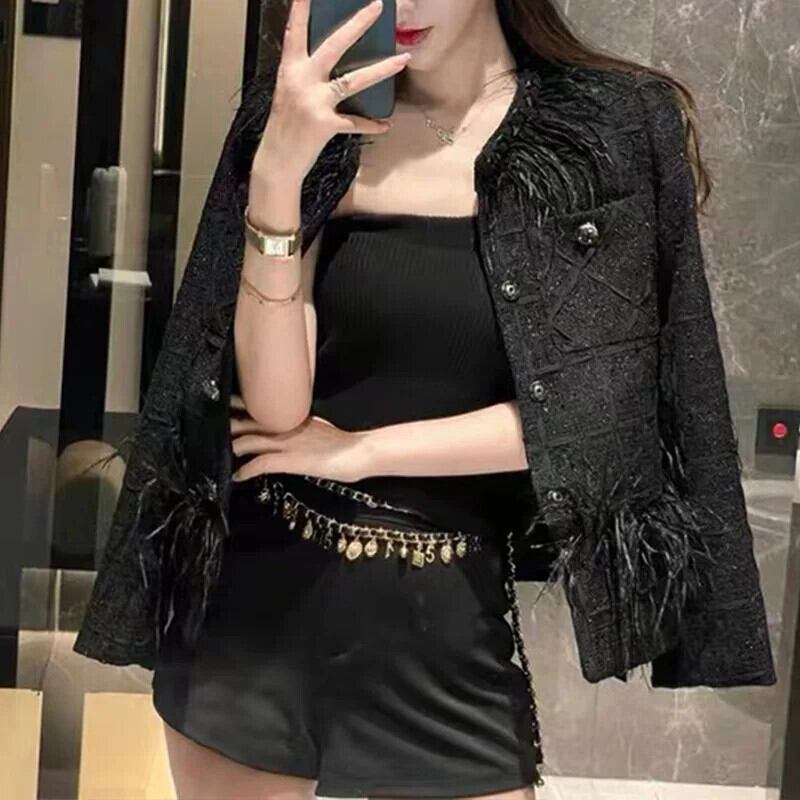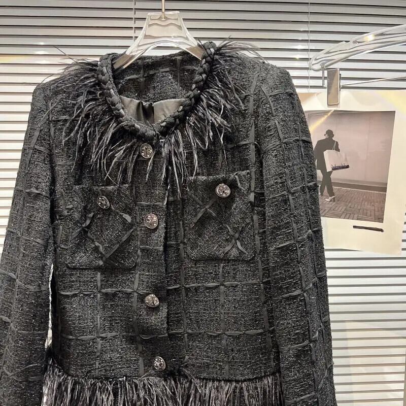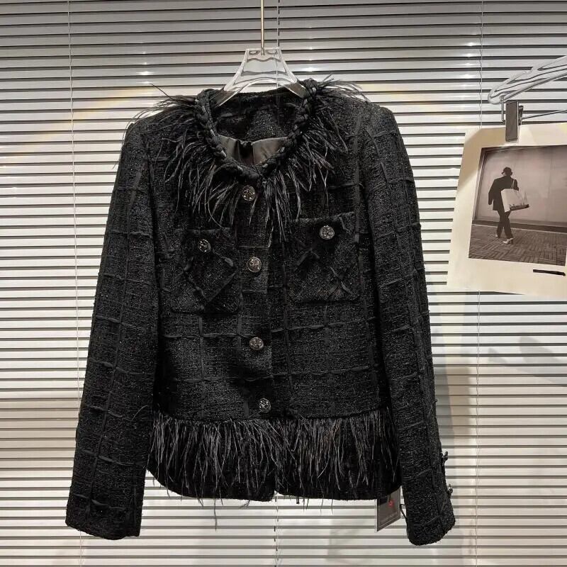 秋香りダチョウ髪襟メタルボタンラウンドネックツイード長袖コート黒ジャケット ロング ブラック オータム 秋物 Oネック