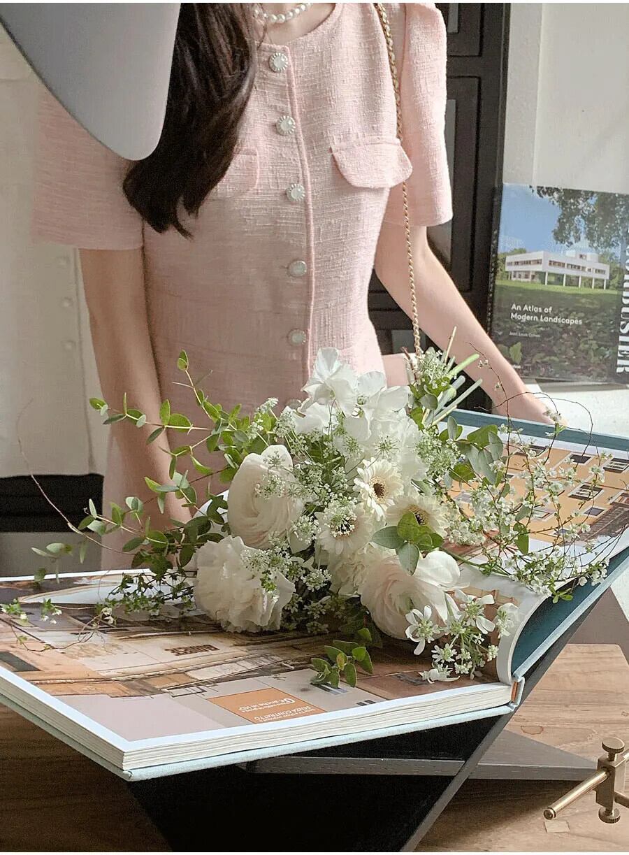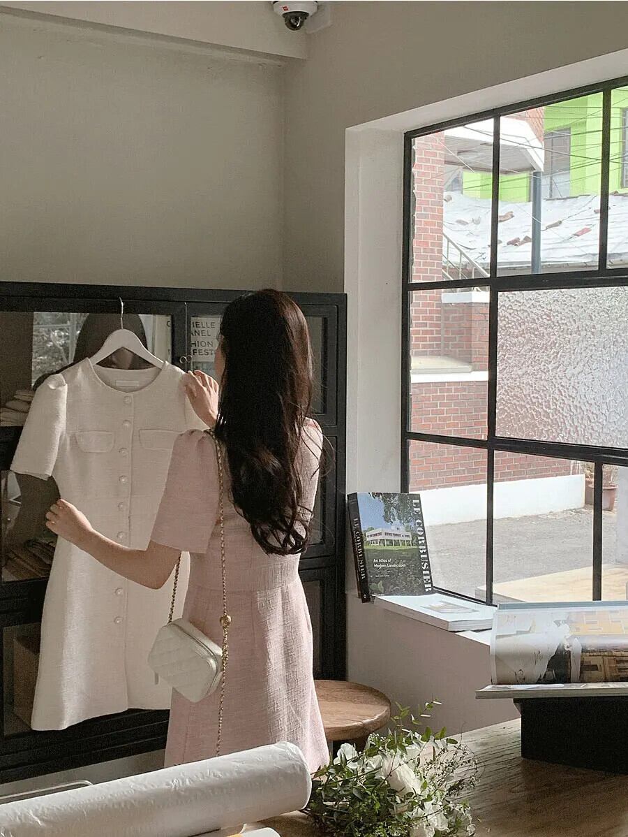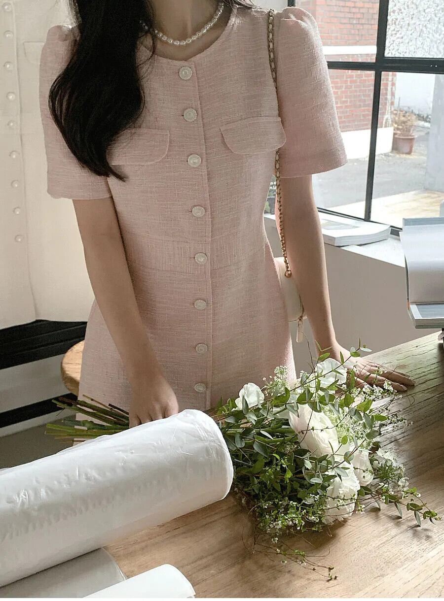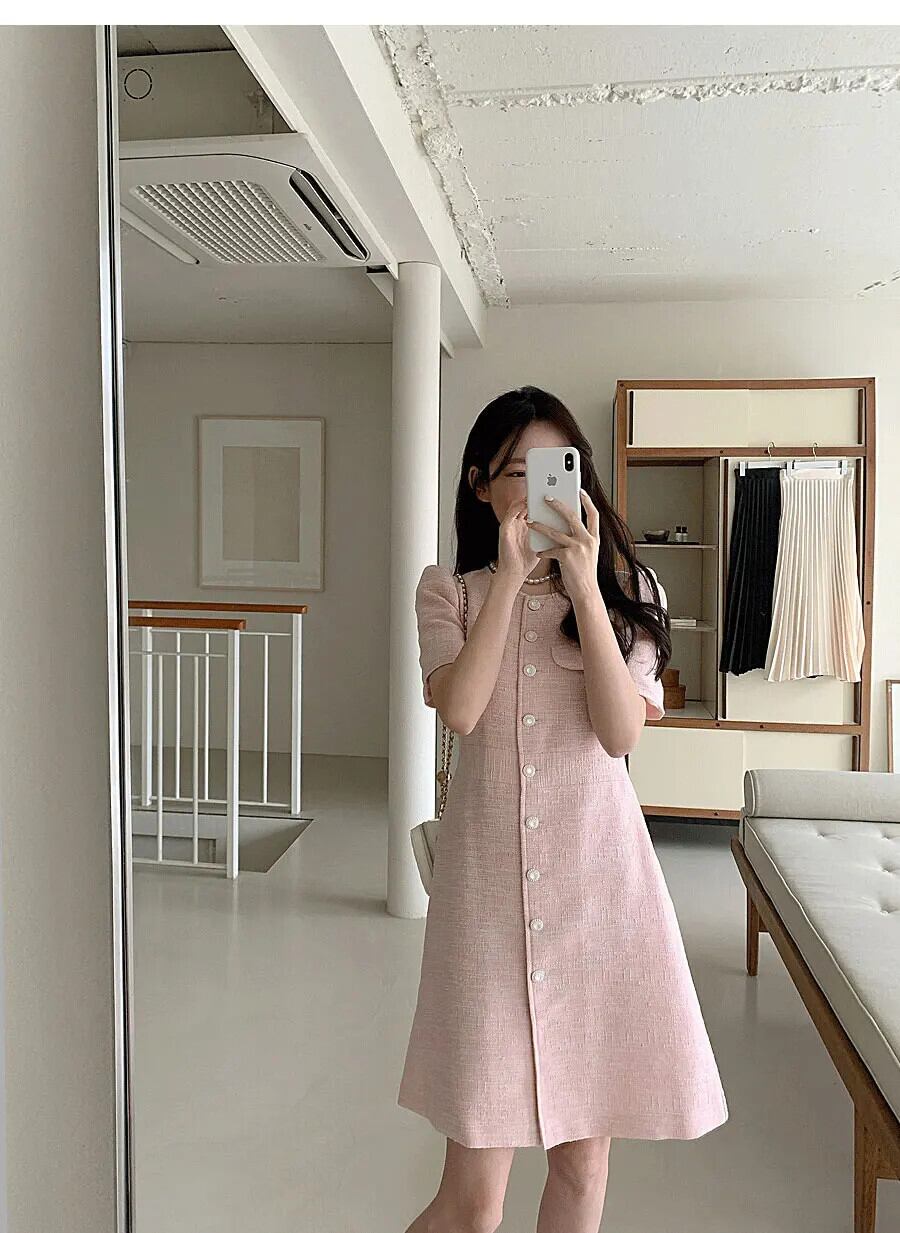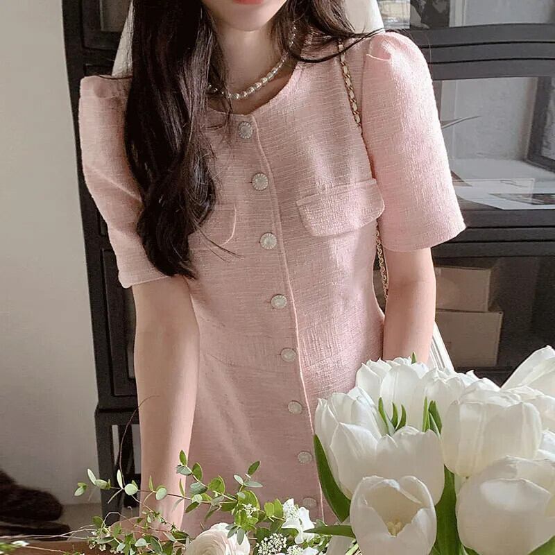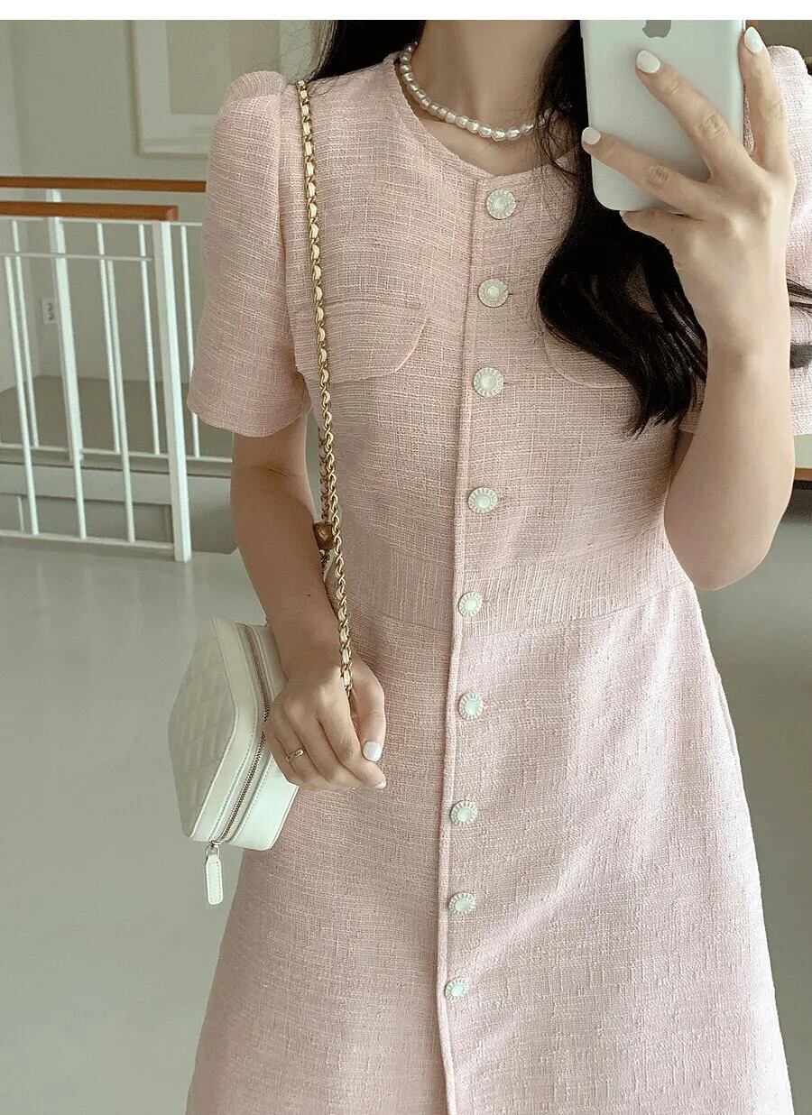 シック夏フレンチスタイルラウンドネックユニークシングルブレスト痩身半袖粗いドレス ショート ハーフスリーブ サマー 夏物 Oネック
