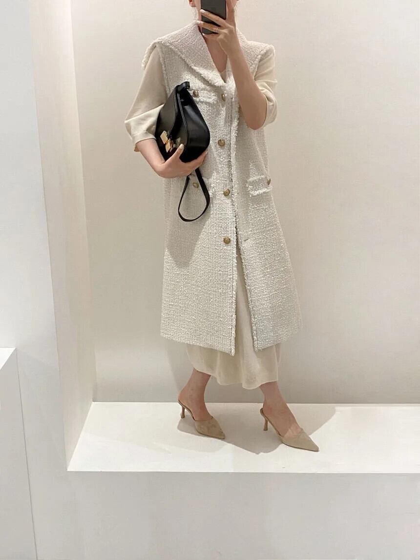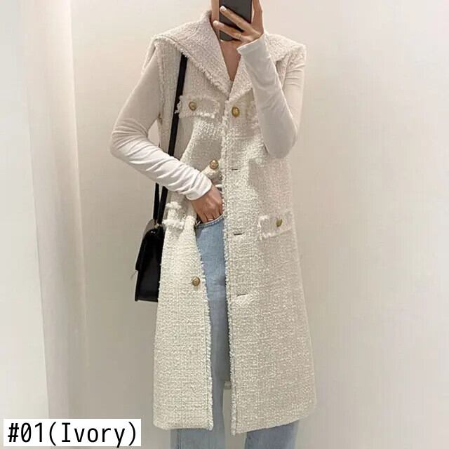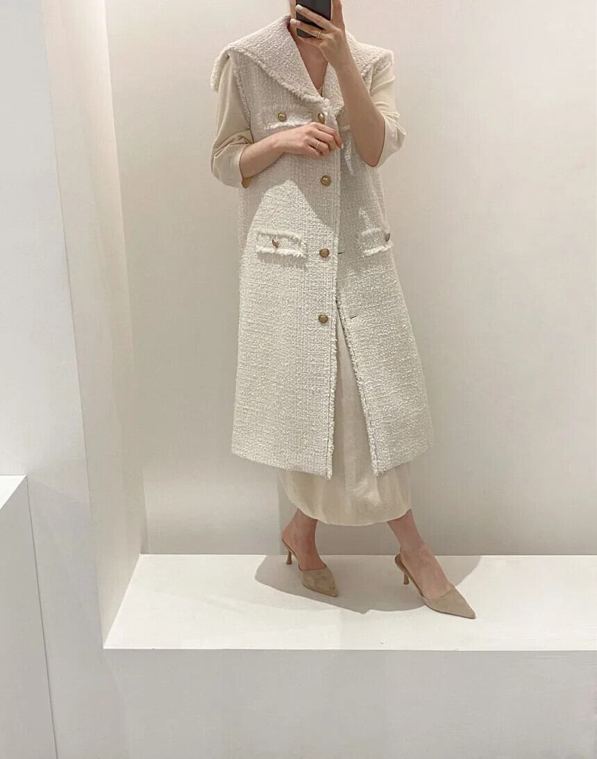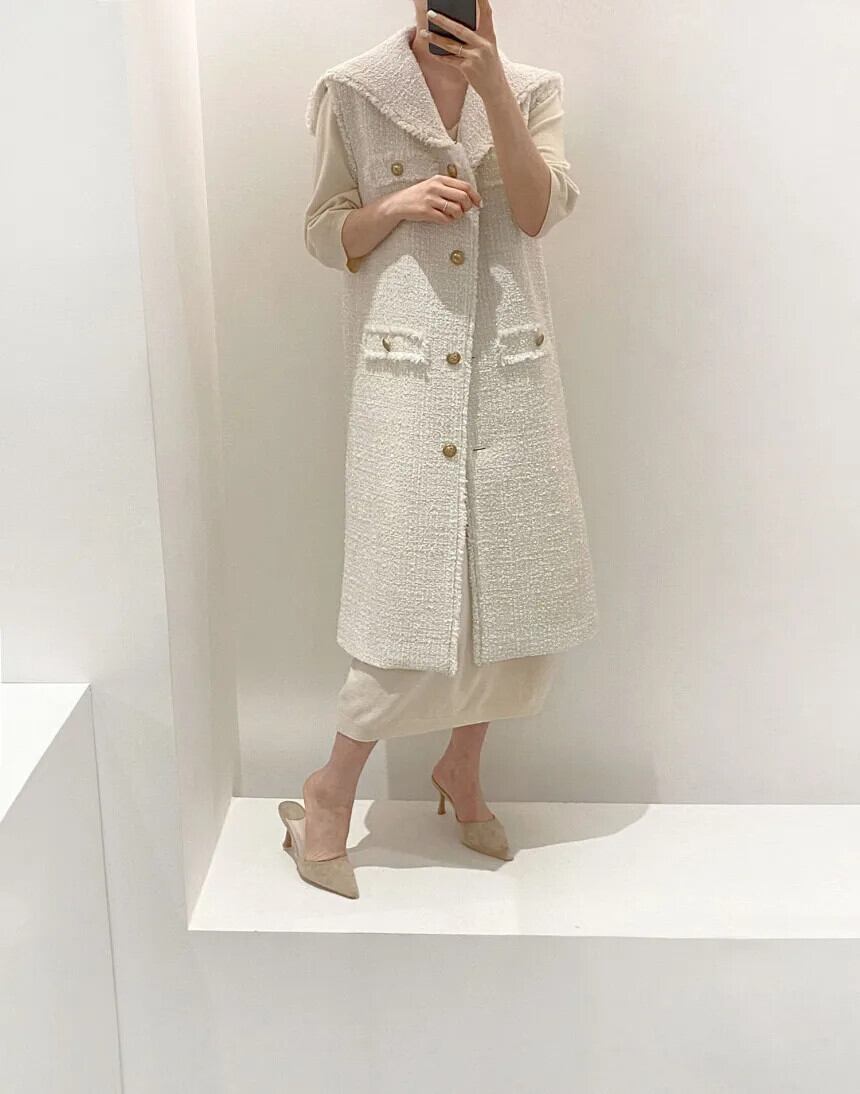 シック春秋チョッキ気質ネイビーカラーテルファーエッジロングアプリコット - ツイードベストコート スプリング 春物 オータム 秋物