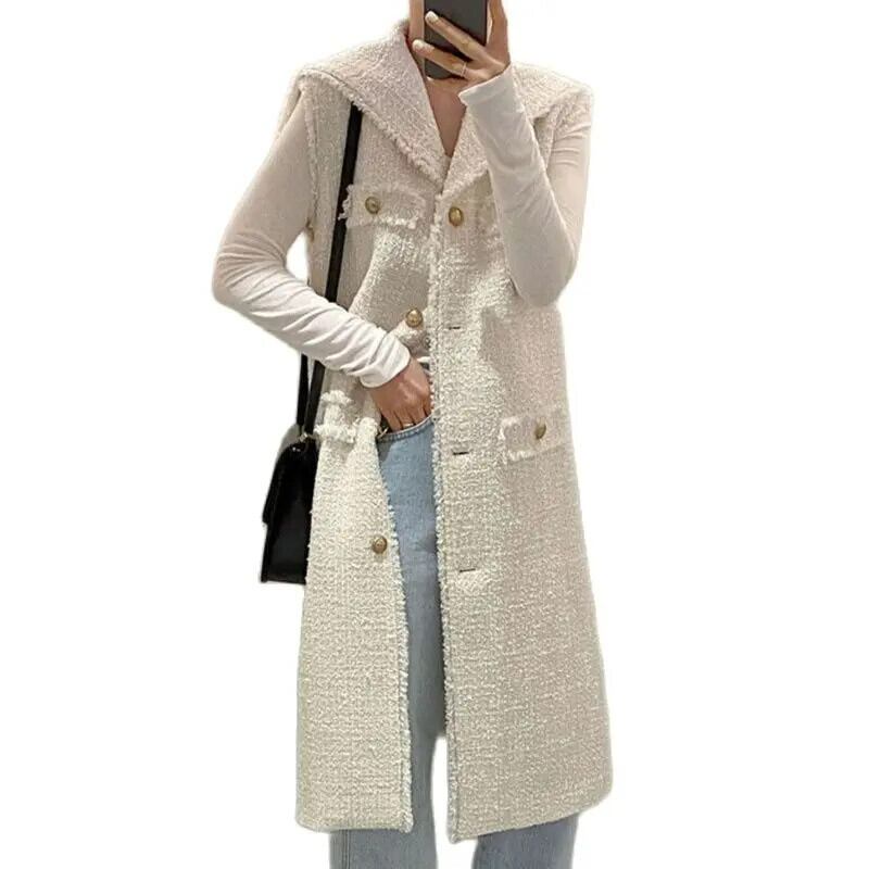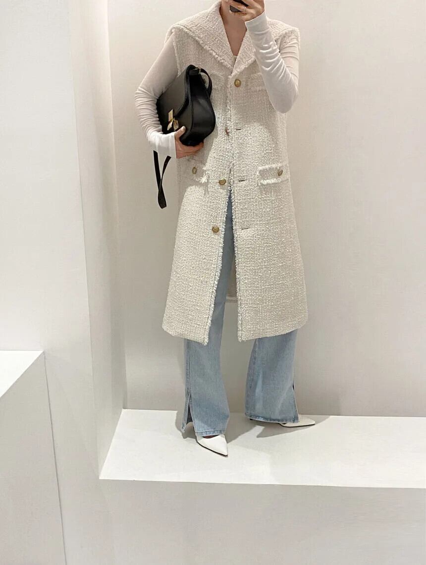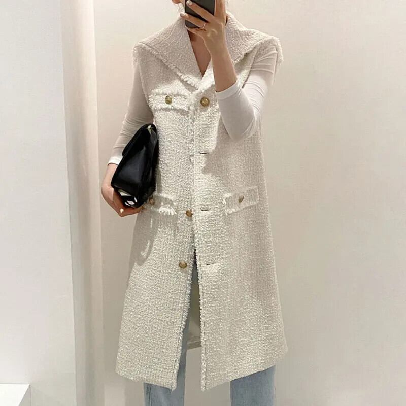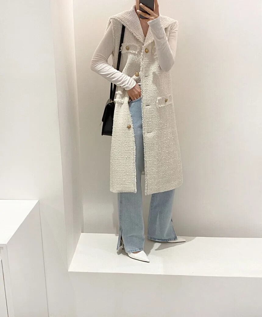 シック春秋チョッキ気質ネイビーカラーテルファーエッジロングアプリコット - ツイードベストコート スプリング 春物 オータム 秋物