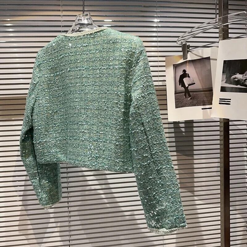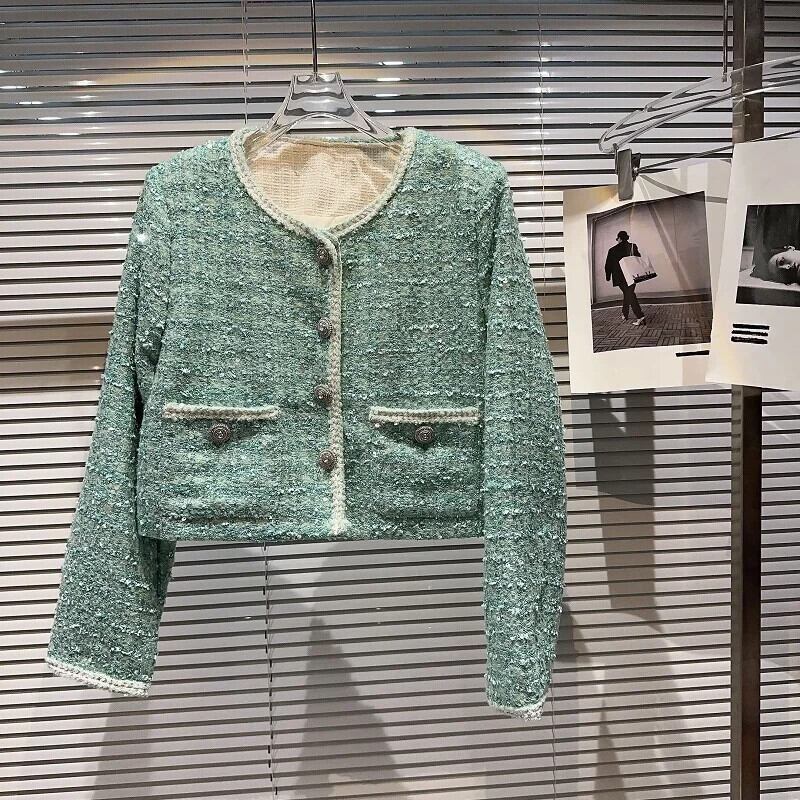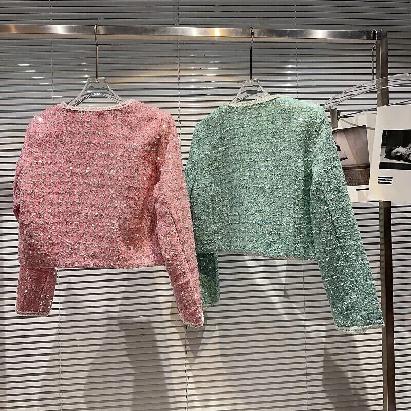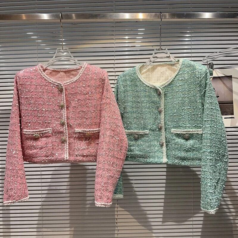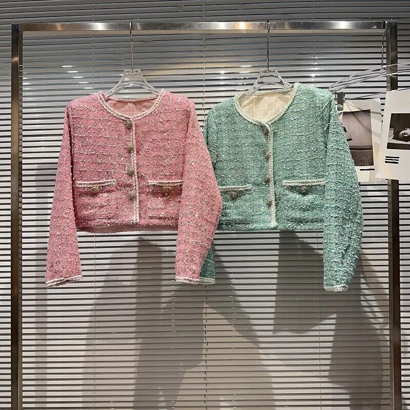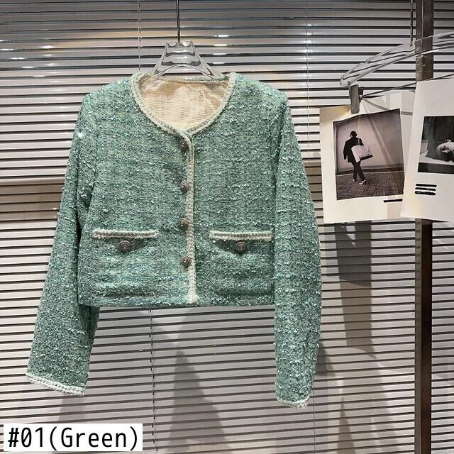 秋香りダイヤモンド明るいツイード気質セレブショートコートグリーンピンク Y2K ストリートジャケット生き抜く オータム 秋物 シルク