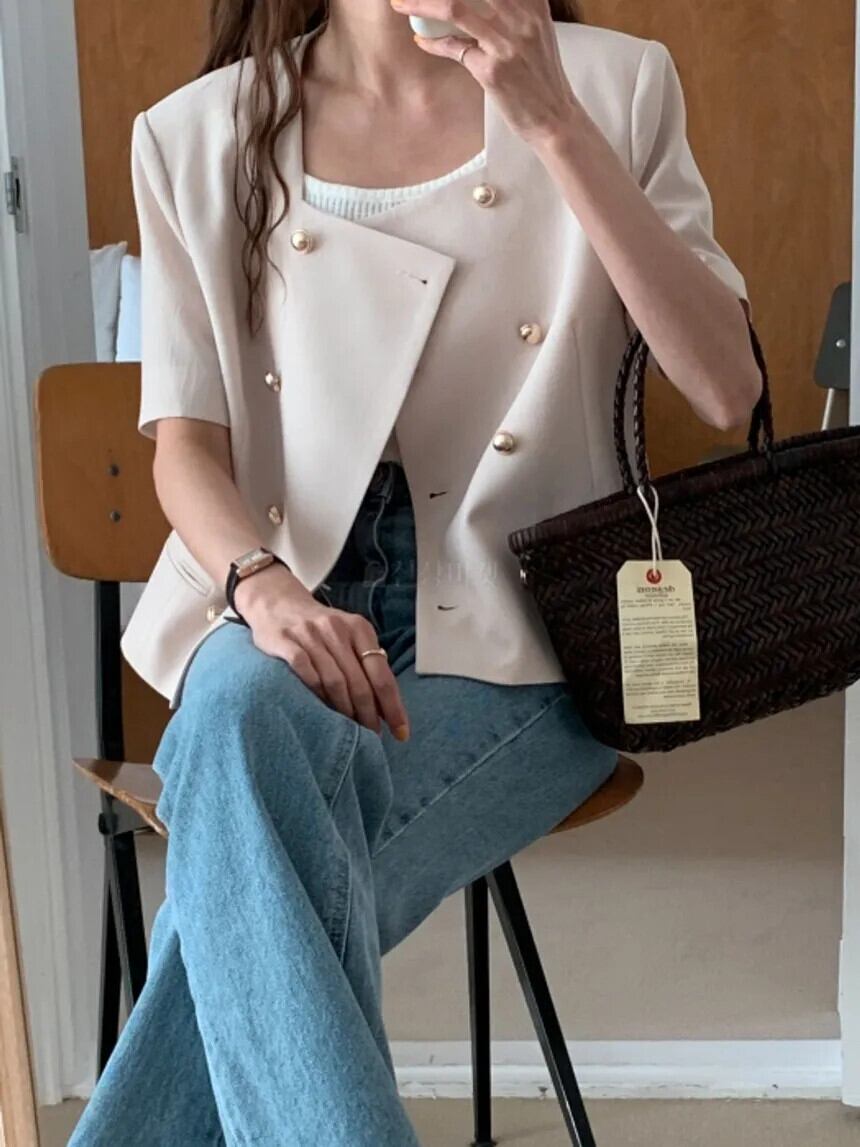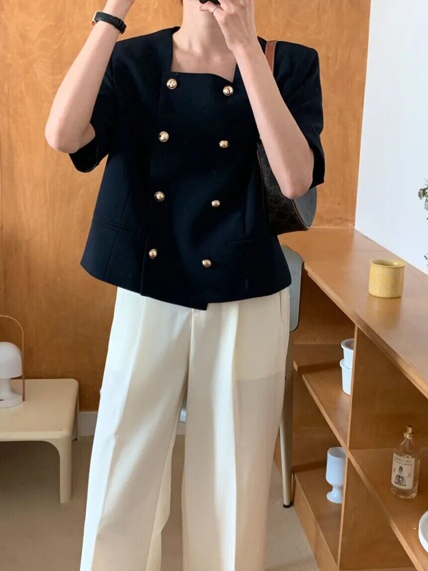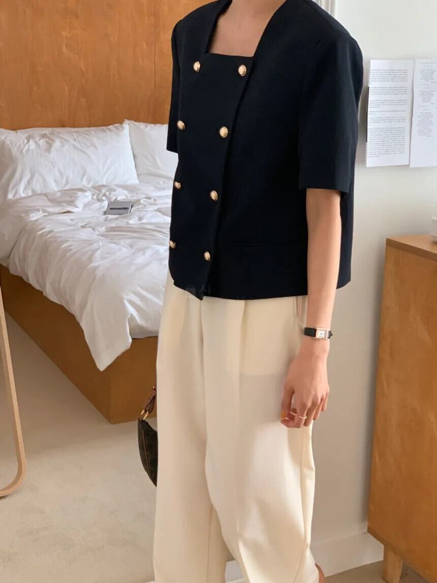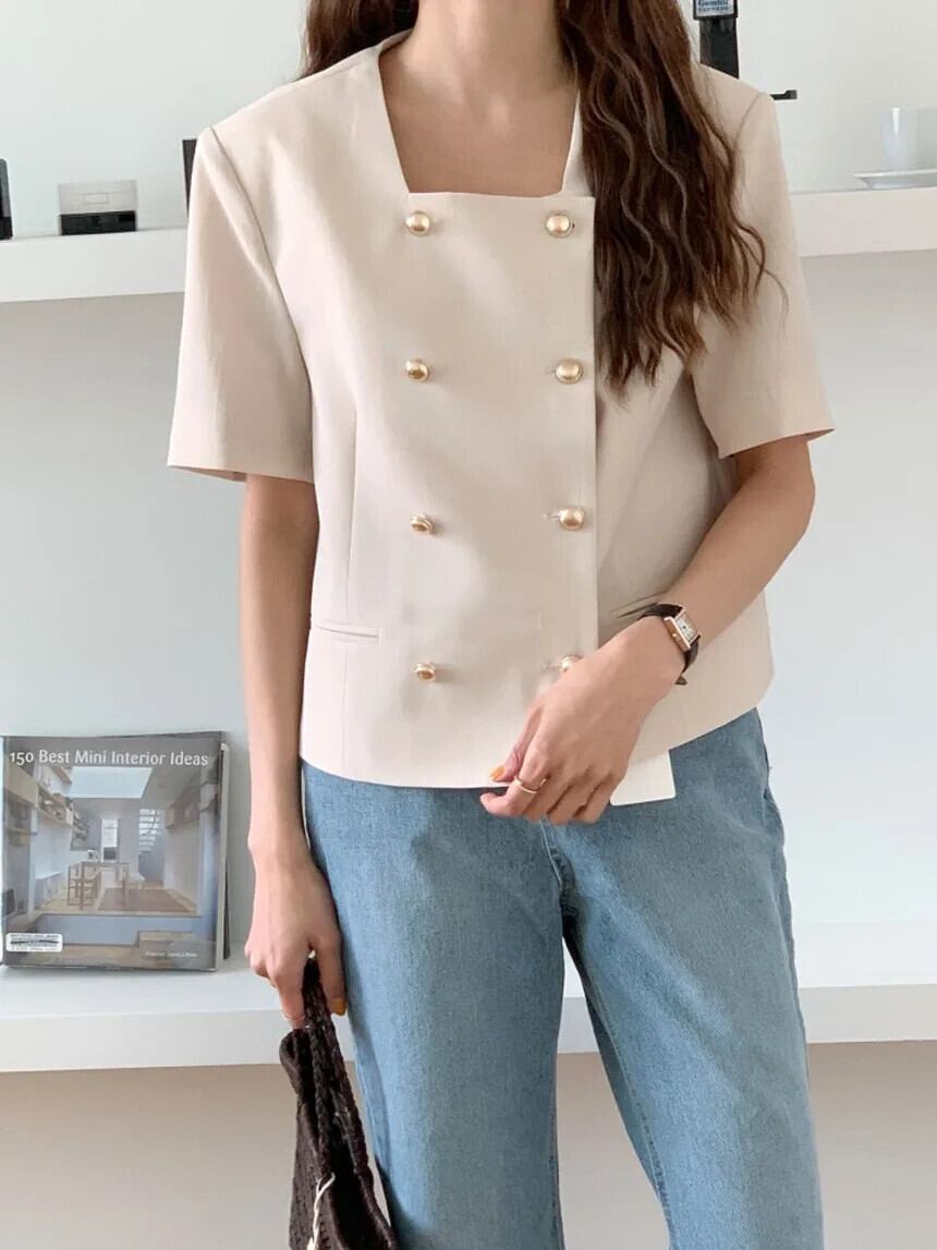 シック夏シンプル無地ダブルブレストスクエアネック半袖シャツトップ ショート ハーフスリーブ サマー 夏物 ソリッドカラー スクウェア