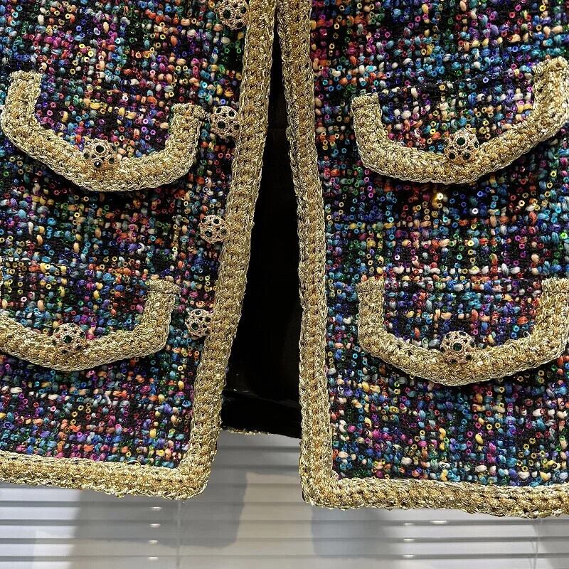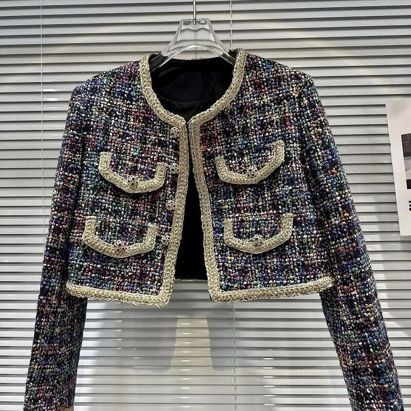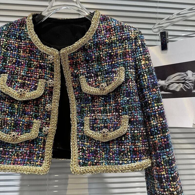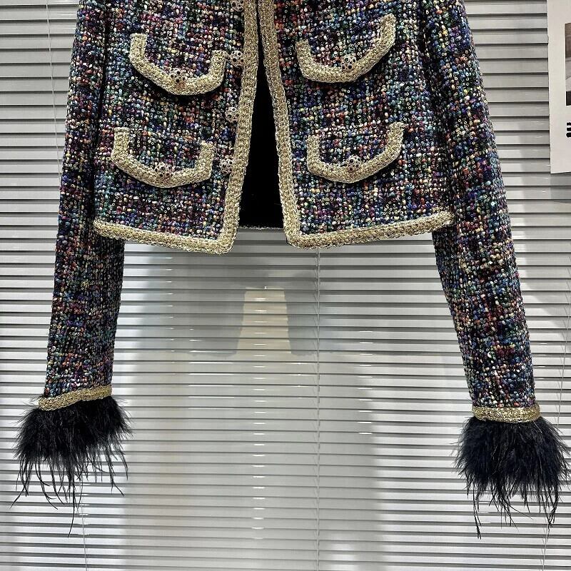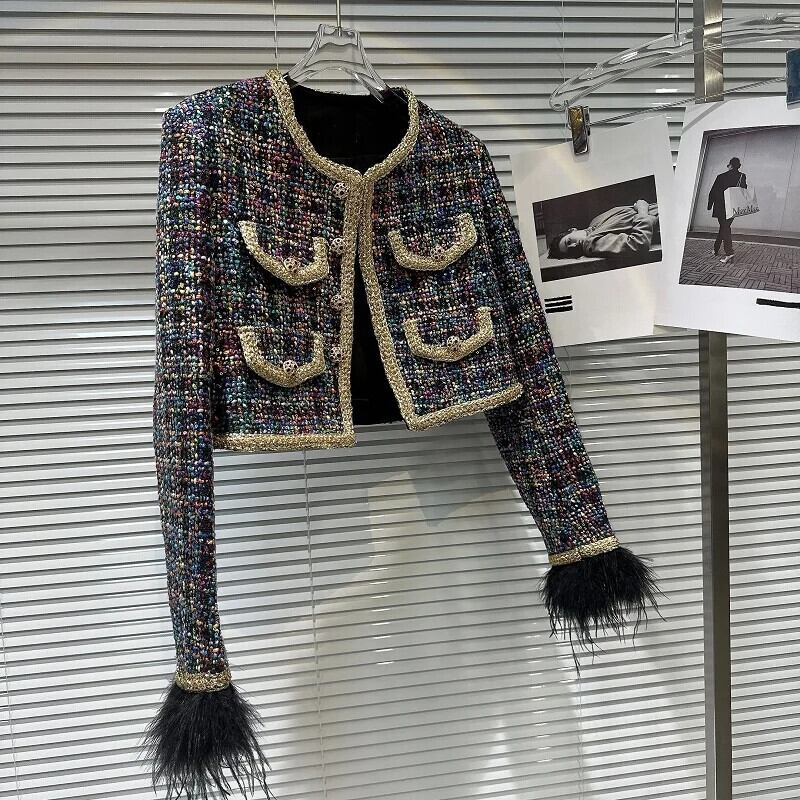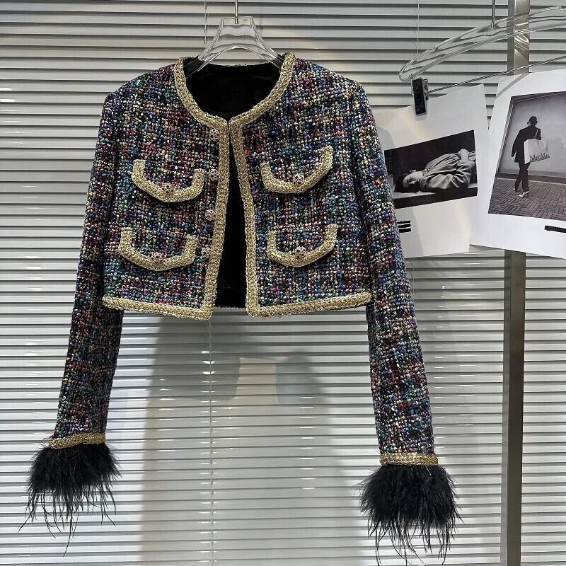 秋冬香りダチョウ毛袖カラフルスパンコール厚いツイード重工業ショートコートジャケット オータム 秋物 ウィンター 冬物