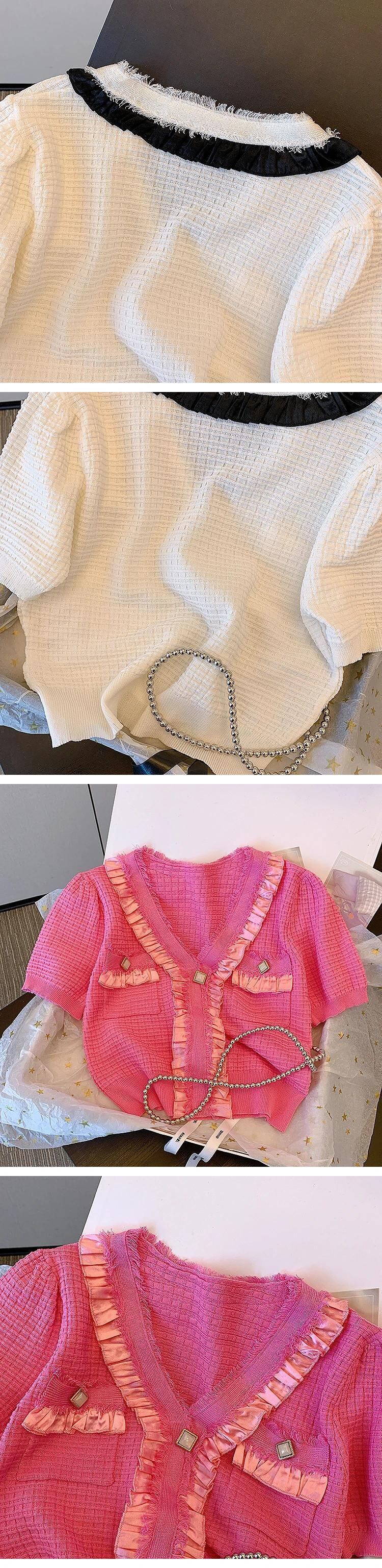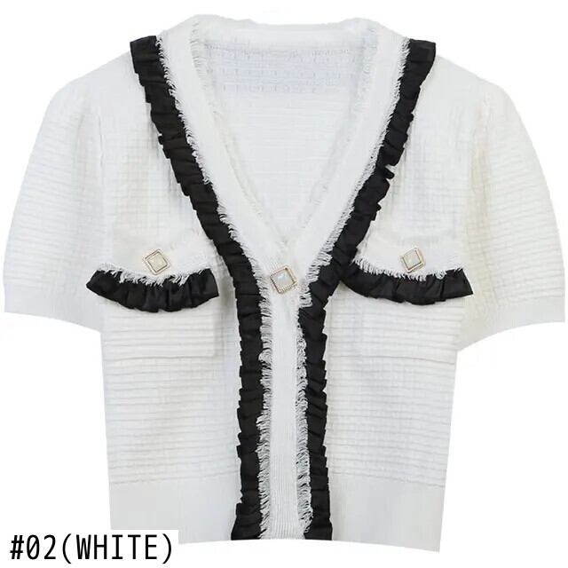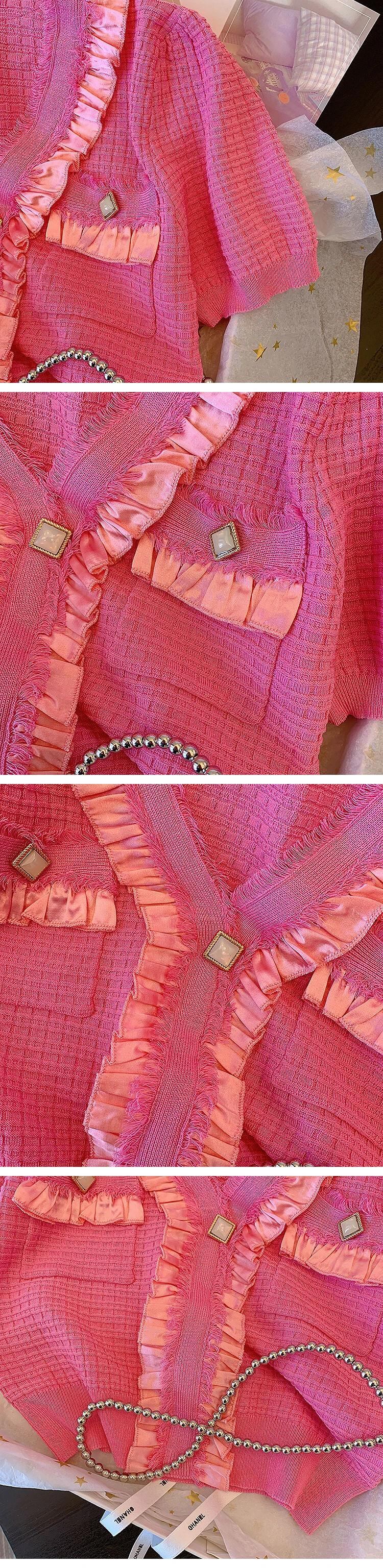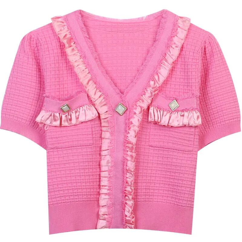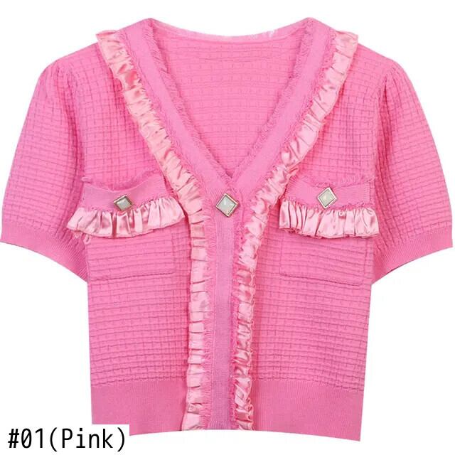 ホワイトピンク半袖夏香り良い甘い V ネックニットフリンジファートップス ショート ハーフスリーブ 大人ガーリー スウィート キュート カジュアル サマー 夏物 Vネック
