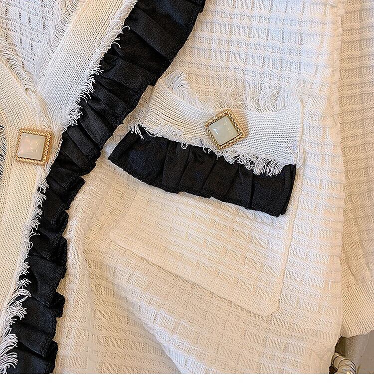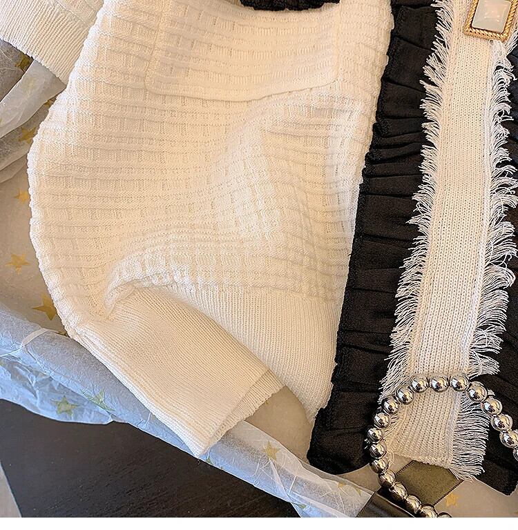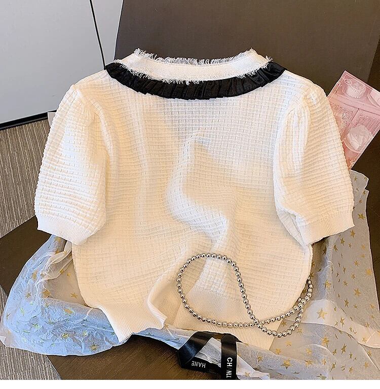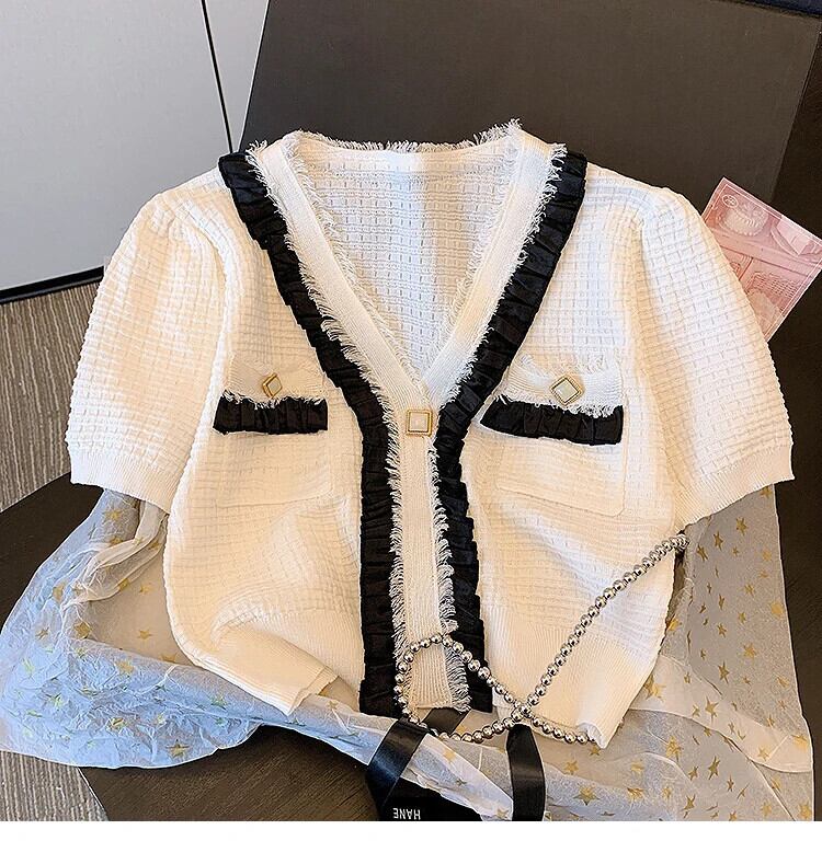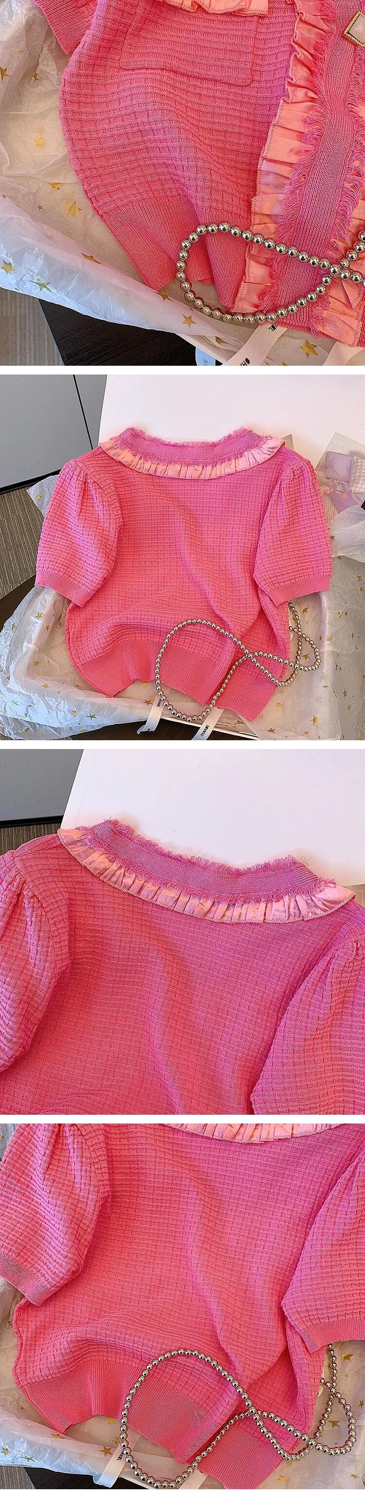 ホワイトピンク半袖夏香り良い甘い V ネックニットフリンジファートップス ショート ハーフスリーブ 大人ガーリー スウィート キュート カジュアル サマー 夏物 Vネック