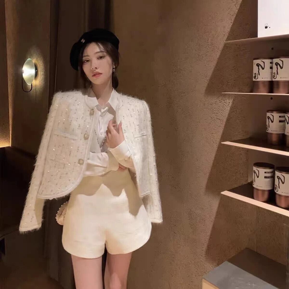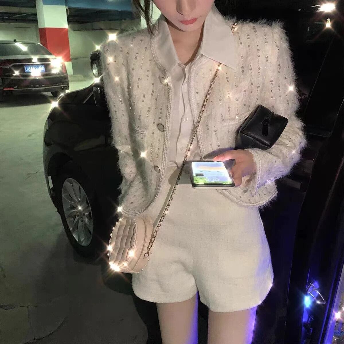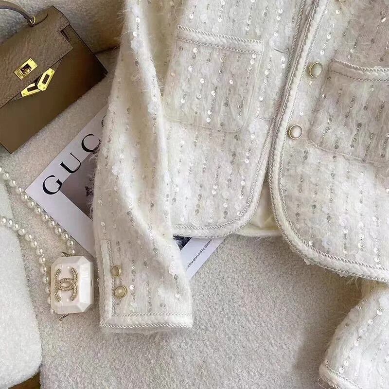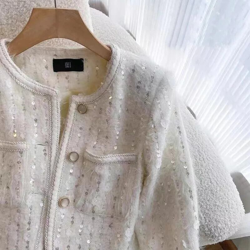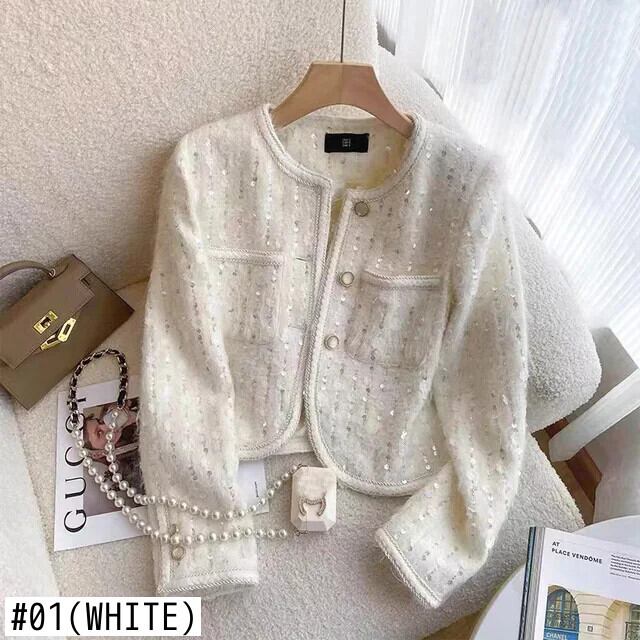 秋と冬白スパンコールショートコートスリム eign 重工業ジャケット ホワイト オータム 秋物 ウィンター 冬物