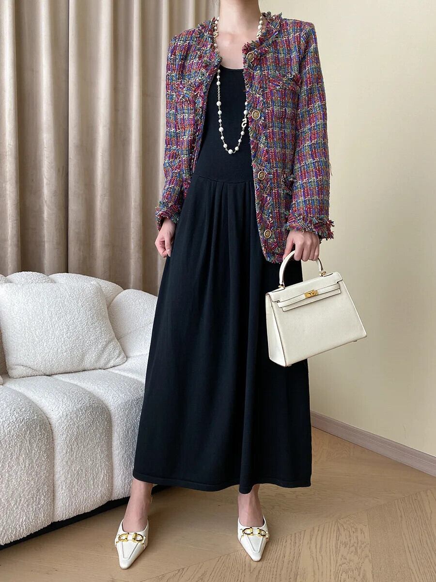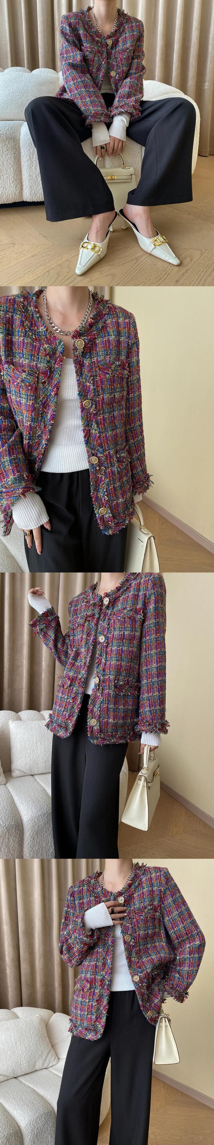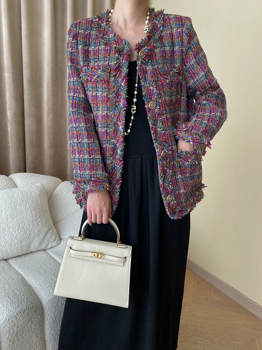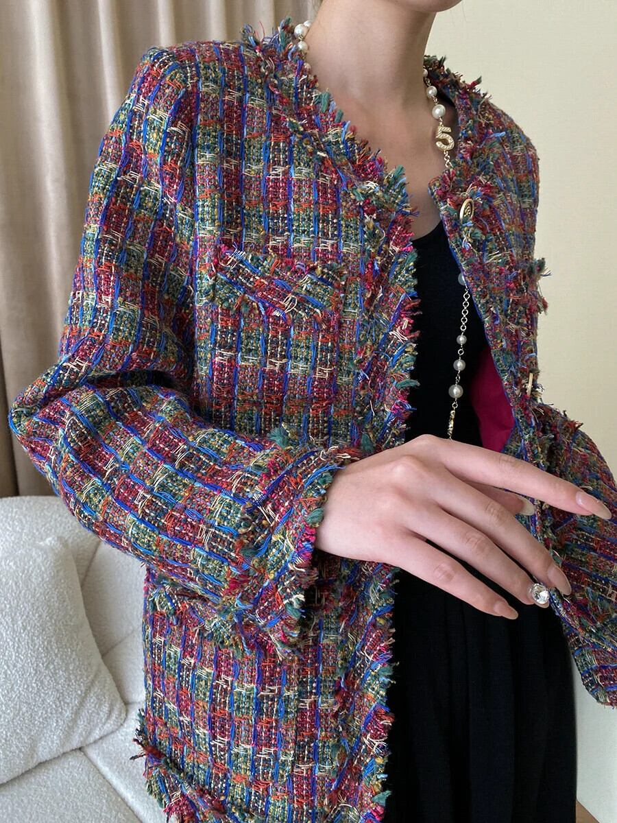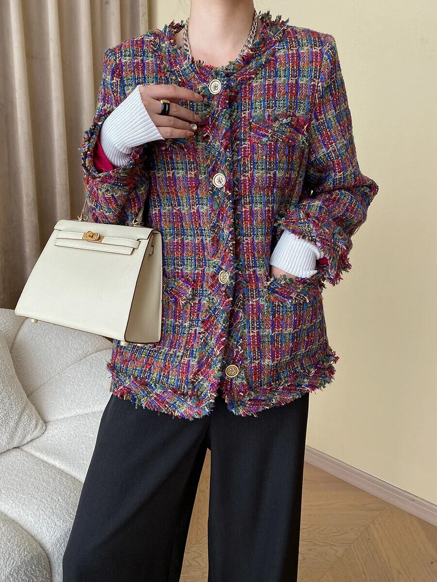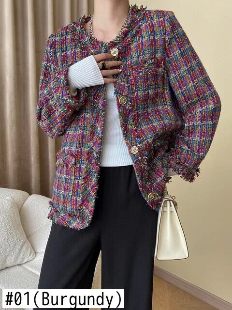秋冬赤いチェック柄ツイードコートテルズルーズオフィスフレグランスジャケット レッド ウィンター 冬物 会社 学校 通勤や通学にも