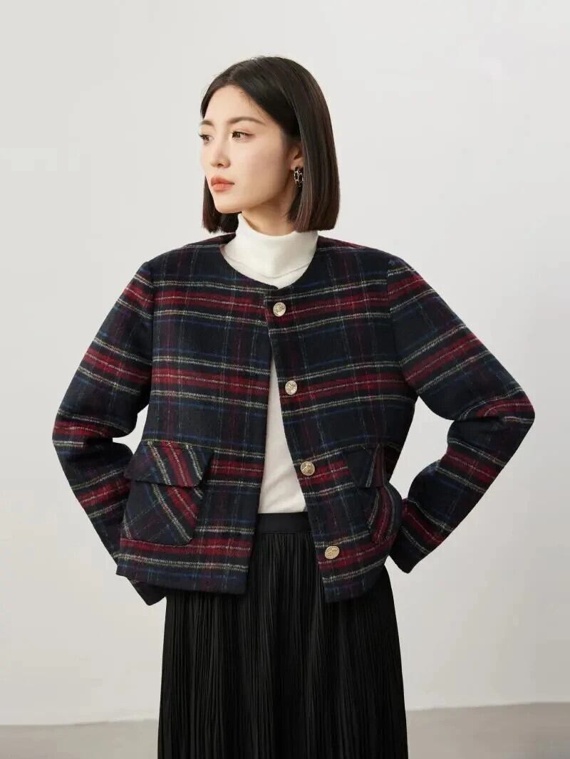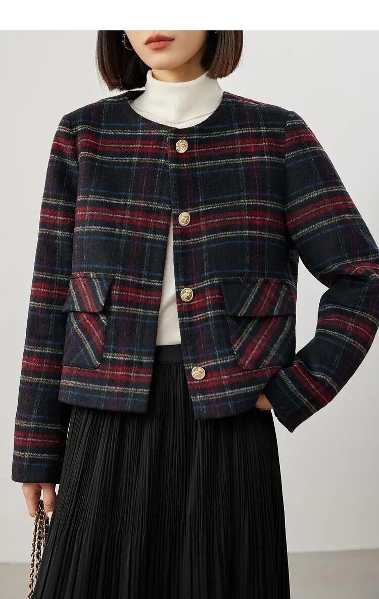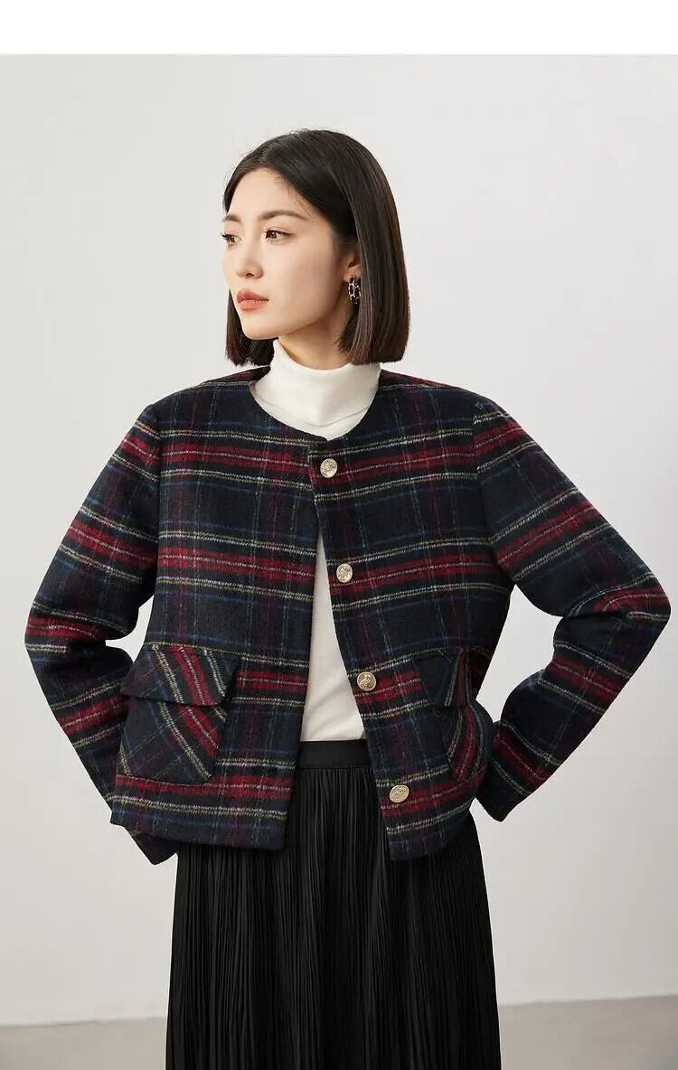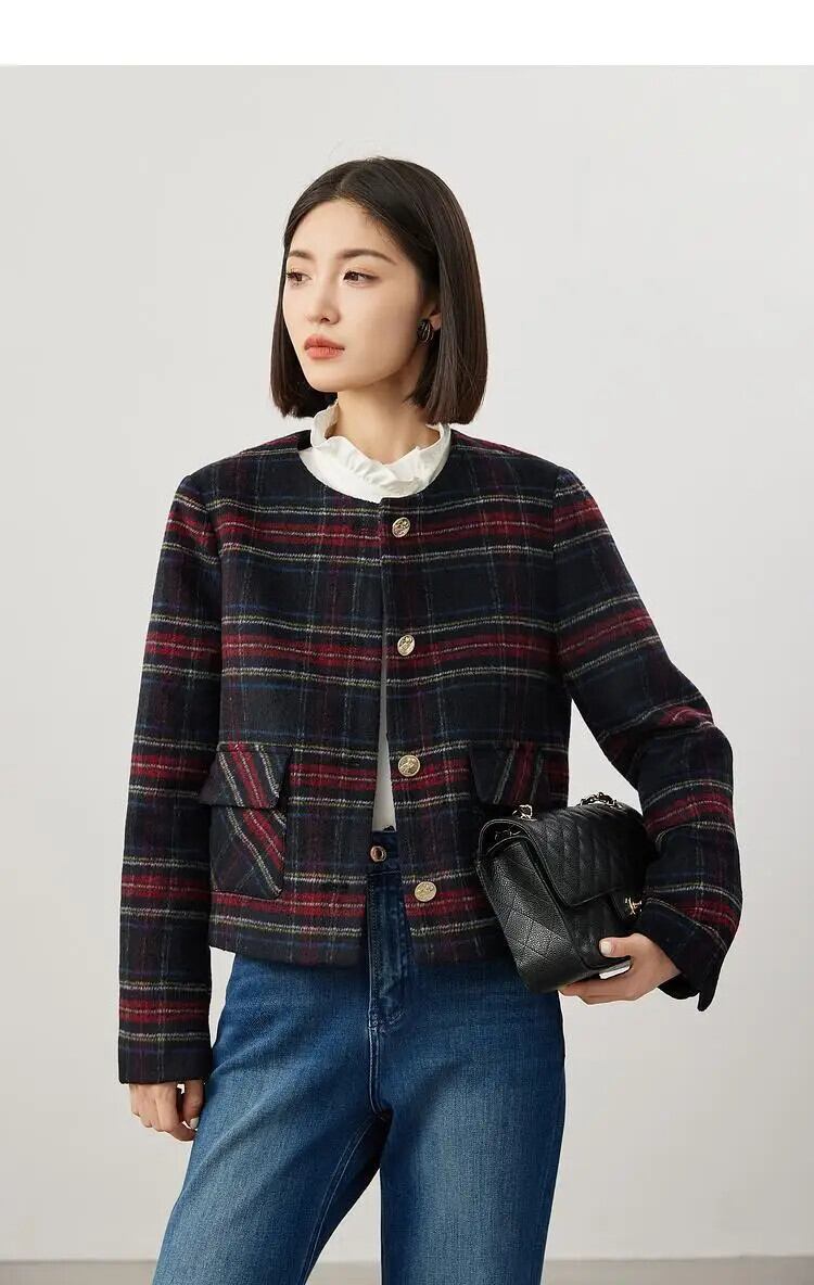 秋冬ラウンドネック多用途ショートレトロチェック柄ジャケット香り風ウールコート オータム 秋物 ウィンター 冬物 Oネック