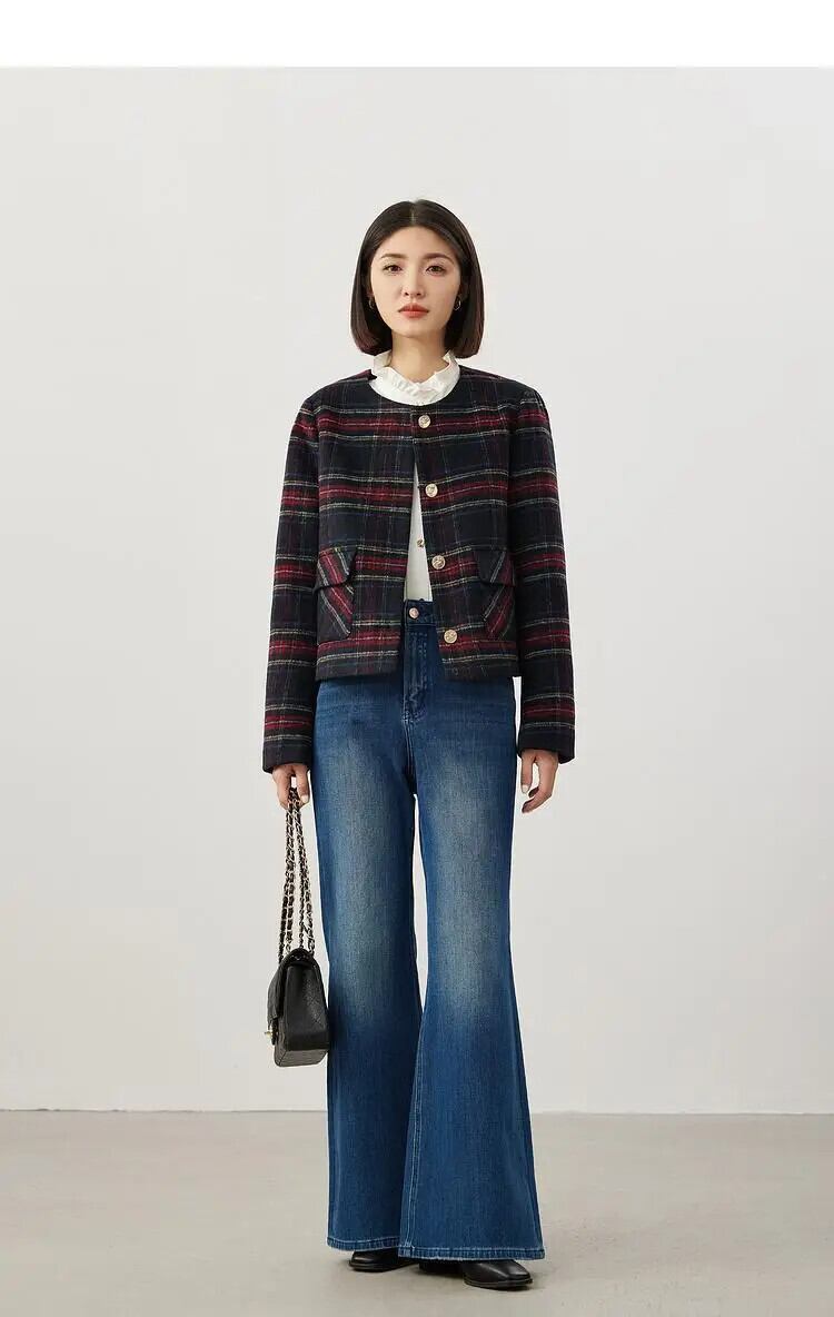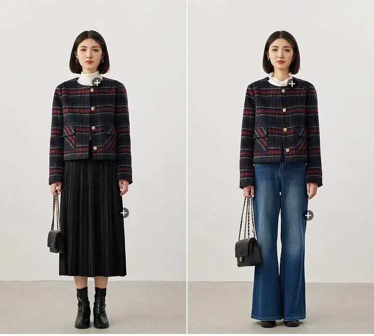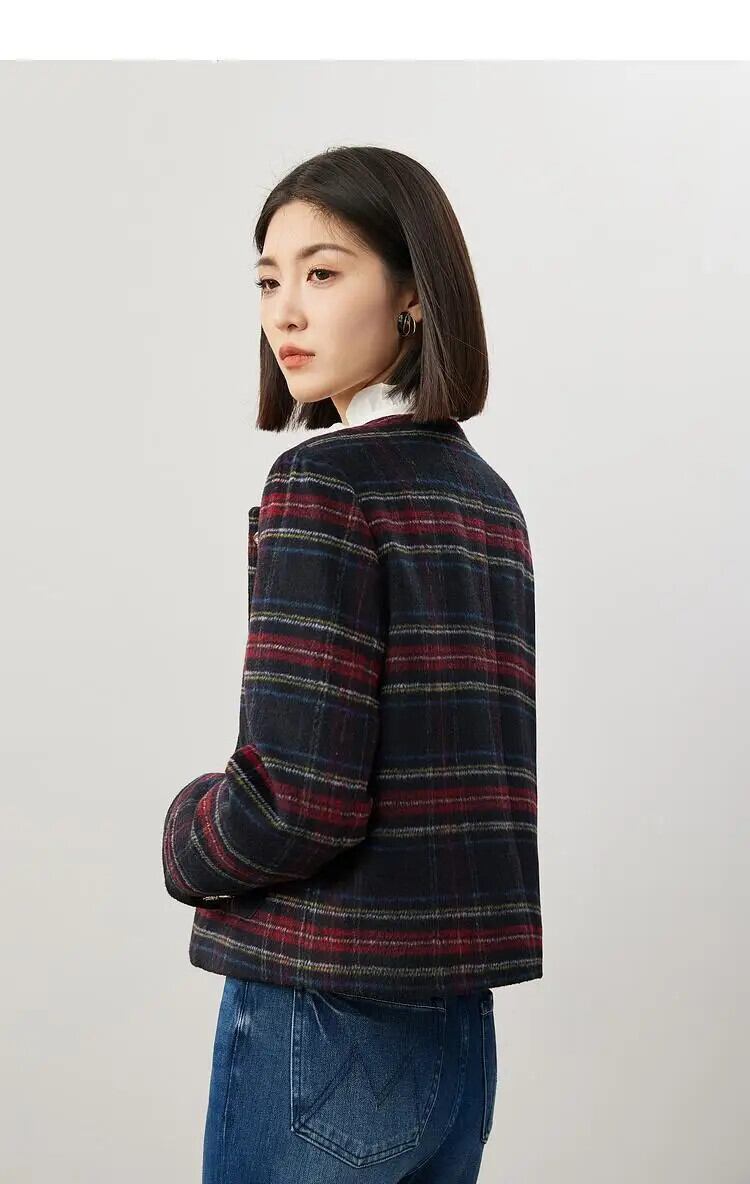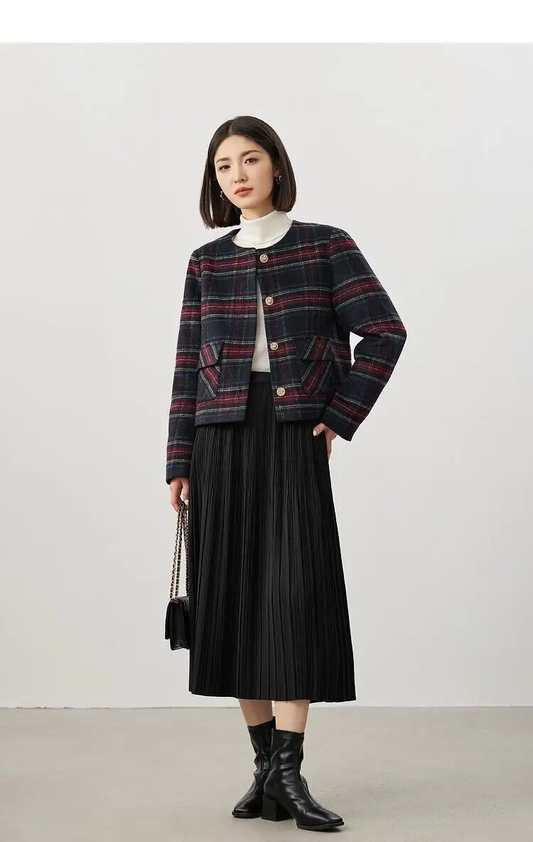 秋冬ラウンドネック多用途ショートレトロチェック柄ジャケット香り風ウールコート オータム 秋物 ウィンター 冬物 Oネック