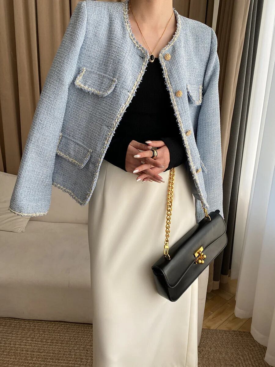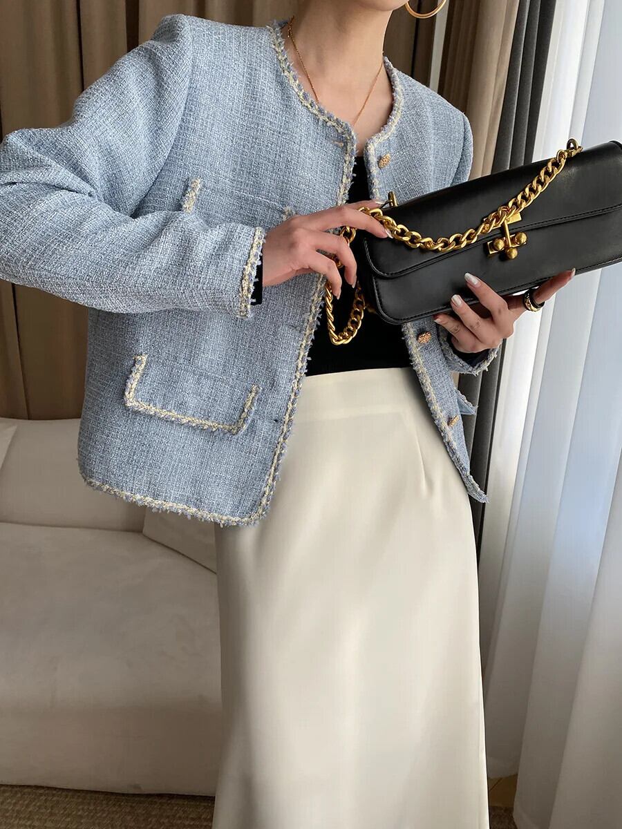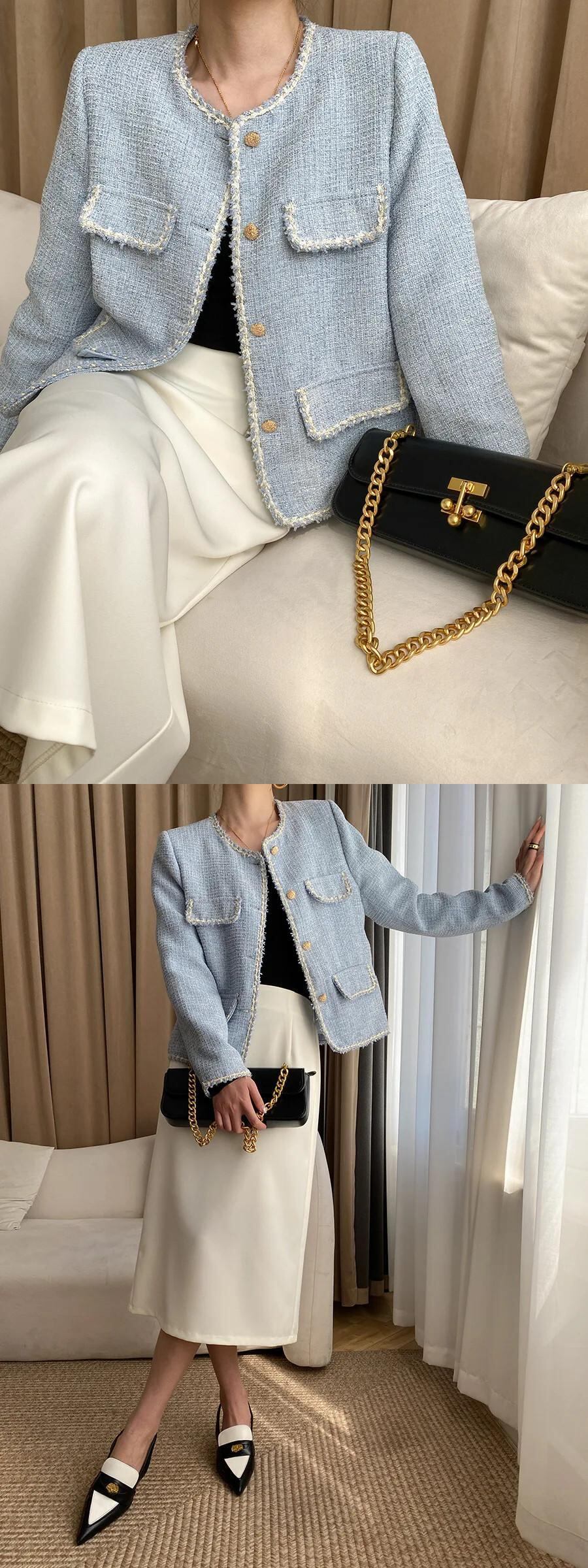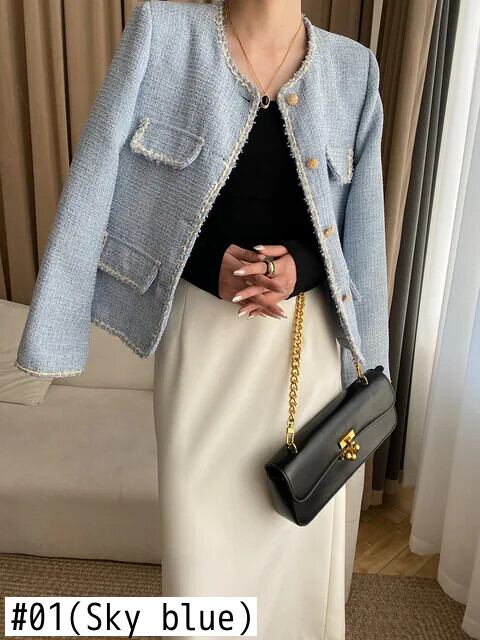 クロップドツイードジャケット春シックゴールドボタンショートコート長袖アウター ロング スプリング 春物