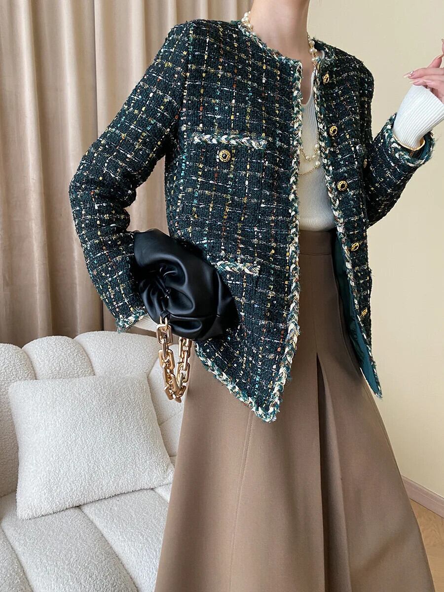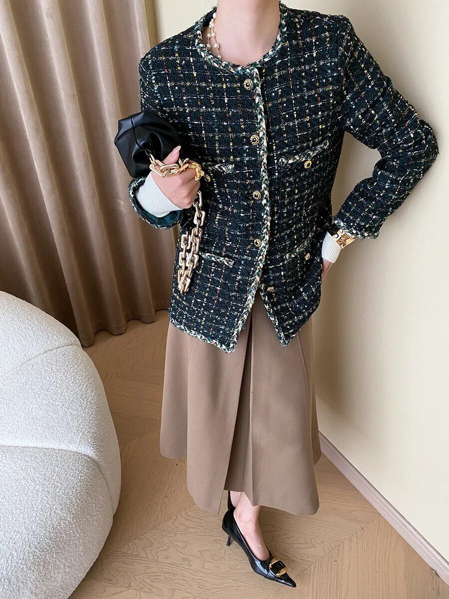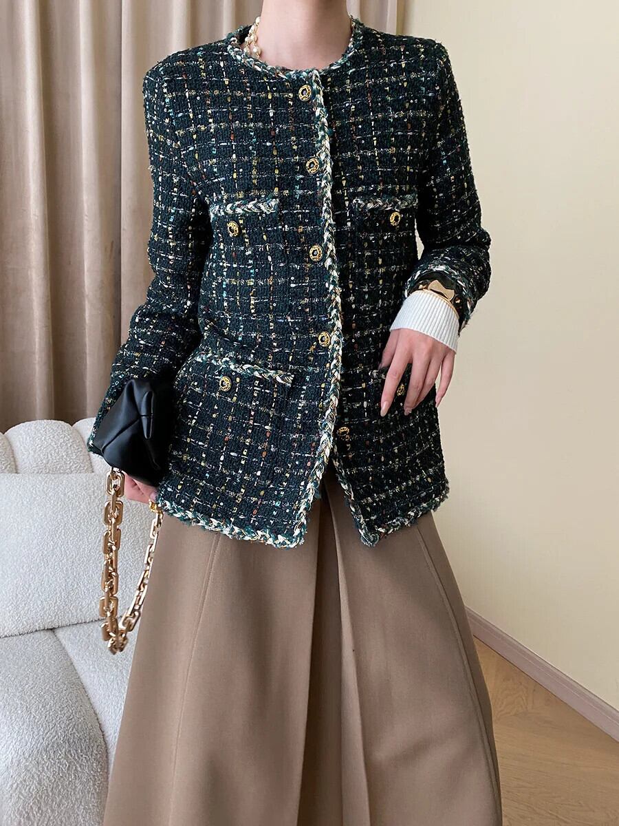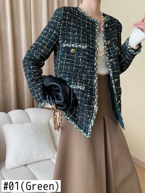秋冬レディースハンドメイドミックスカラーグリーンツイード香りコートジャケット オータム 秋物 ウィンター 冬物