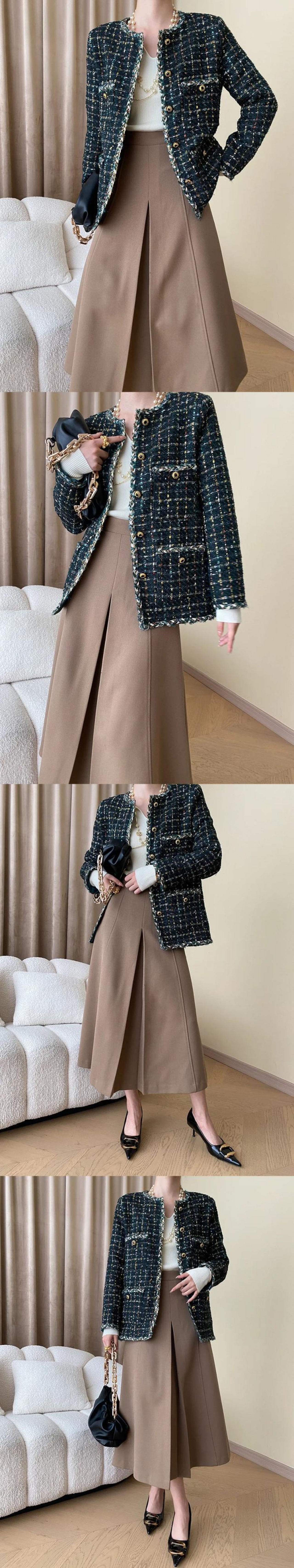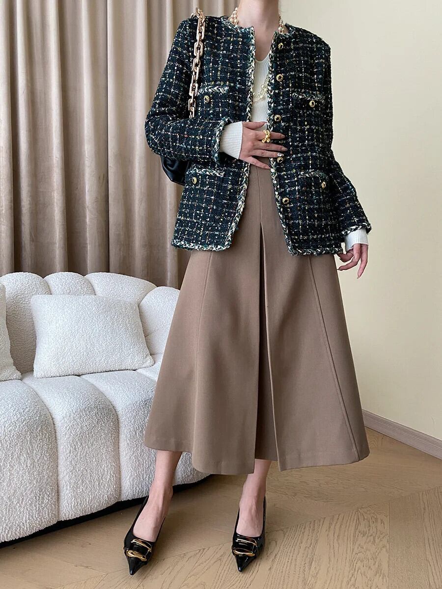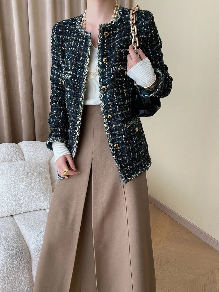 秋冬レディースハンドメイドミックスカラーグリーンツイード香りコートジャケット オータム 秋物 ウィンター 冬物