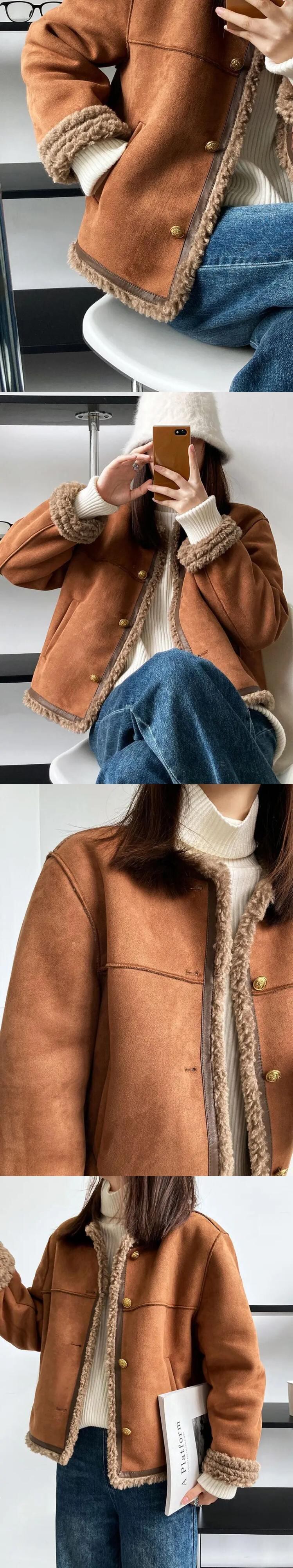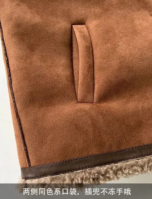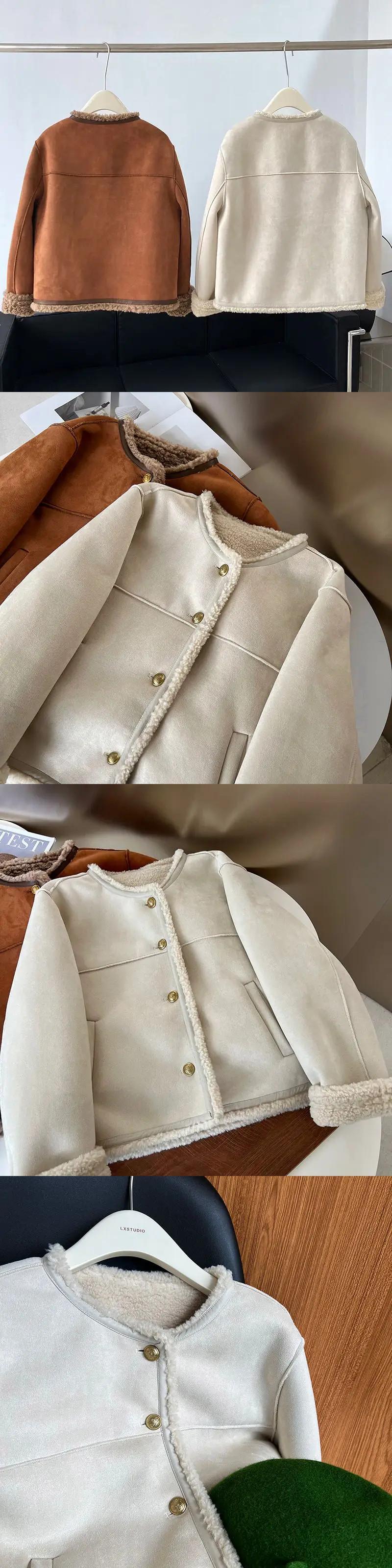 ラウンドネックオートバイ暖かさジャケット秋冬ラム鹿毛皮トップトレンドコート オータム 秋物 ウィンター 冬物 Oネック