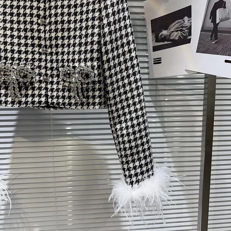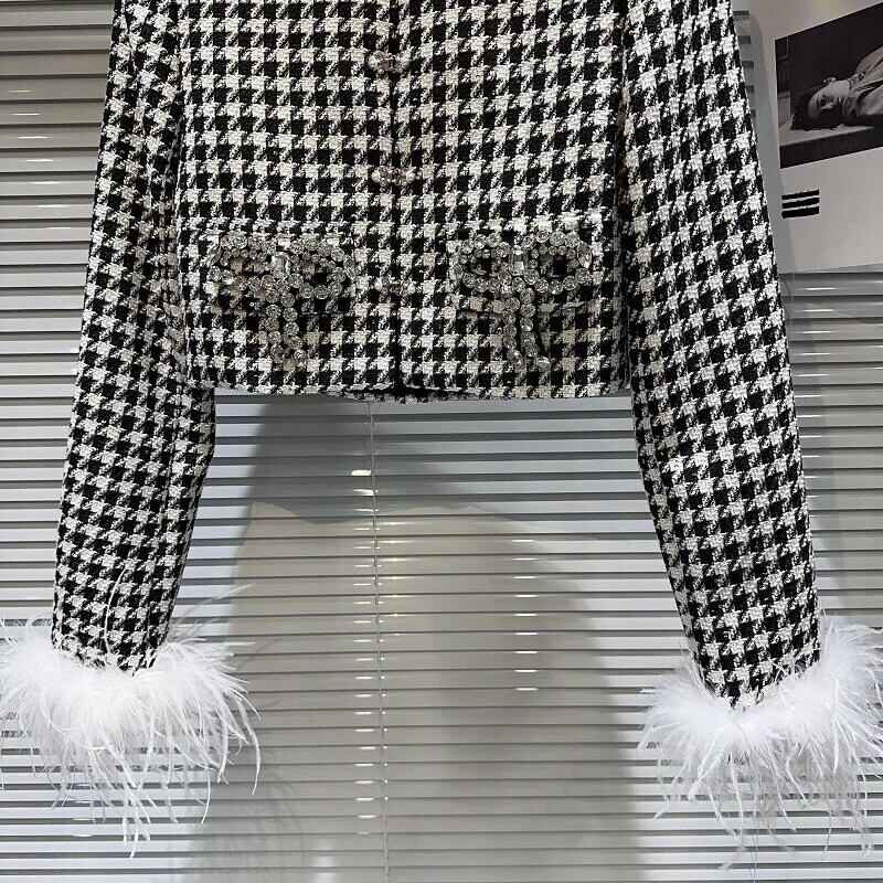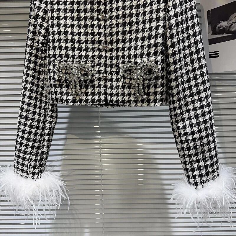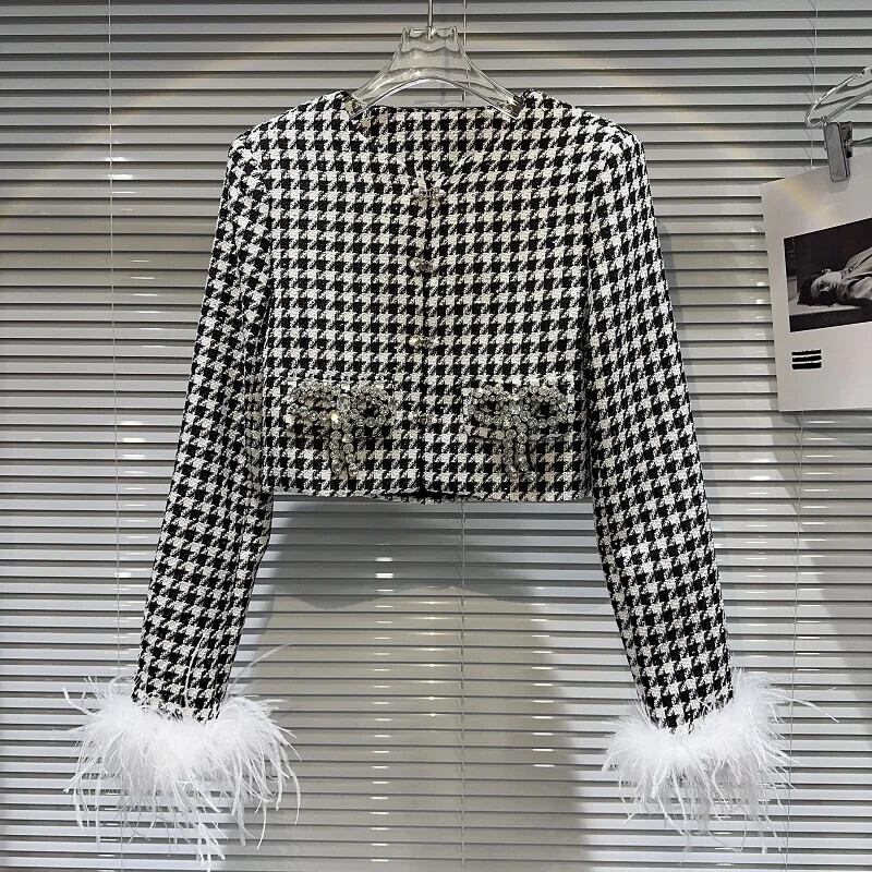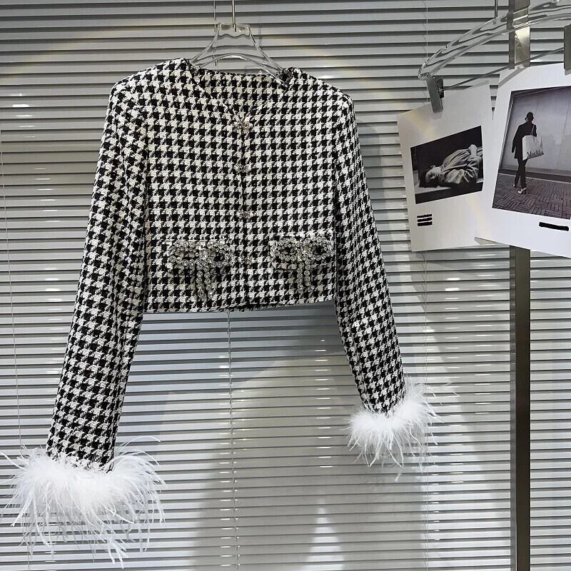 秋香りダチョウ毛袖ラインストーンボウノットチェッカーツイードコート滑走路ジャケット Chaquetas リボン オータム 秋物