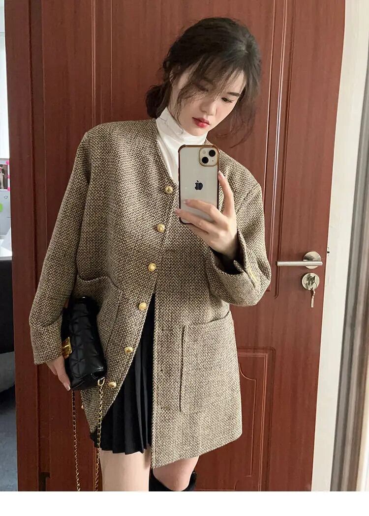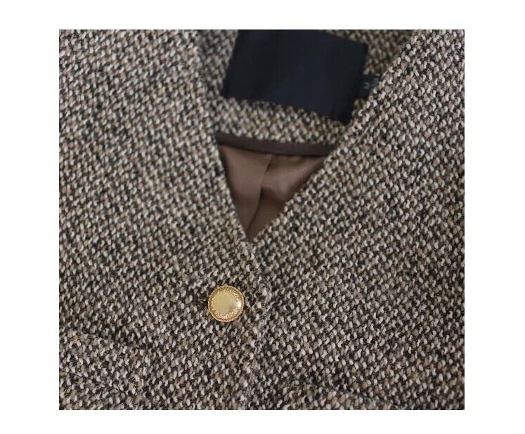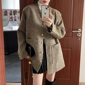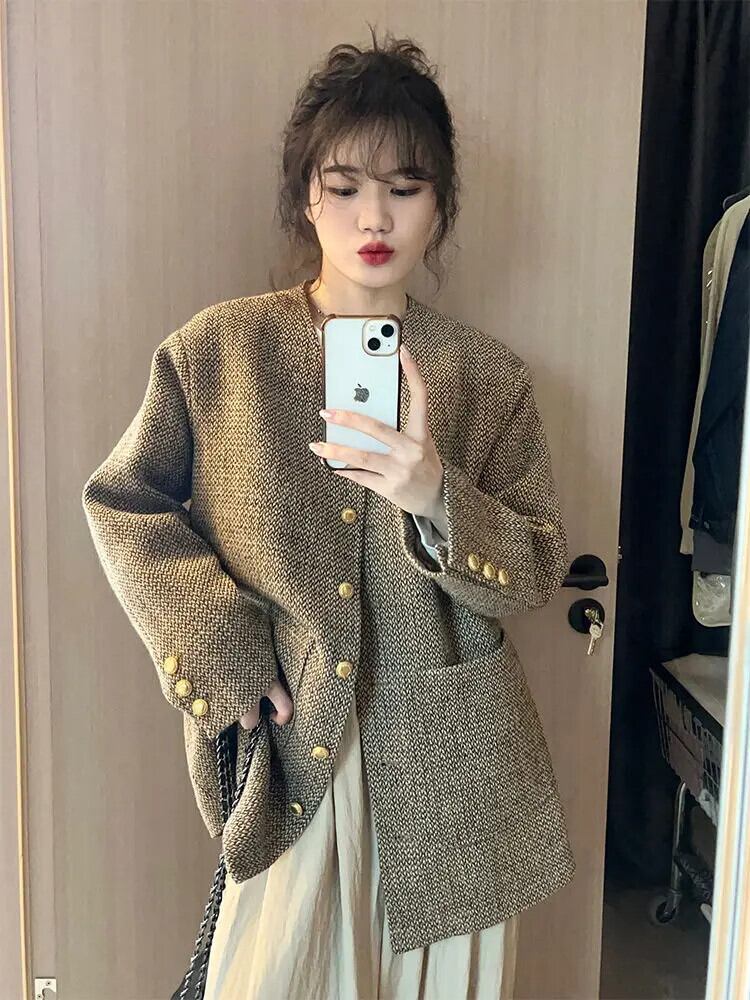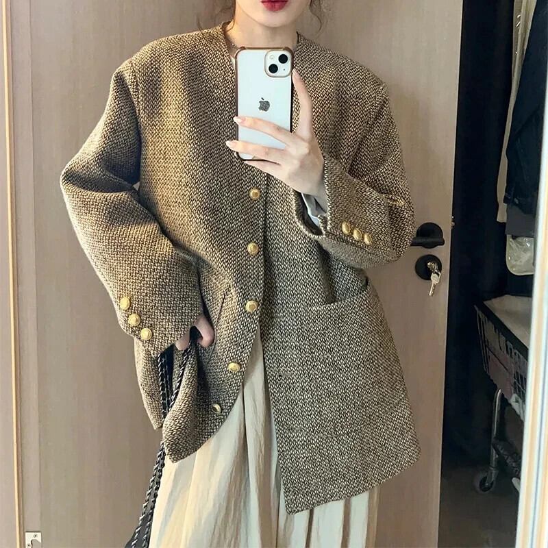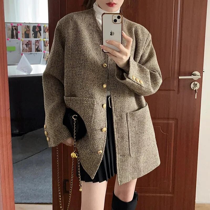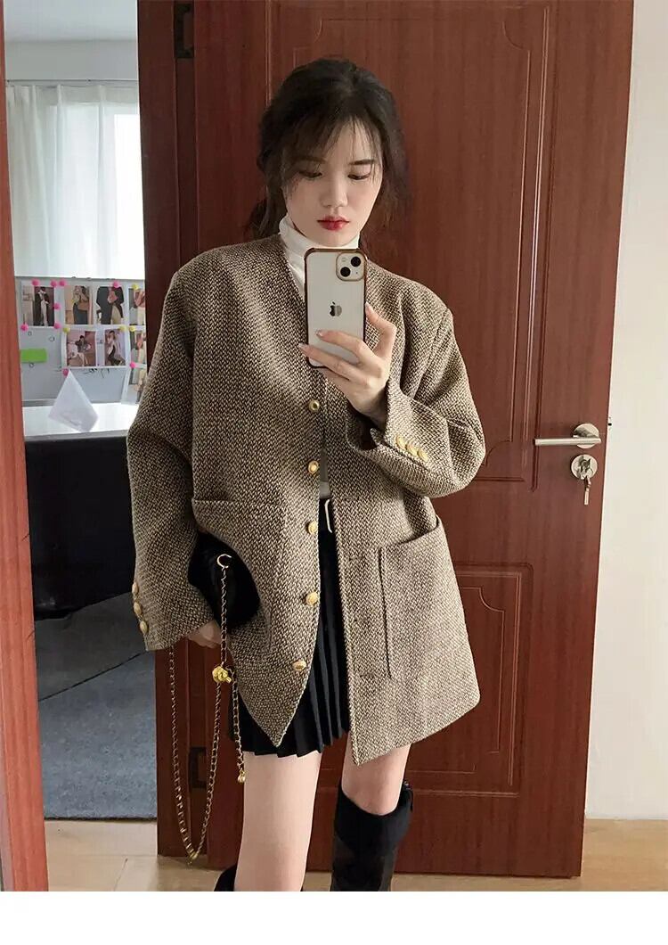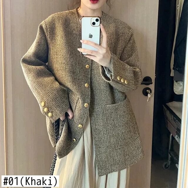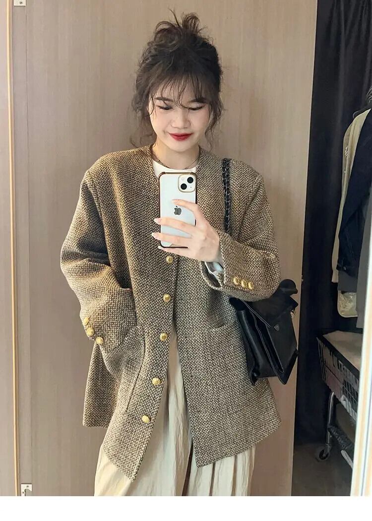 レディースレトロウール春秋VネックツイードコートルーズロングVネックジャケット スプリング 春物 オータム 秋物