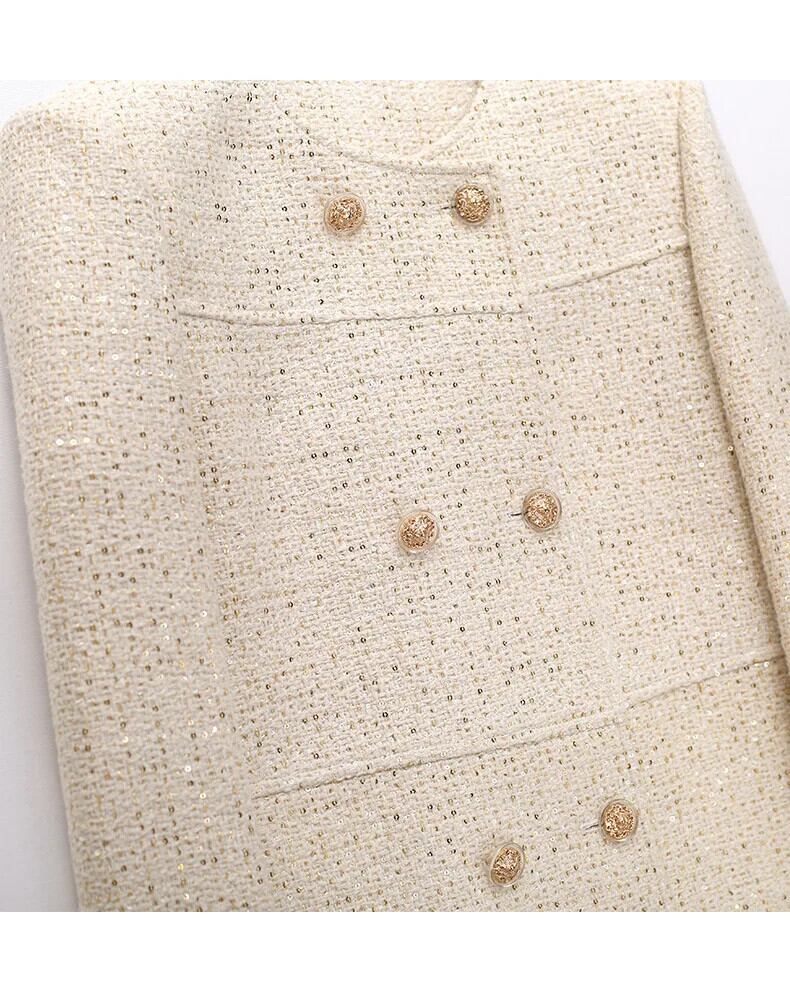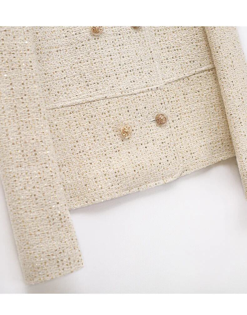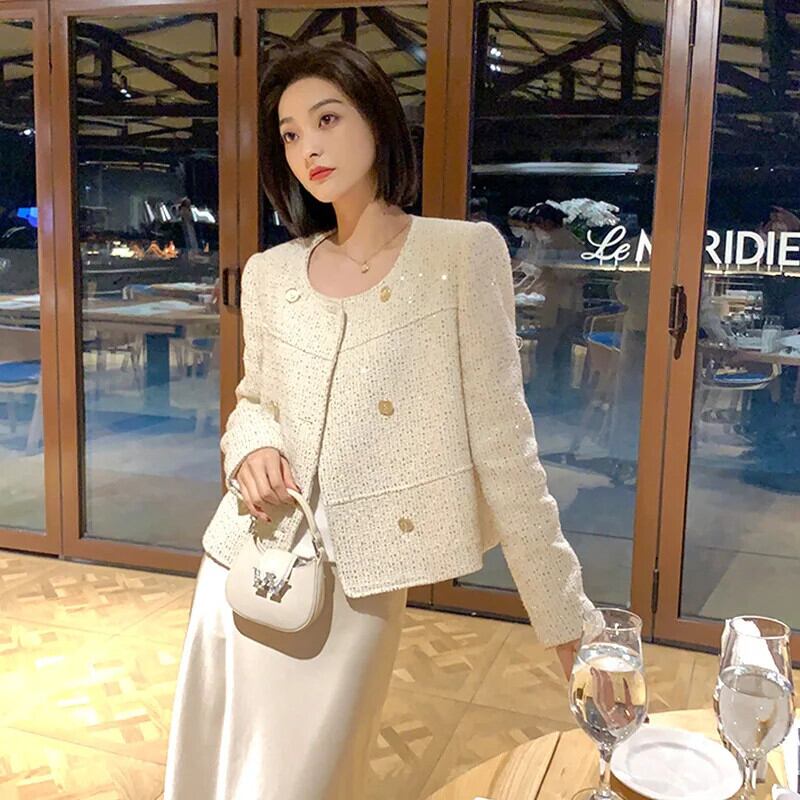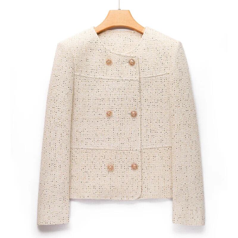 羊ウール光沢ある絶妙春香りコートダブルブレストオフホワイトラウンドネックジャケット スプリング 春物 Oネック シルク