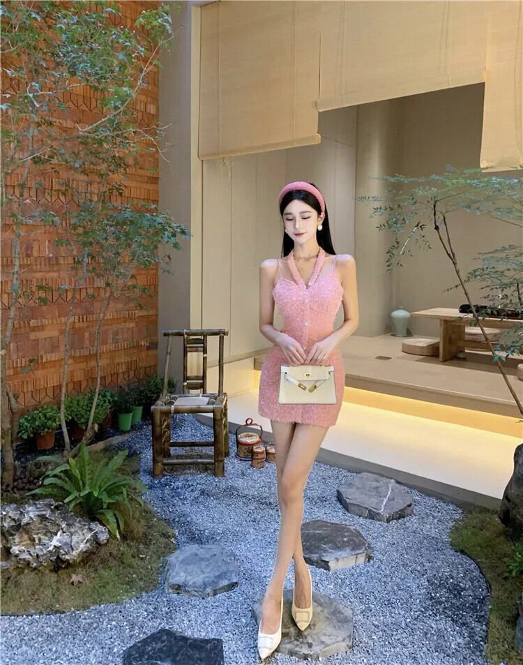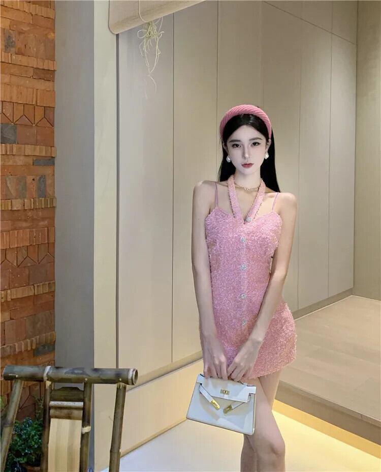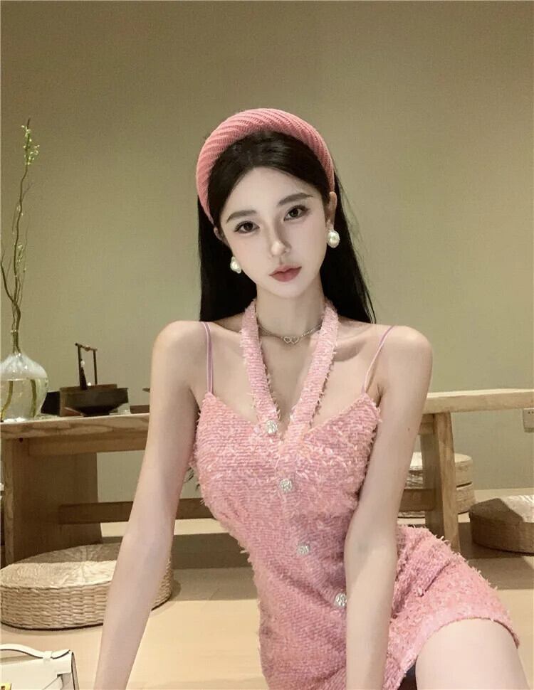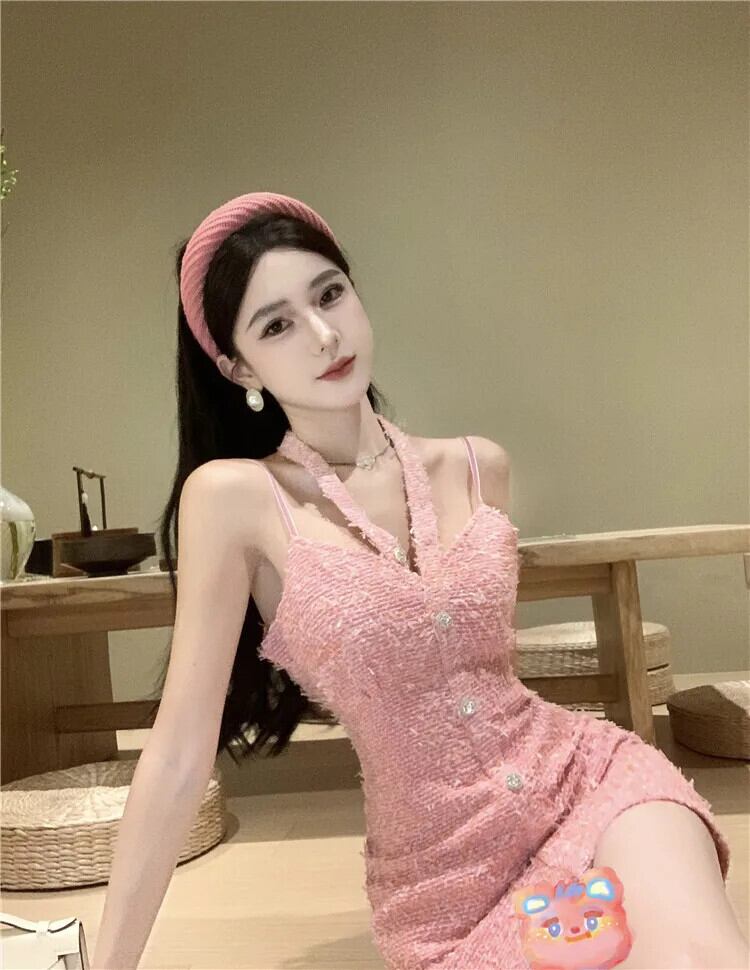 夏シングルブレスト気質スリムフィットウエストセクシーハンギングネックノースリーブドレス Vestidos サマー 夏物