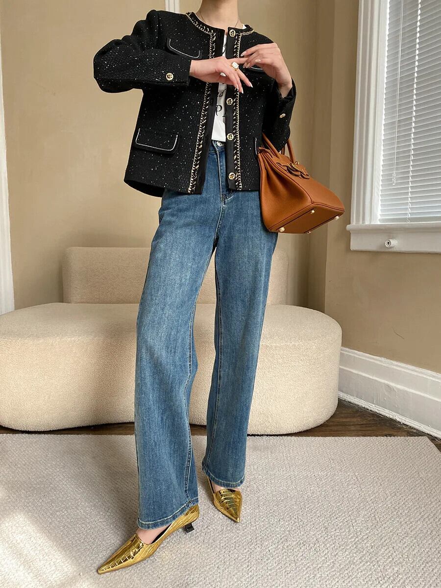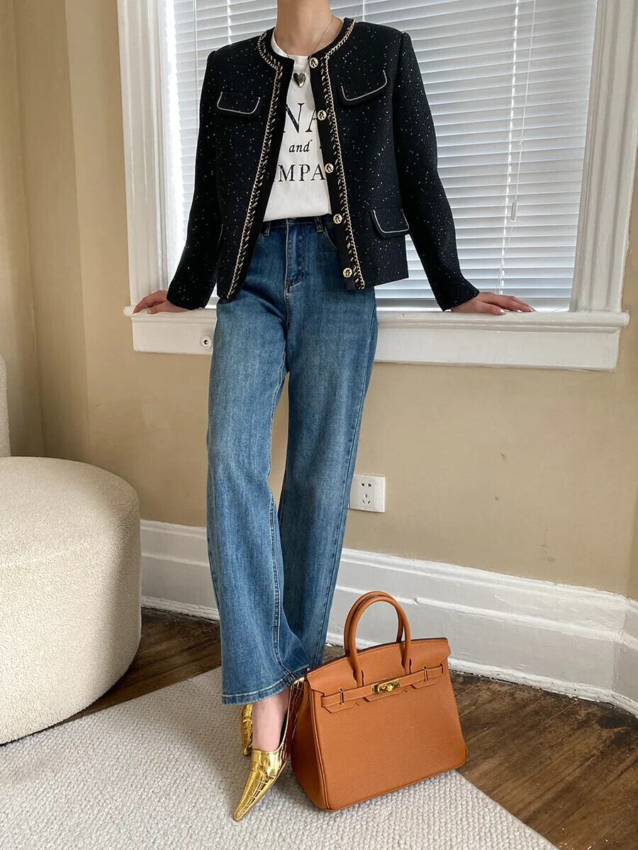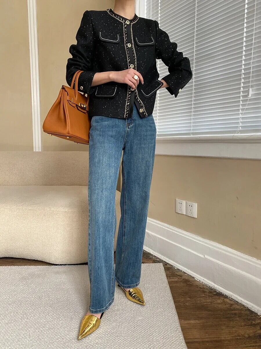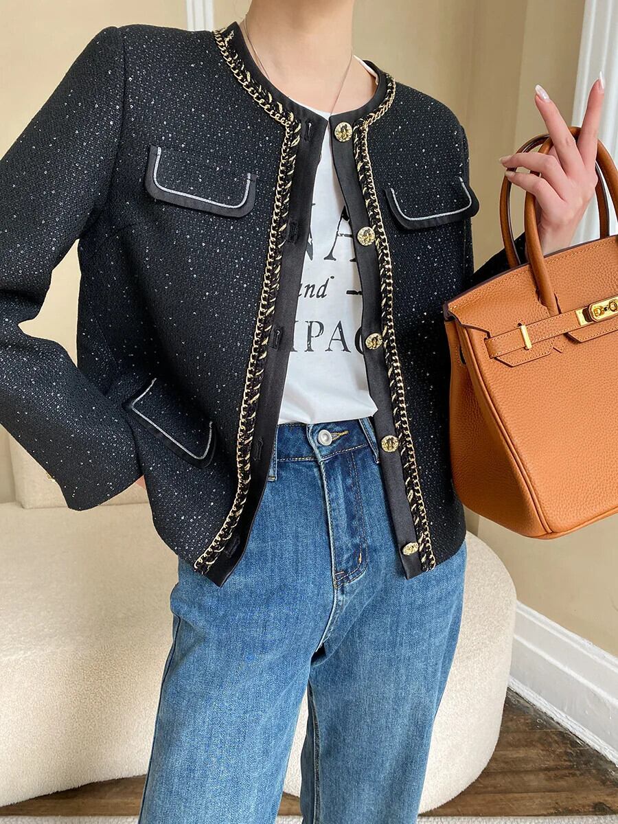 シングルボタンツイードジャケットコート長袖ブラックスパンコール生き抜く ロング